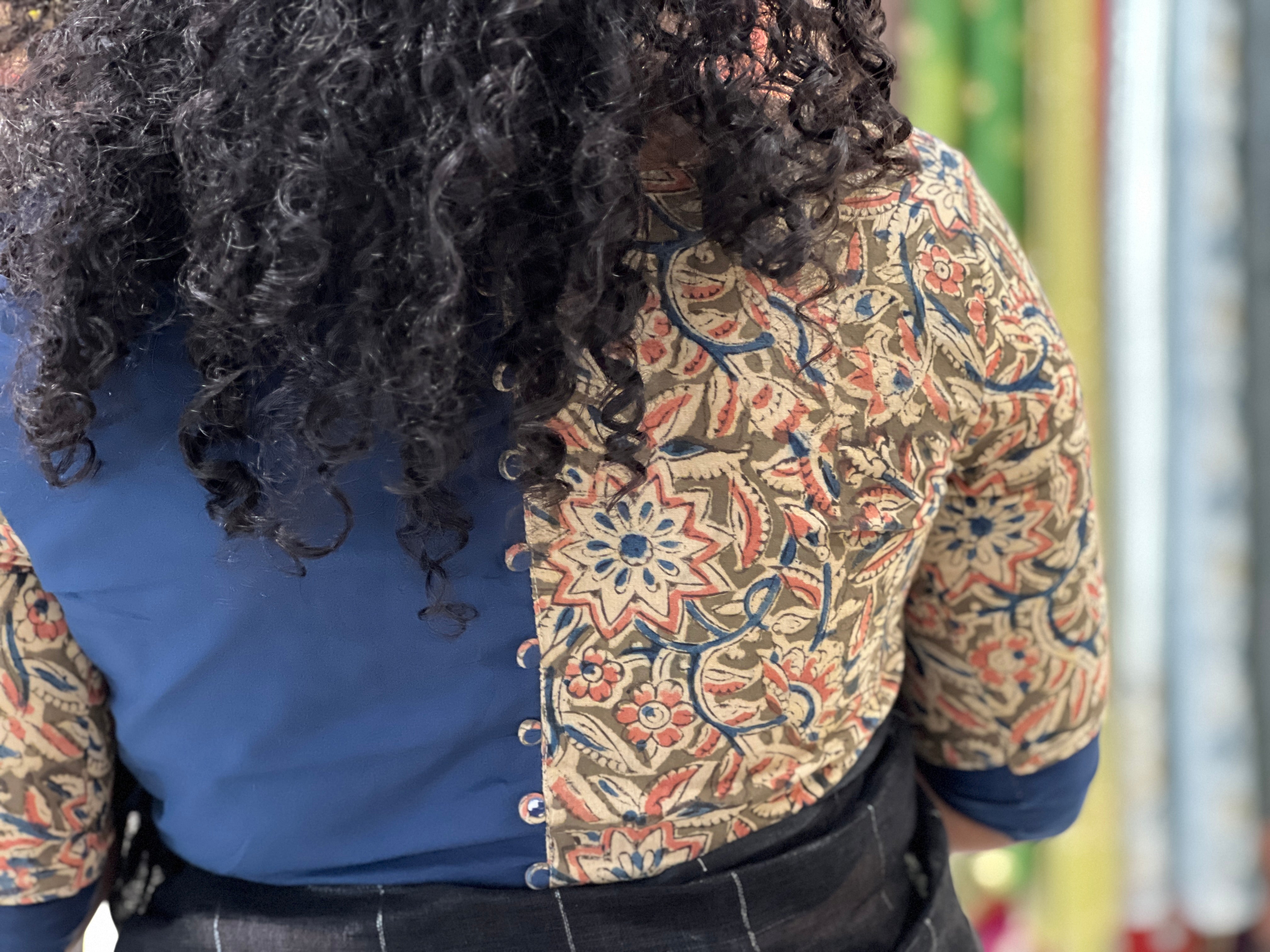 - Style: Kalamkari Printed Patch Detailing, Back Button Detailing, Princess Cut, Padded, Lining