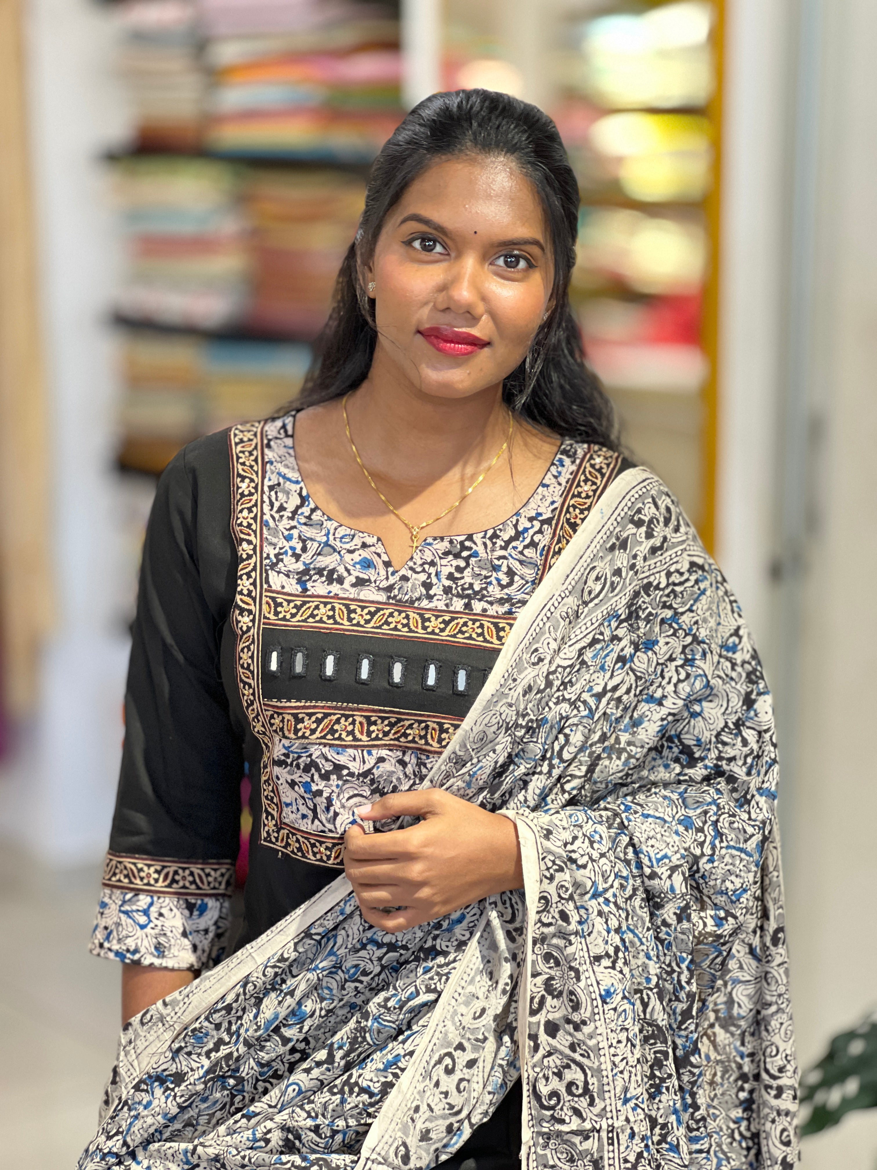 - Style: Kalamkari Printed Patch Detailing On Yoke With Mirror Detailing, Slitted, Patch On Sleeves