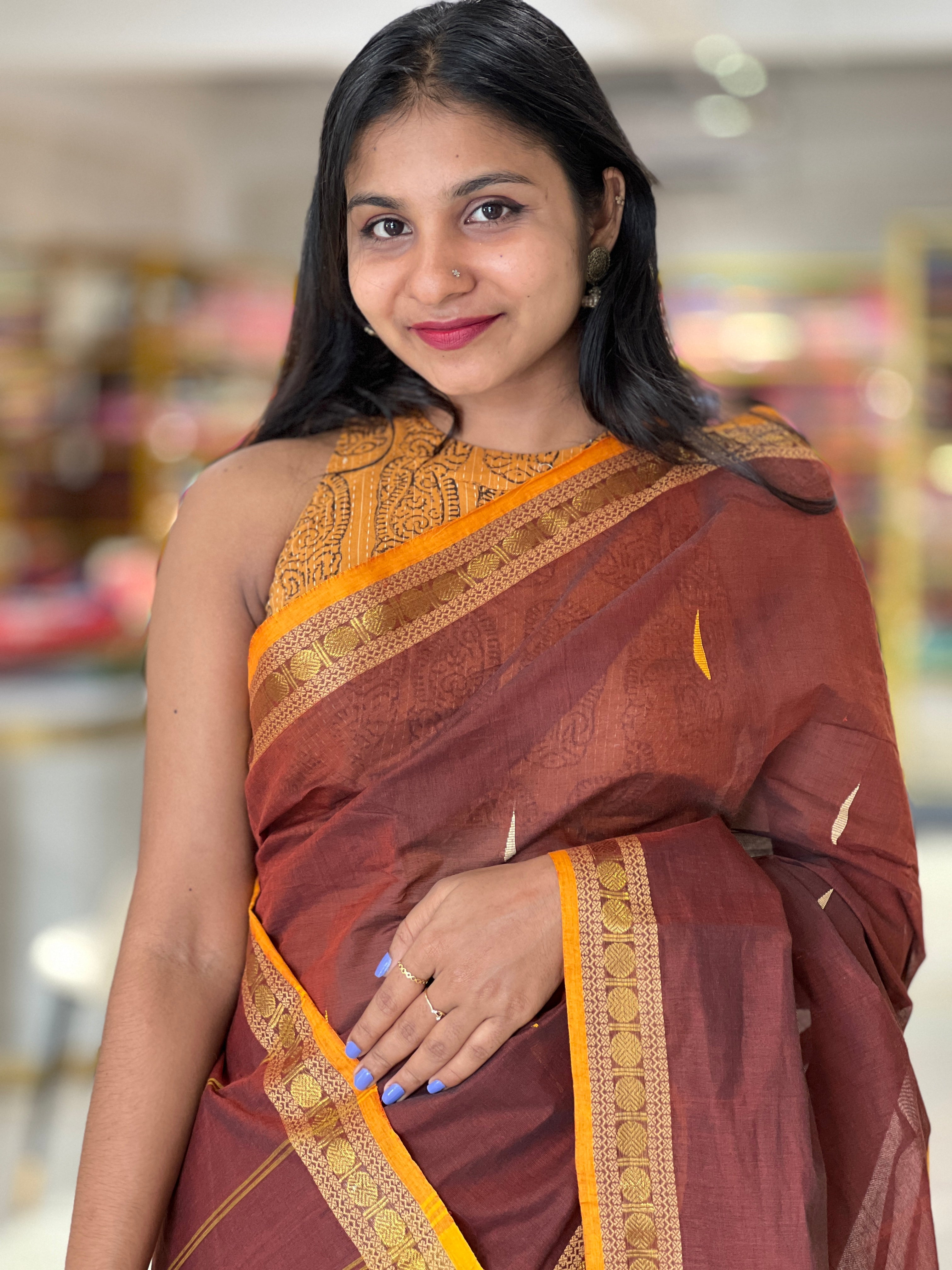 - Style: Scattered Motifs with Traditional Chakra Border, Line Weaved Pallu