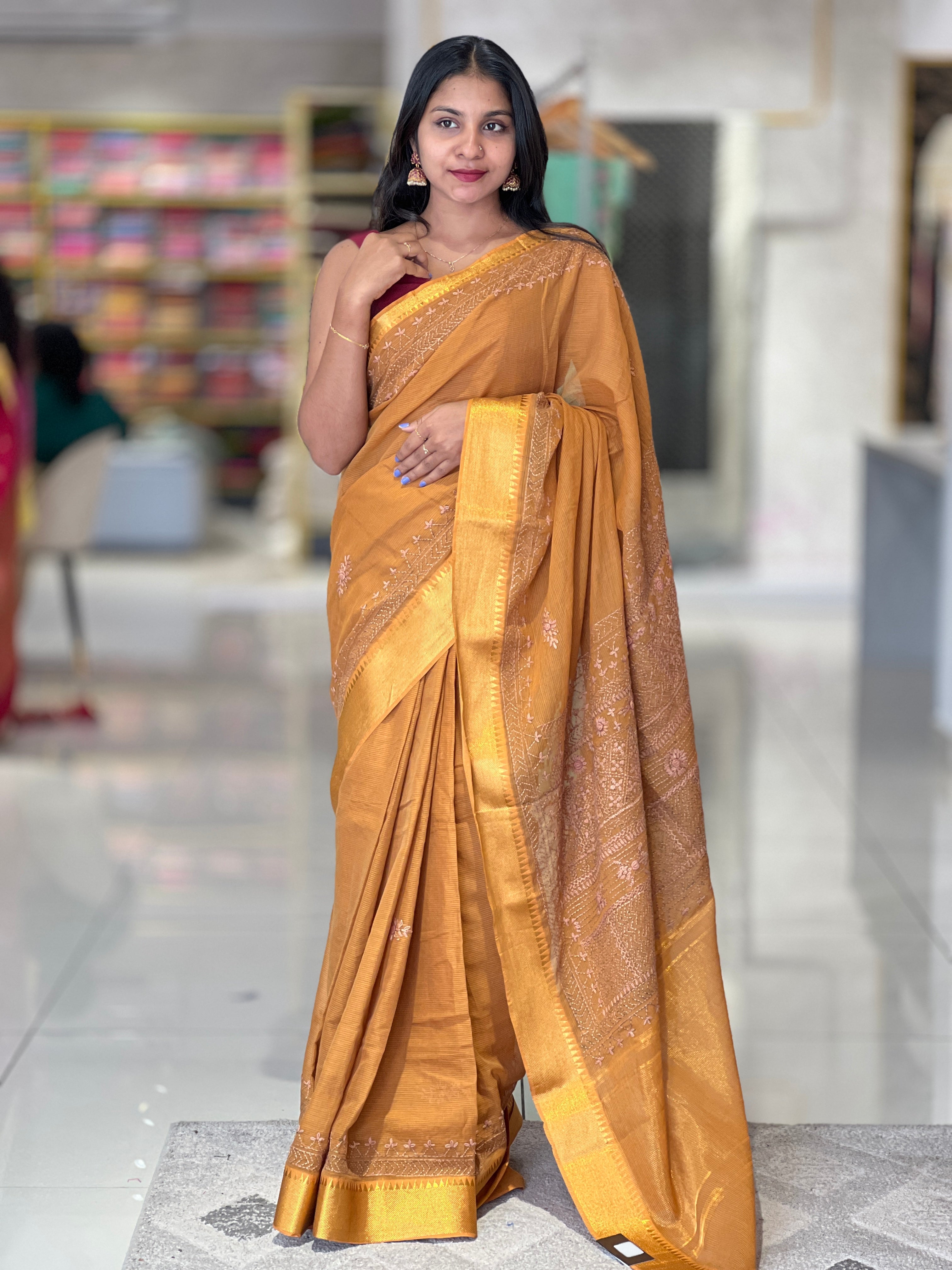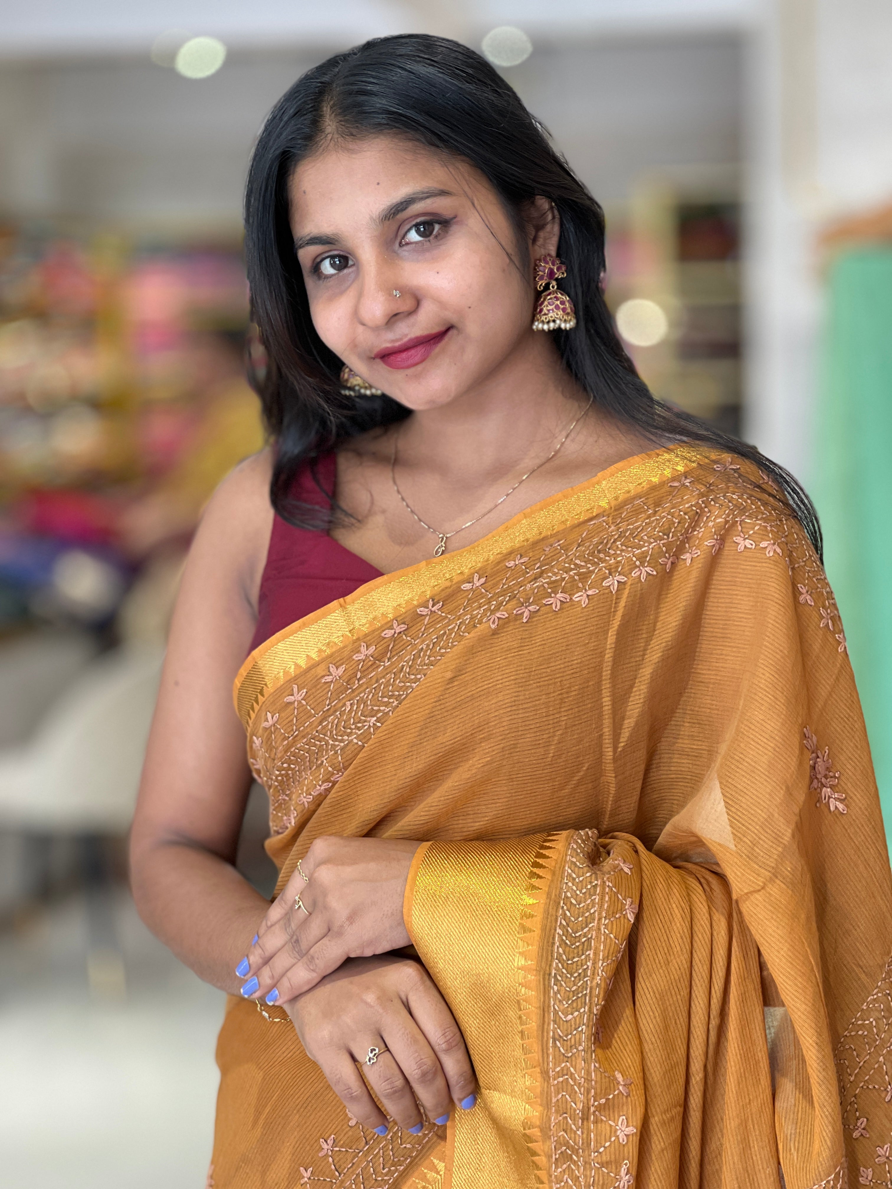 - Style: Temple Borders, Line Weaved Pattern, Hand Kantha Embroidery, Zari Woven Pallu