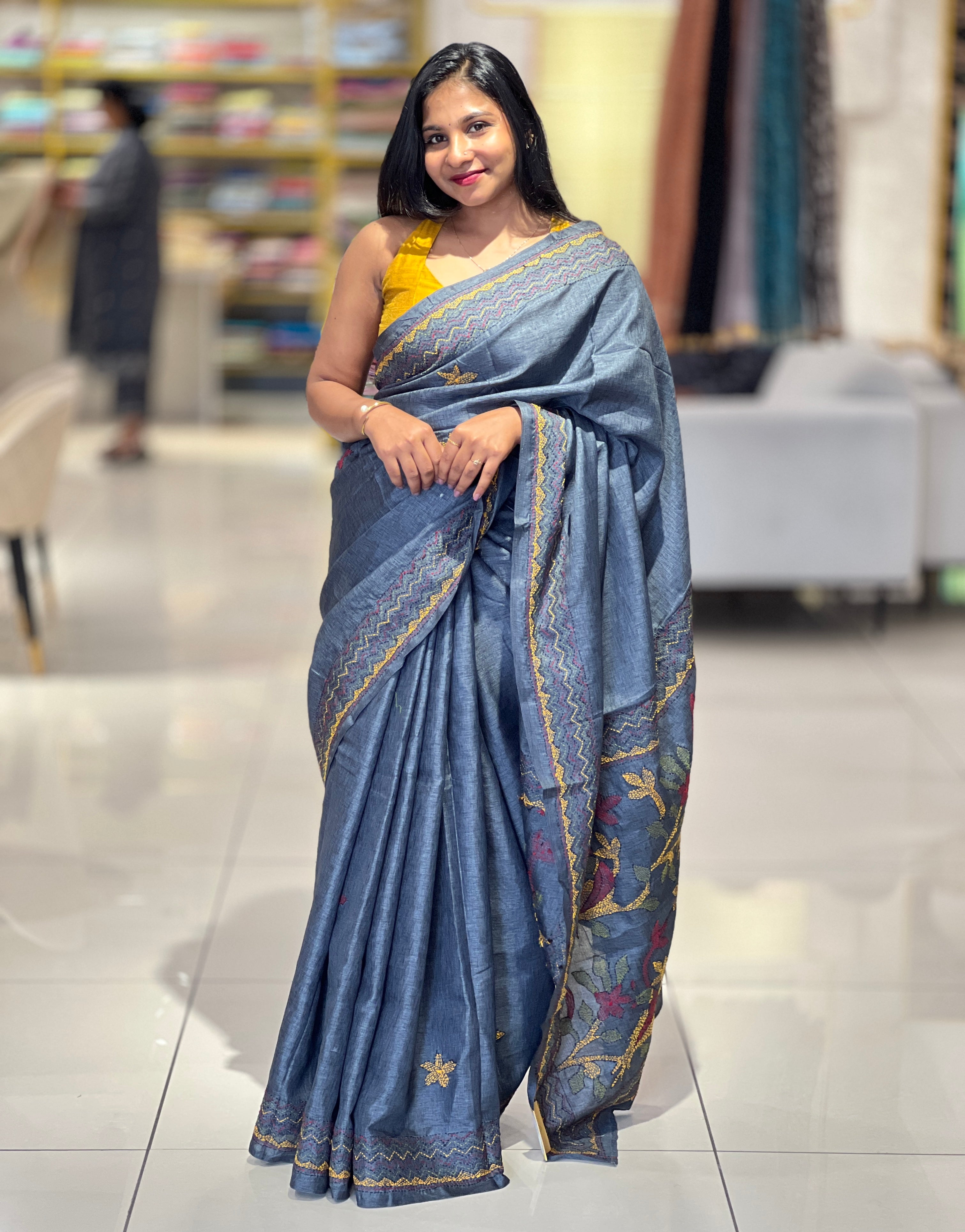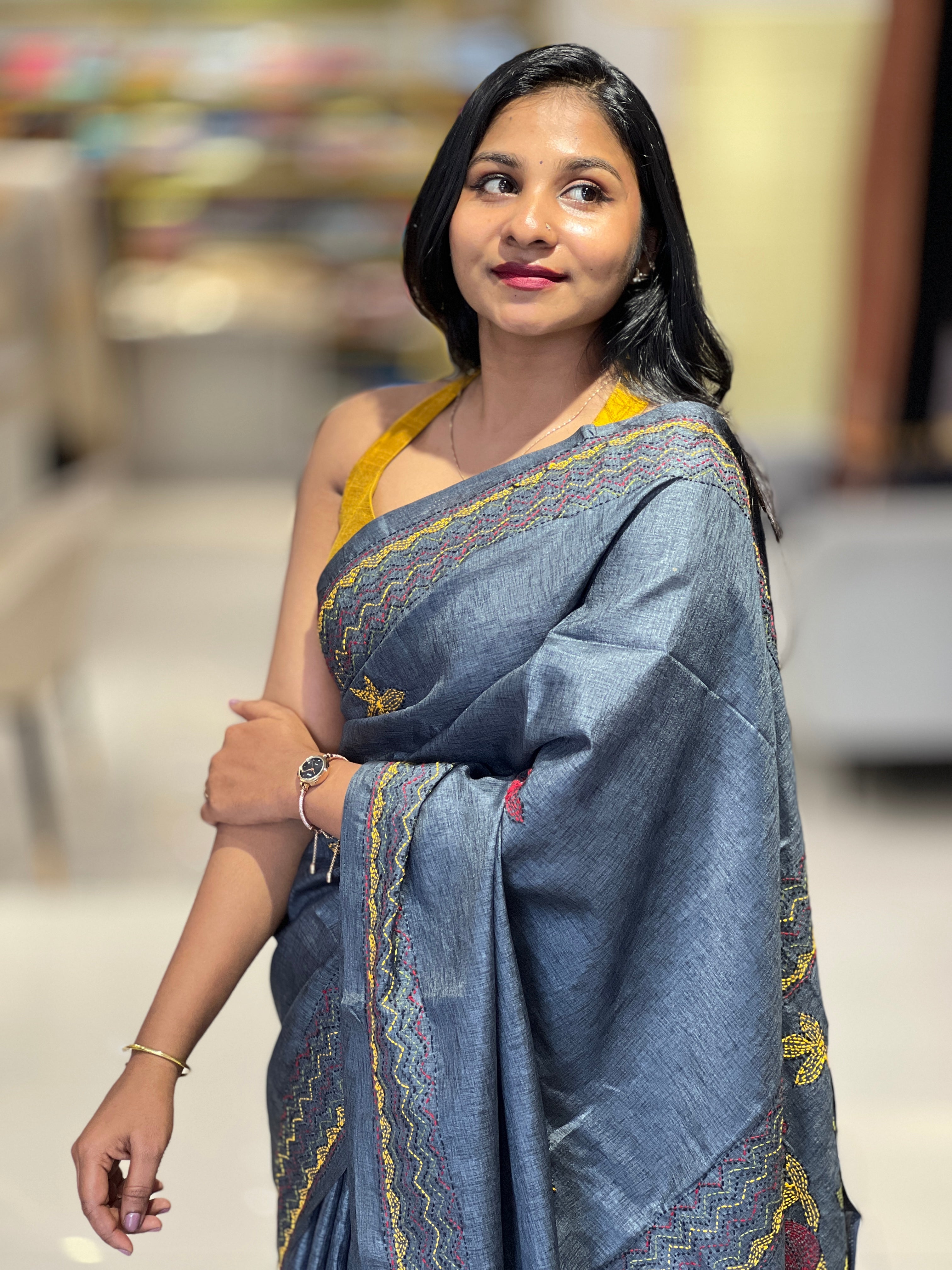 - Style: Kantha Weaved Floral Pattern, Multi Colour Thread Embroidered Pallu, Zig Zag Border Detailing
