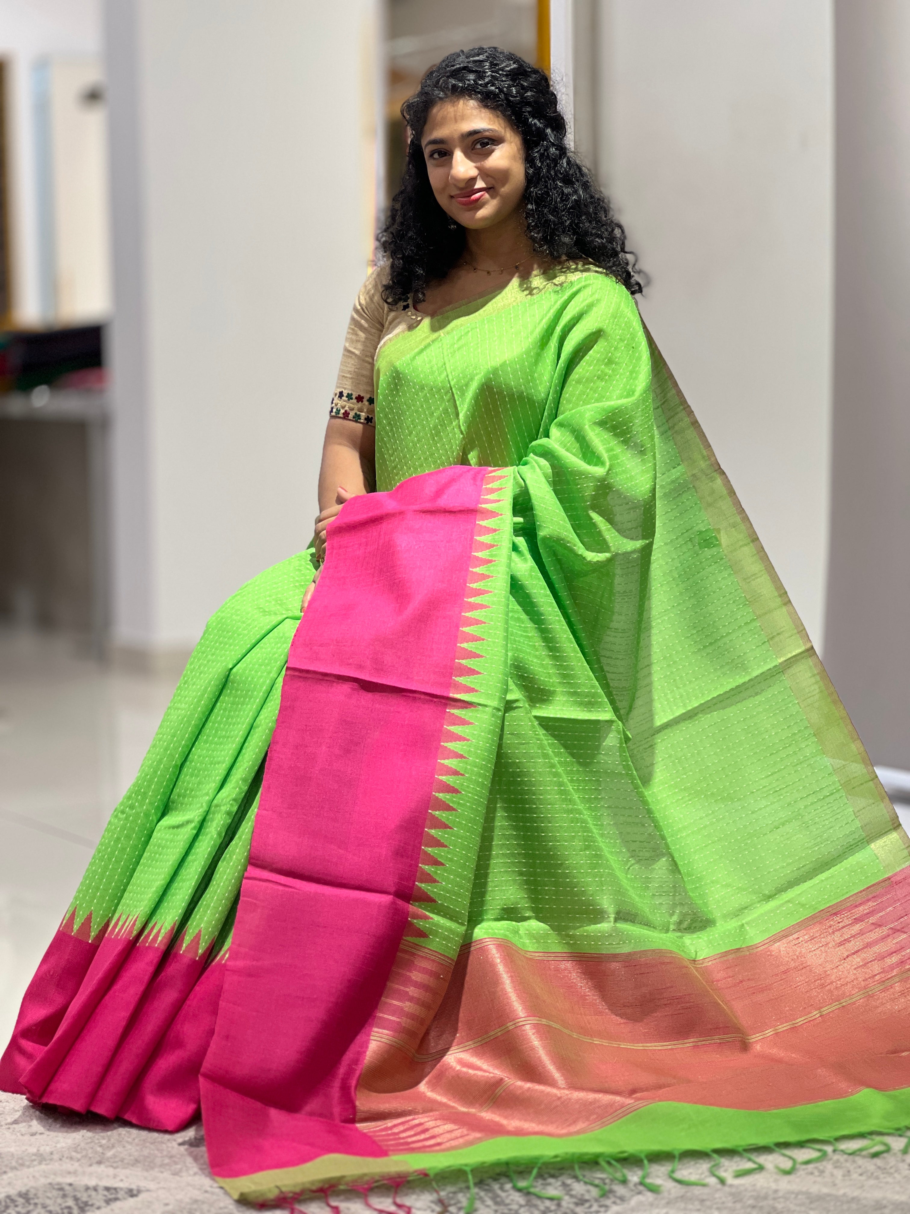 •  Style:  Kantha Weaved, Contrast Lower Temple Border Detailing, Zari Borders