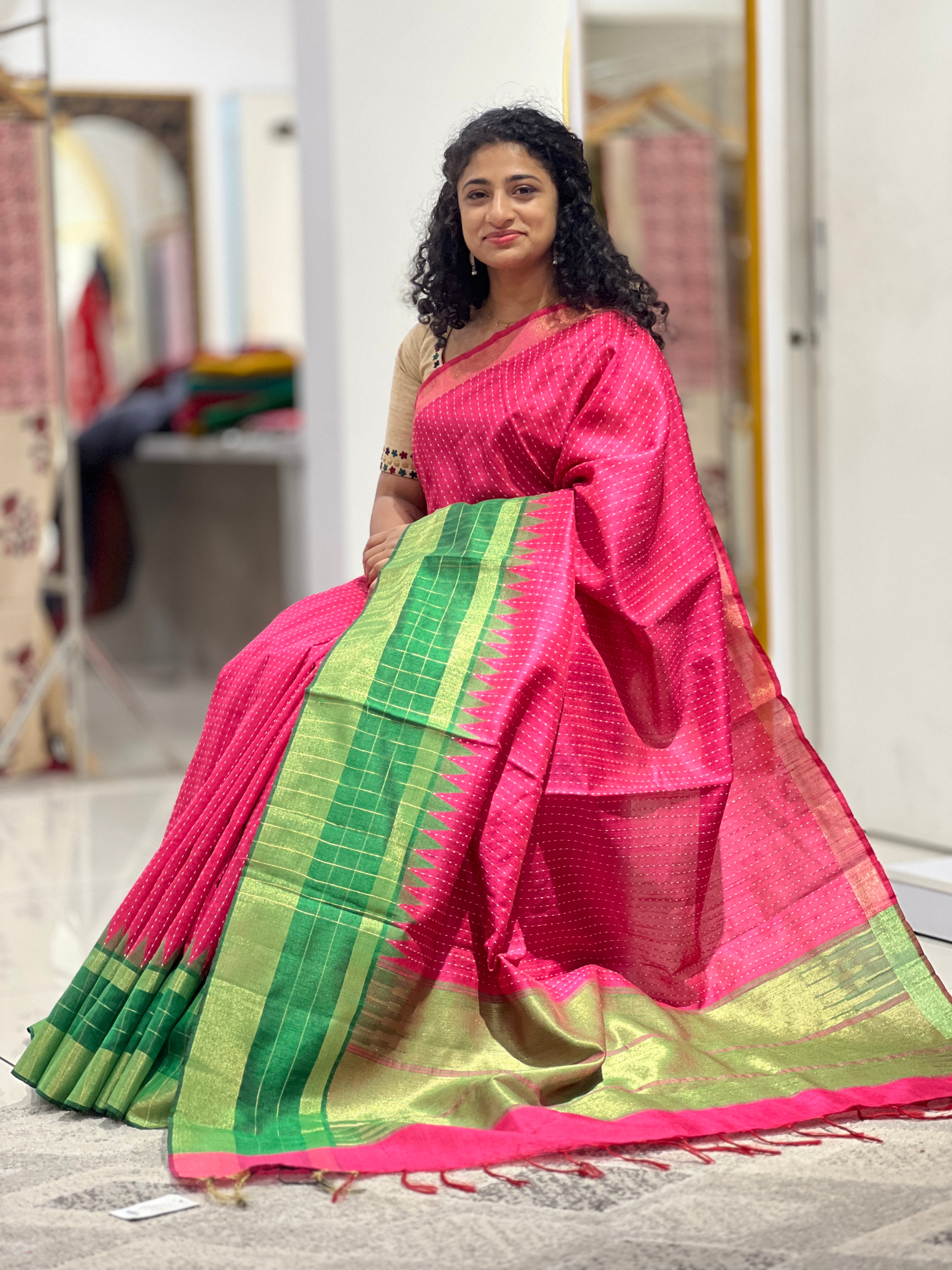 - Style: Kantha Weaved, Temple Border Detailing, Check Patterned Lower Border, Zari Borders