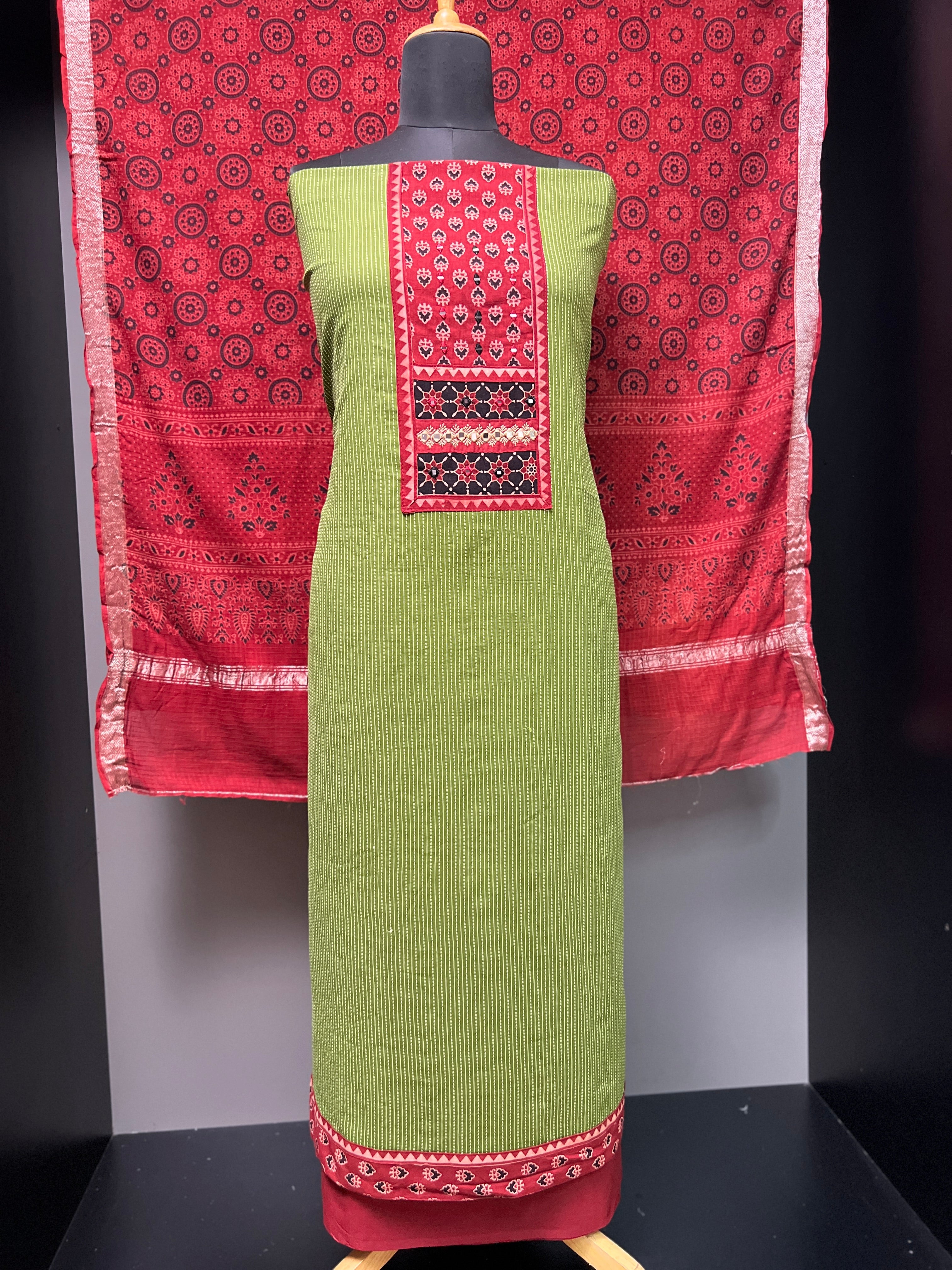 - Style: Kantha Weaving Pattern, Ajrak Printed Yoke Portion, Mirror & Embroidery Highlighted