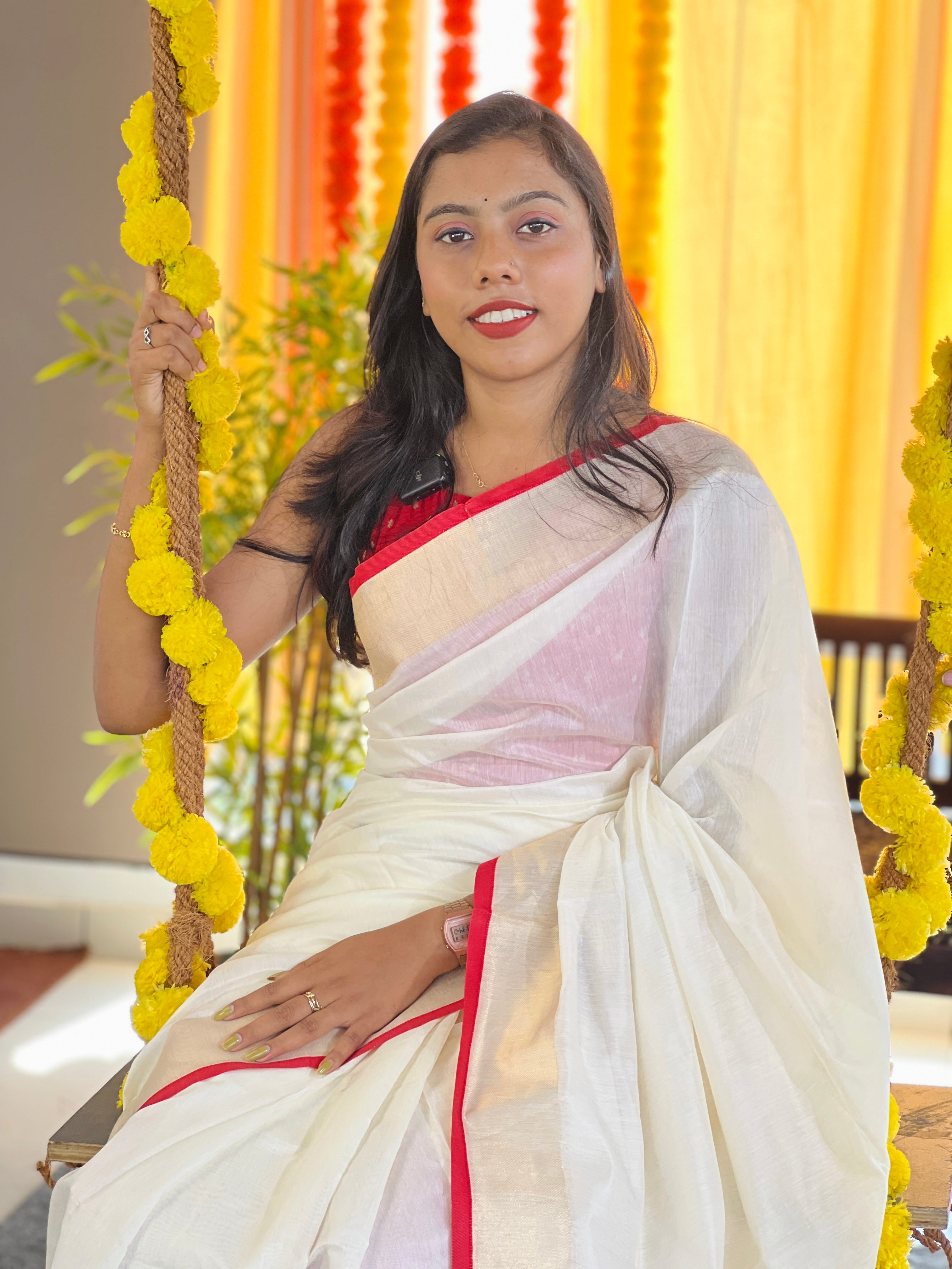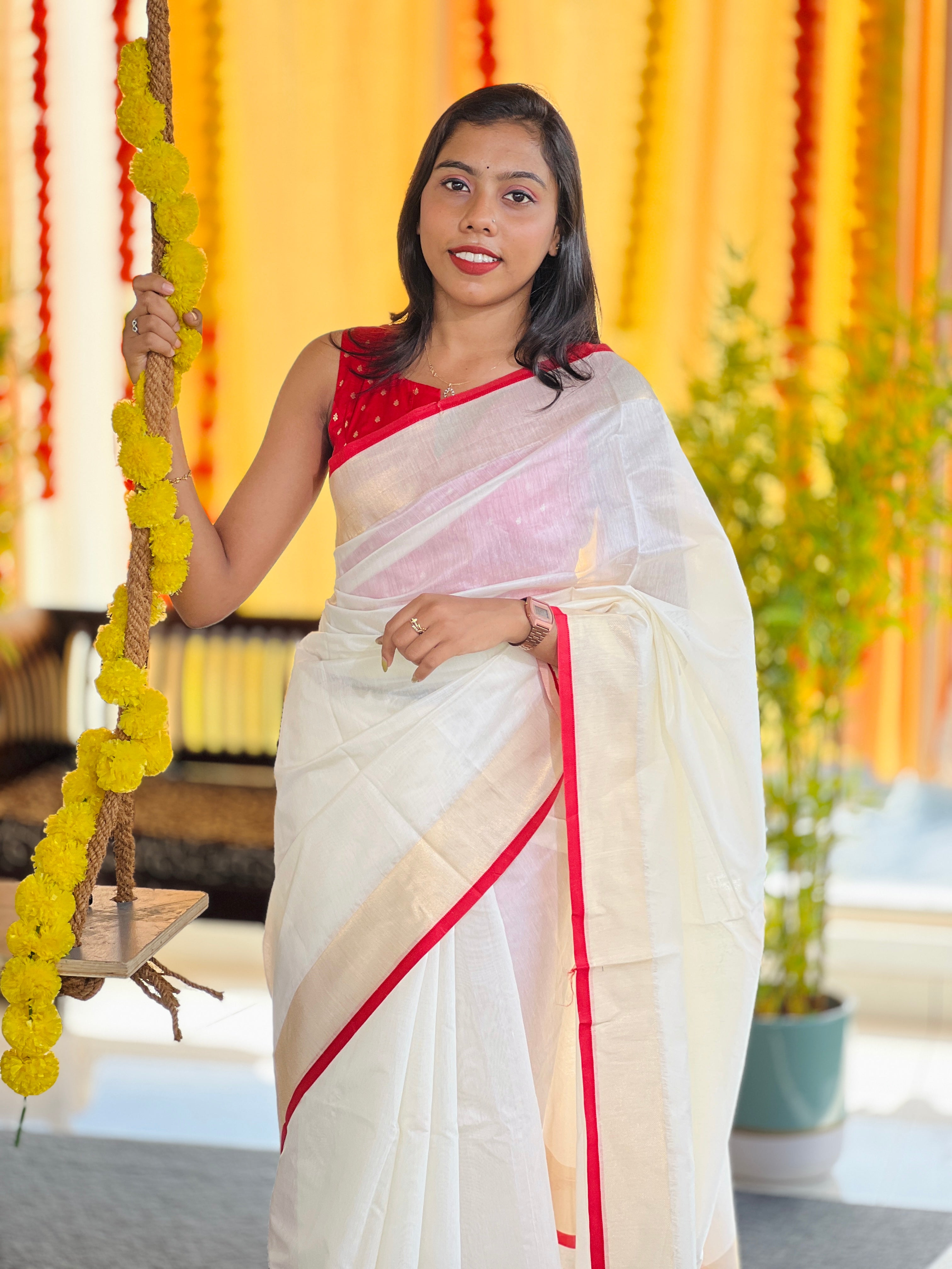 - Style: Kasavu Border with Kara Detailing, Tassels Attached