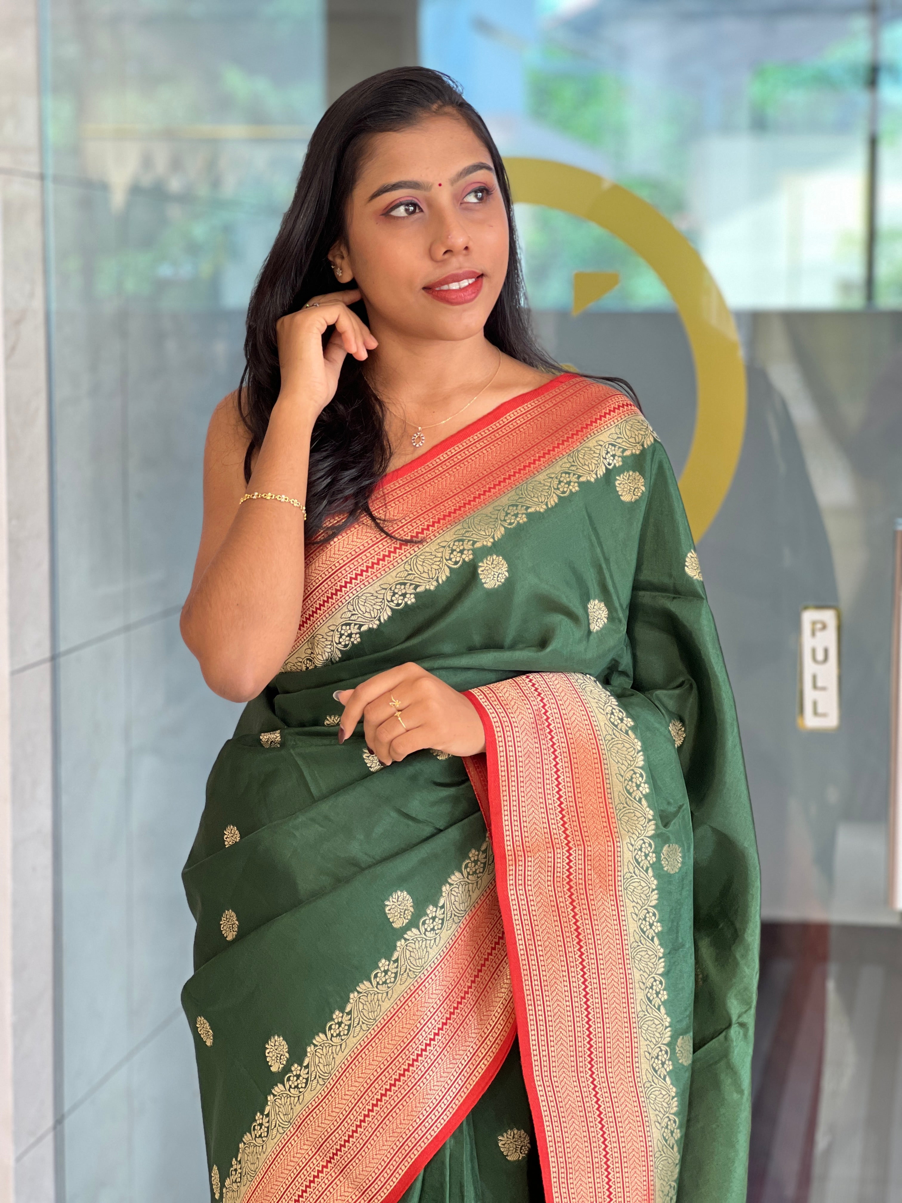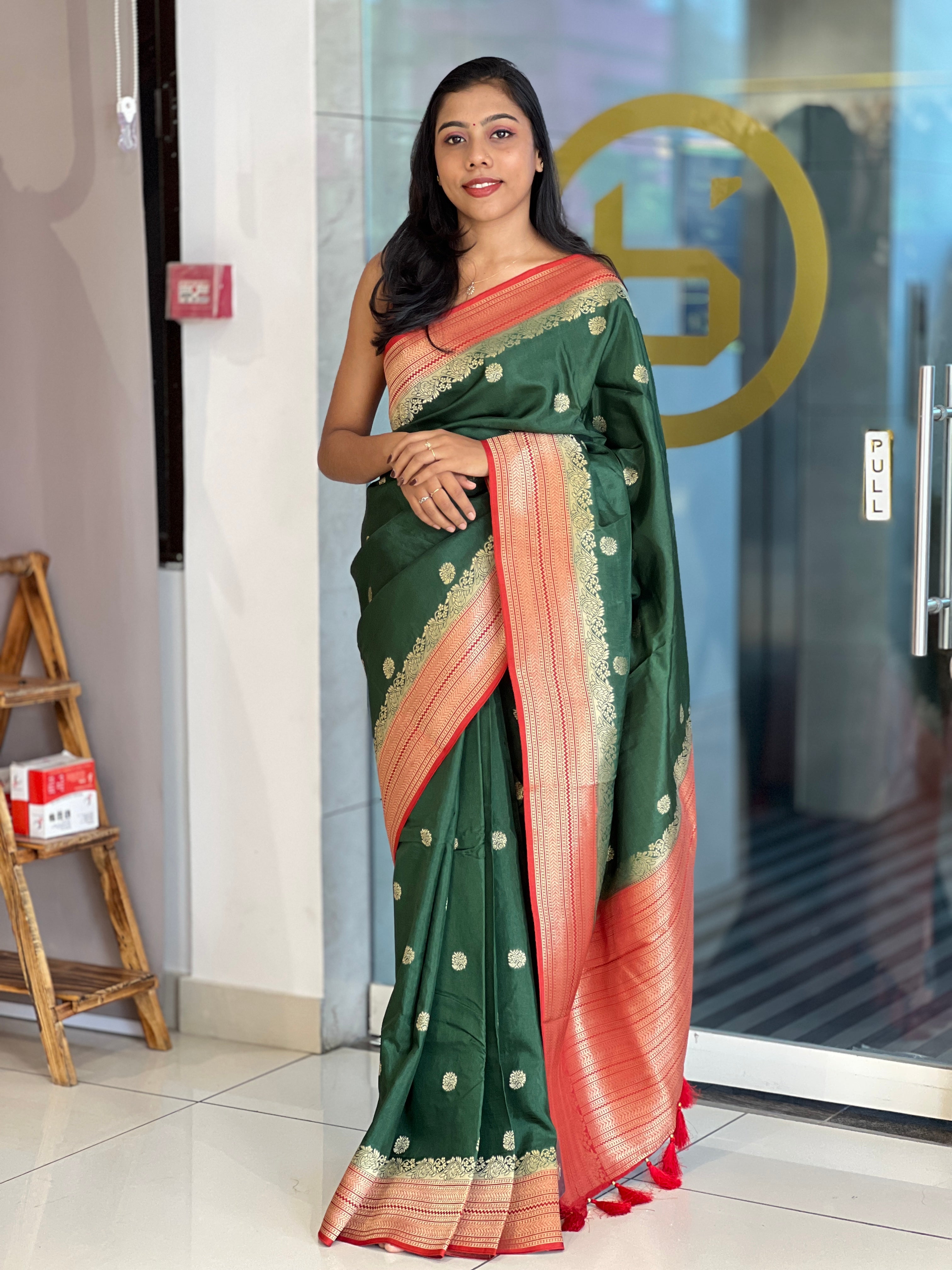 - Style: Scattered Floral Buta, Light Golden Zari Woven, Contrast Traditional Patterned Borders & Short Pallu, Tassels Attached