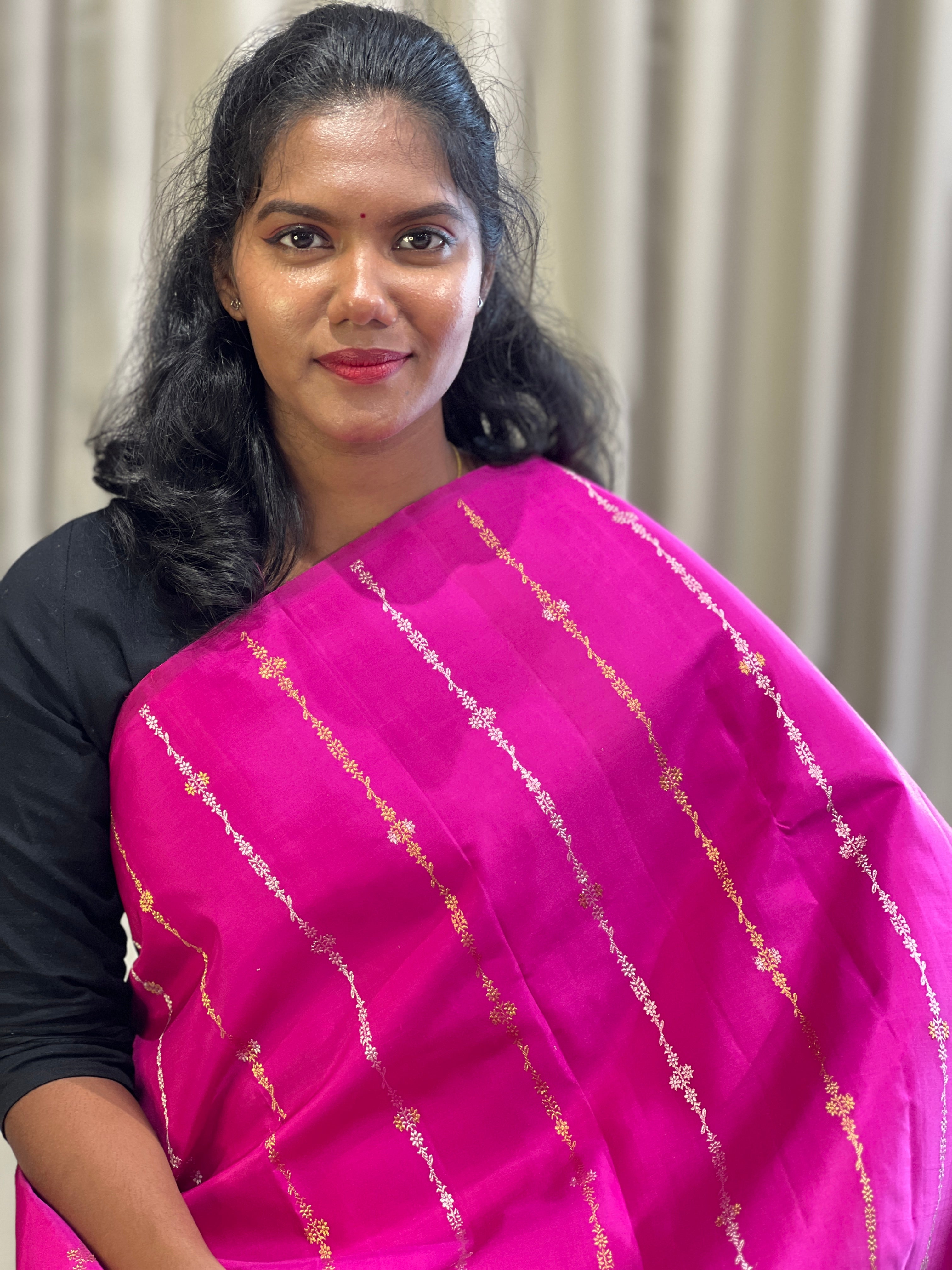 - Style: Silver and Golden Zari Line Weaving Pattern, Zari Weaved Pallu