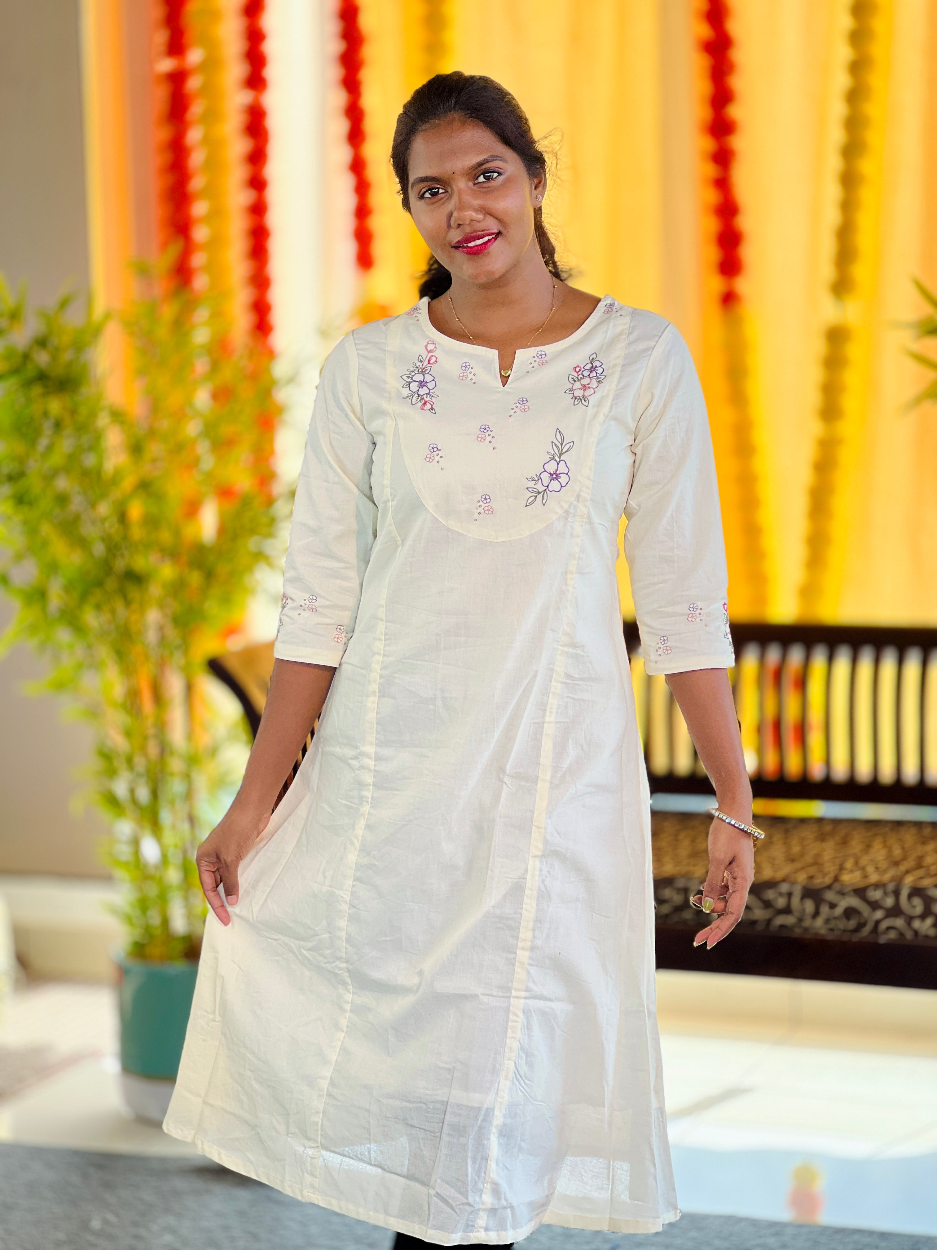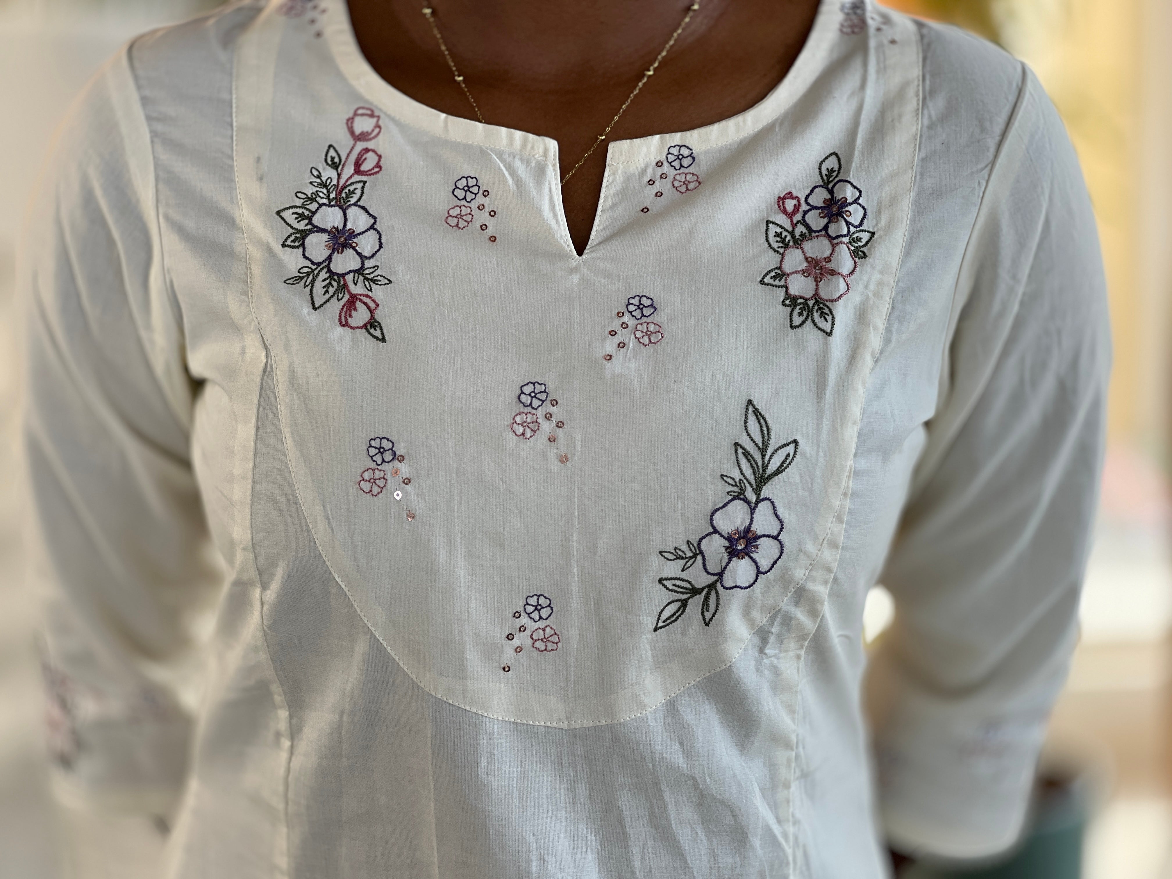 - Style: Machine Embroidery on Yoke with Sequence Detailing, A-Line With Panel Cut , Embroidery Detailing on Sleeves