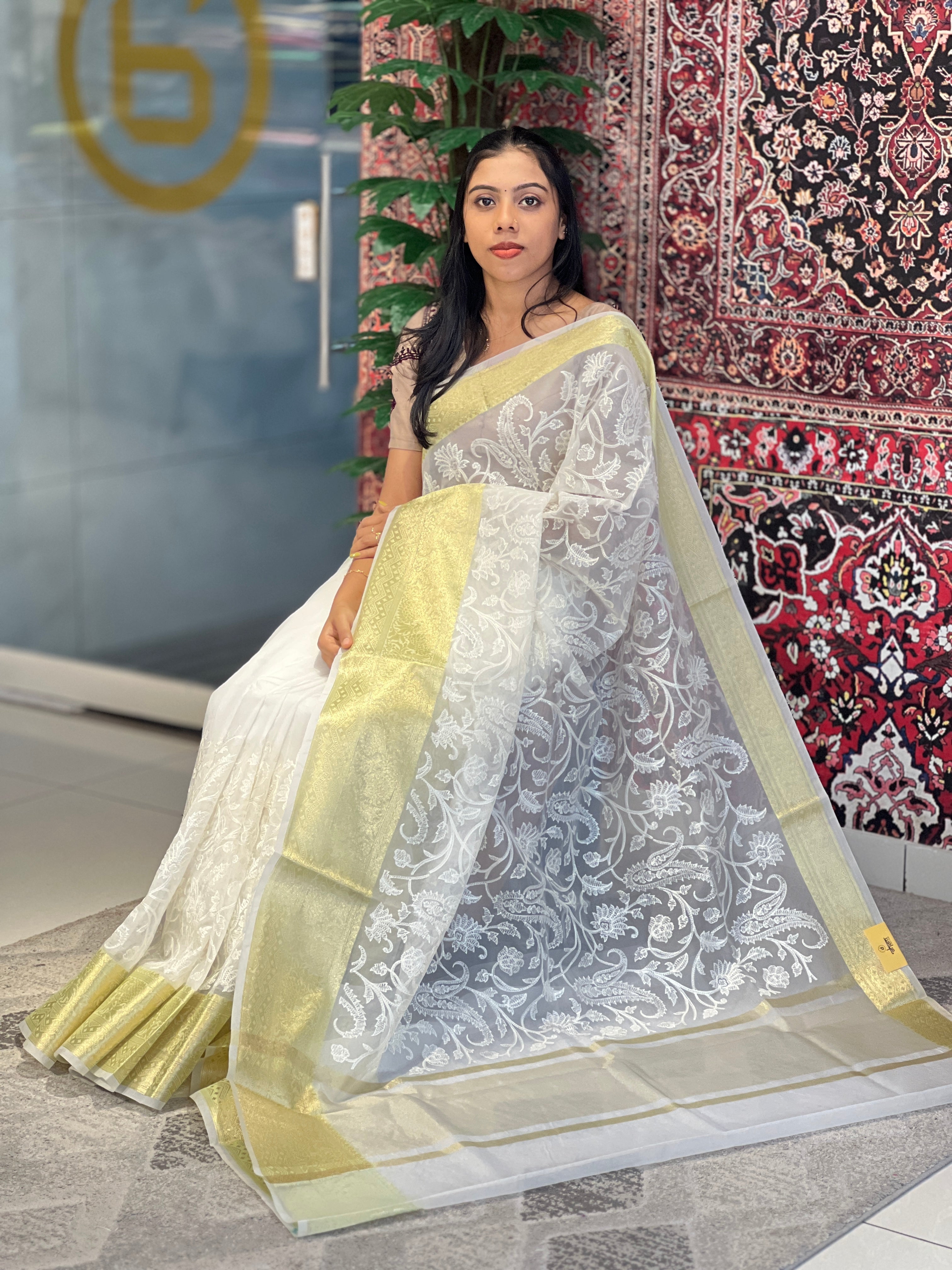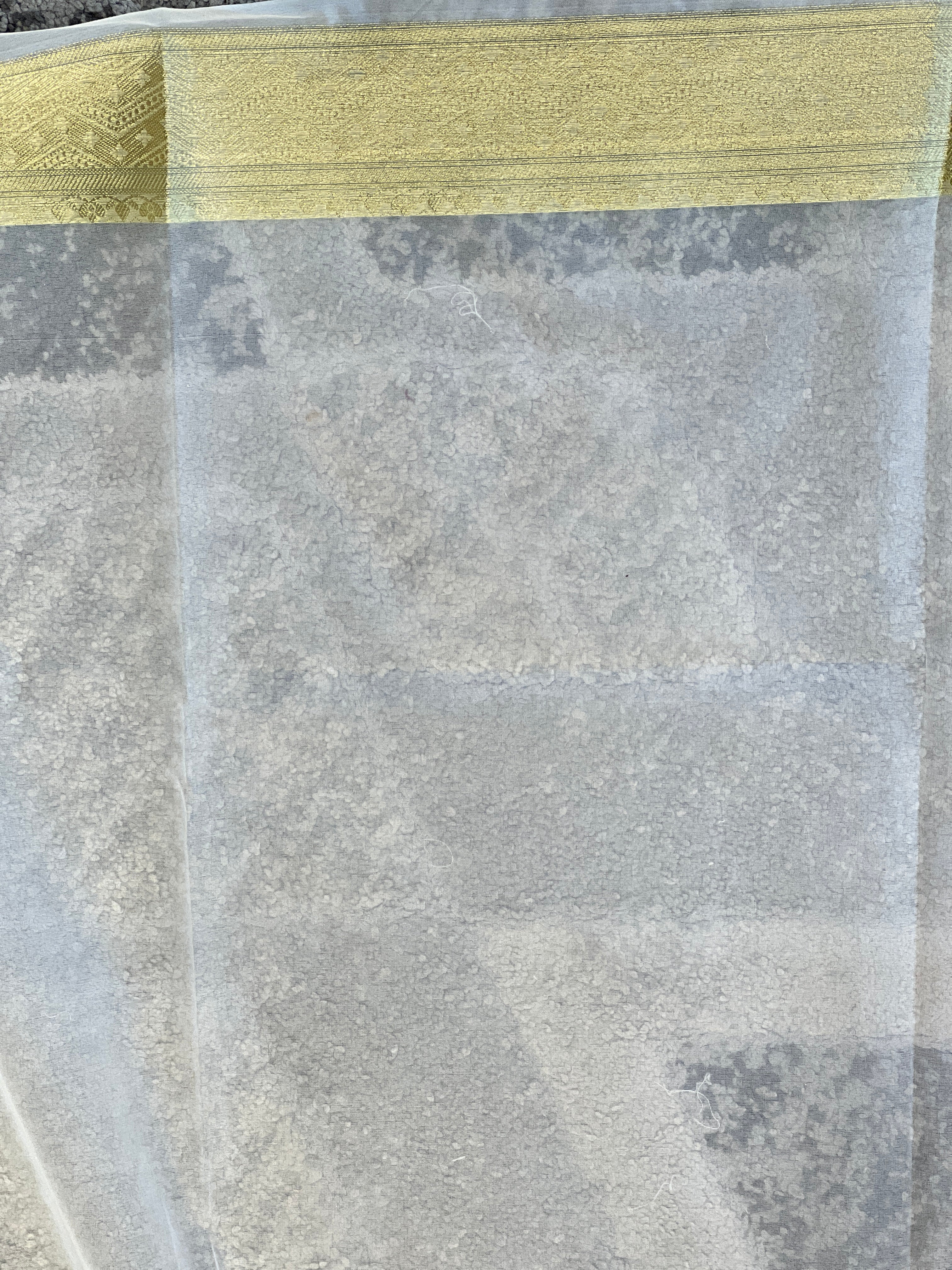- Style:Floral Chikankari Patterned Design, Machine Embroidery, Floral Golden Zari Weaved Border Detailing, Strip Patterned Golden Zari Weaved Pallu