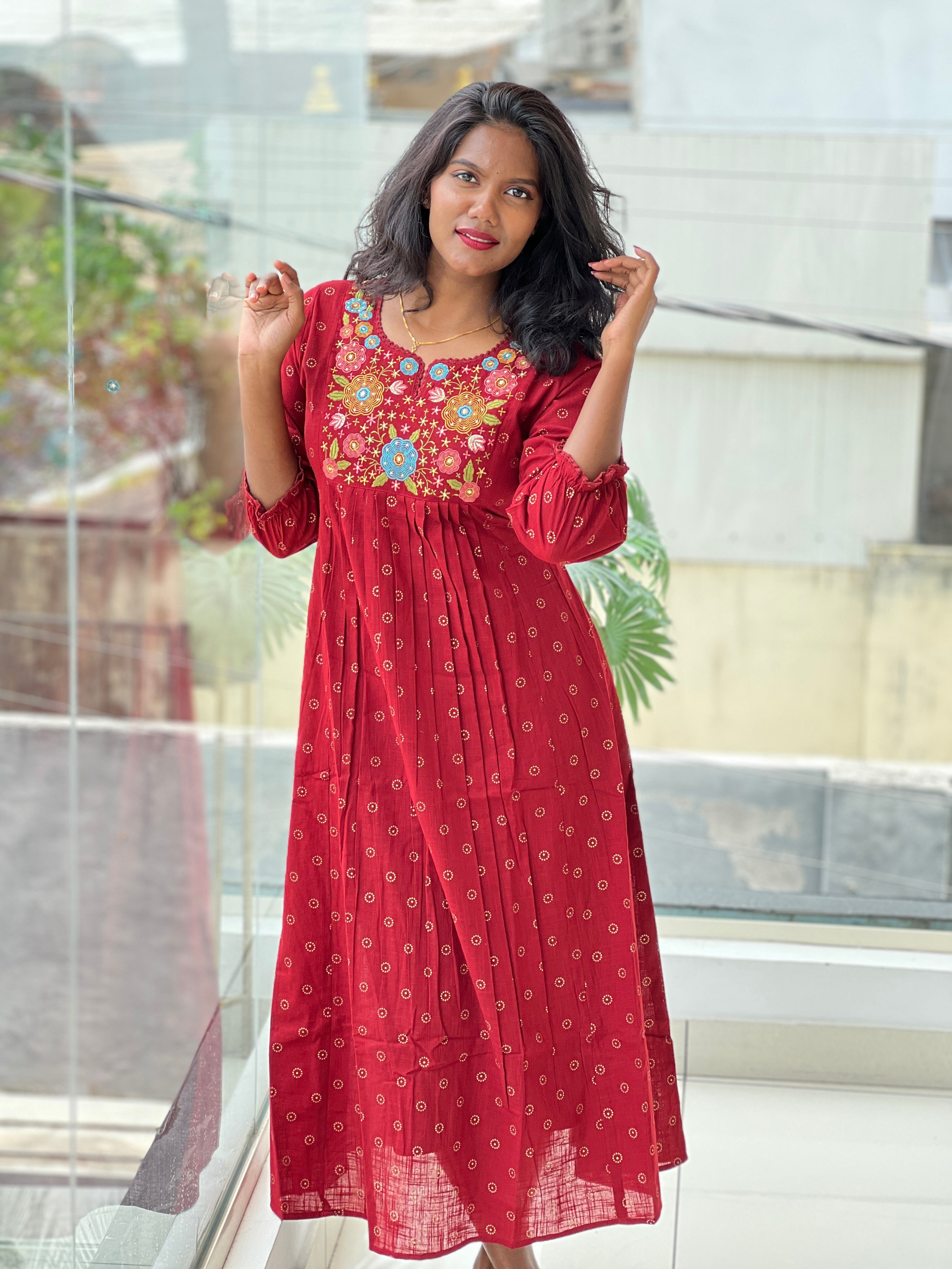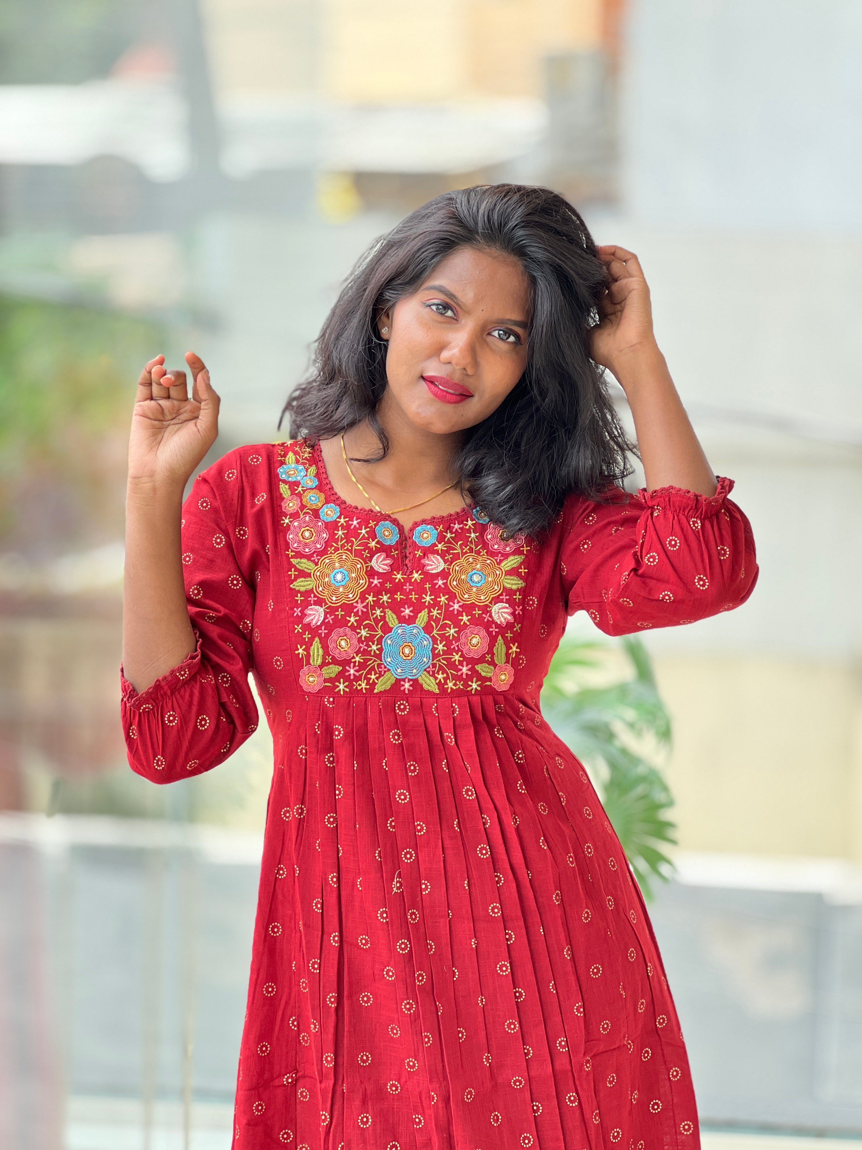 - Style: Multi-Color Floral Machine Embroidery Detailing, With Lurex Yarn, Foil Paint Detailing, Pleated Yoke, Lace Detailed Neck, Elastic Detailed Sleeves, A-Line Pattern