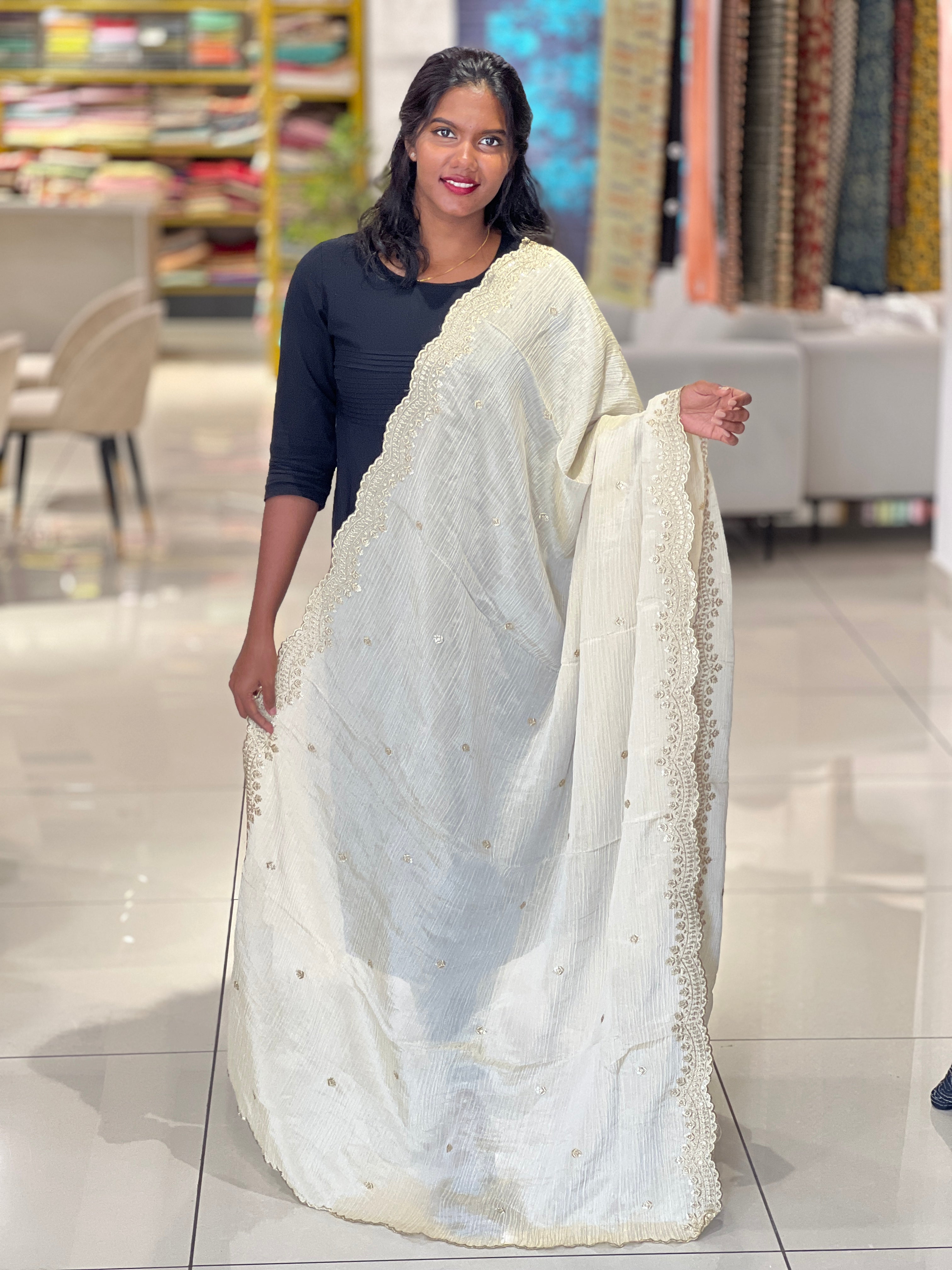 - Style: Machine Embroidery Detailing, Scattered Buttas, Border Detailing, Uneven Scallop Finish