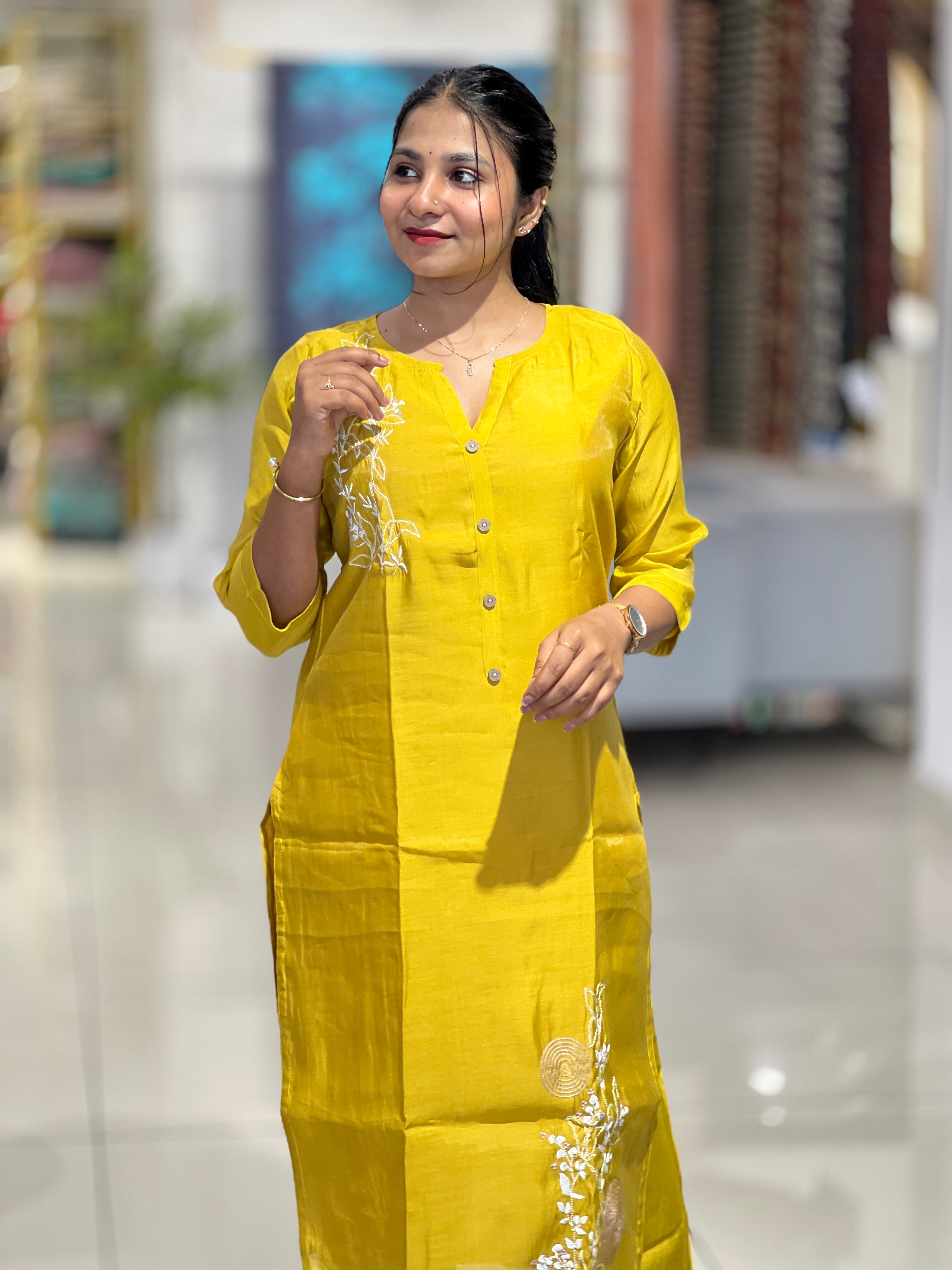 - Style: Machine Embroidery, Floral Placement Detailing, Button Detailing, Slited, Cotton Lining