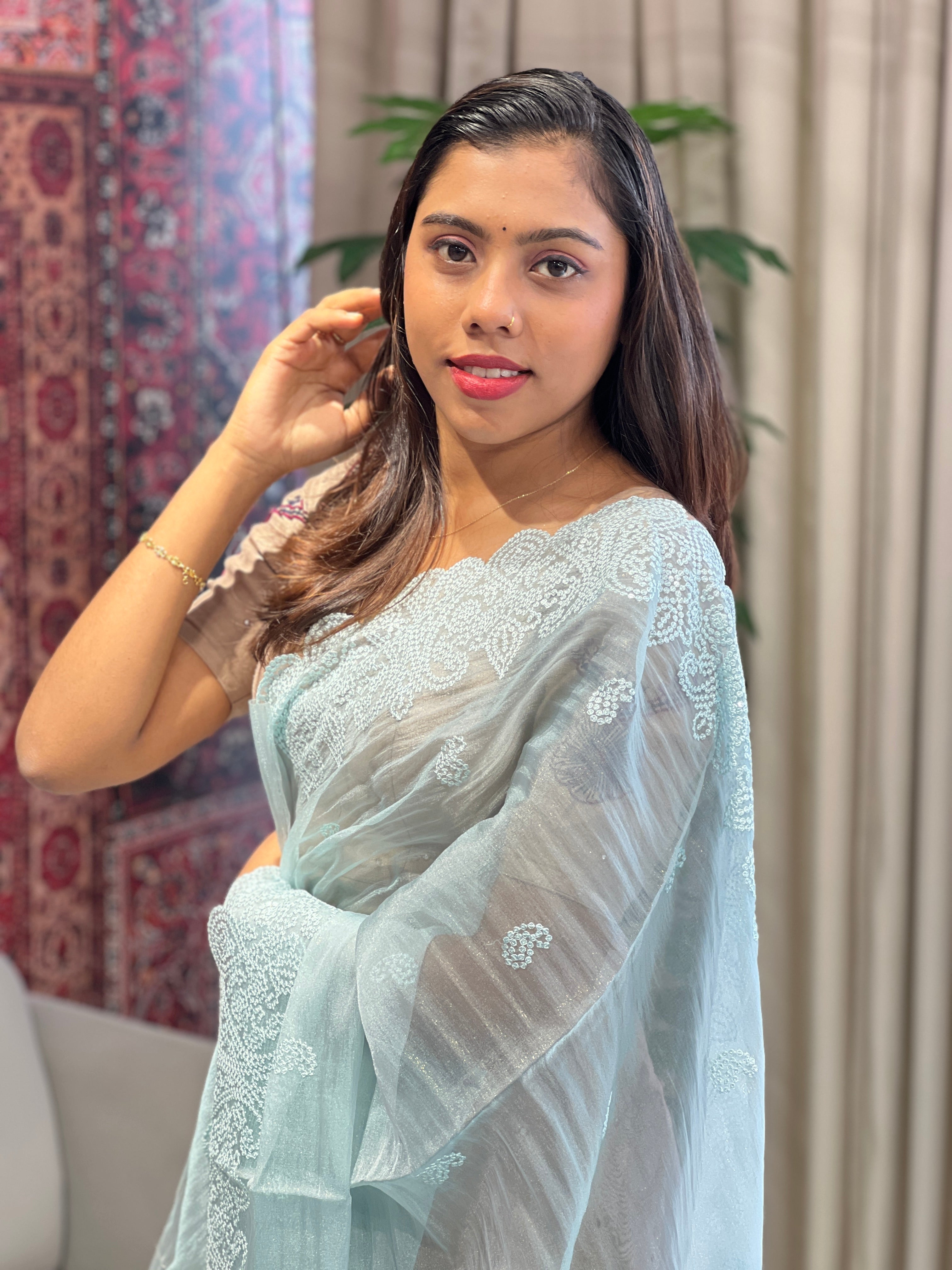 • Machine Embroidery Detailed Shimmer Organza Saree | BLD1833
