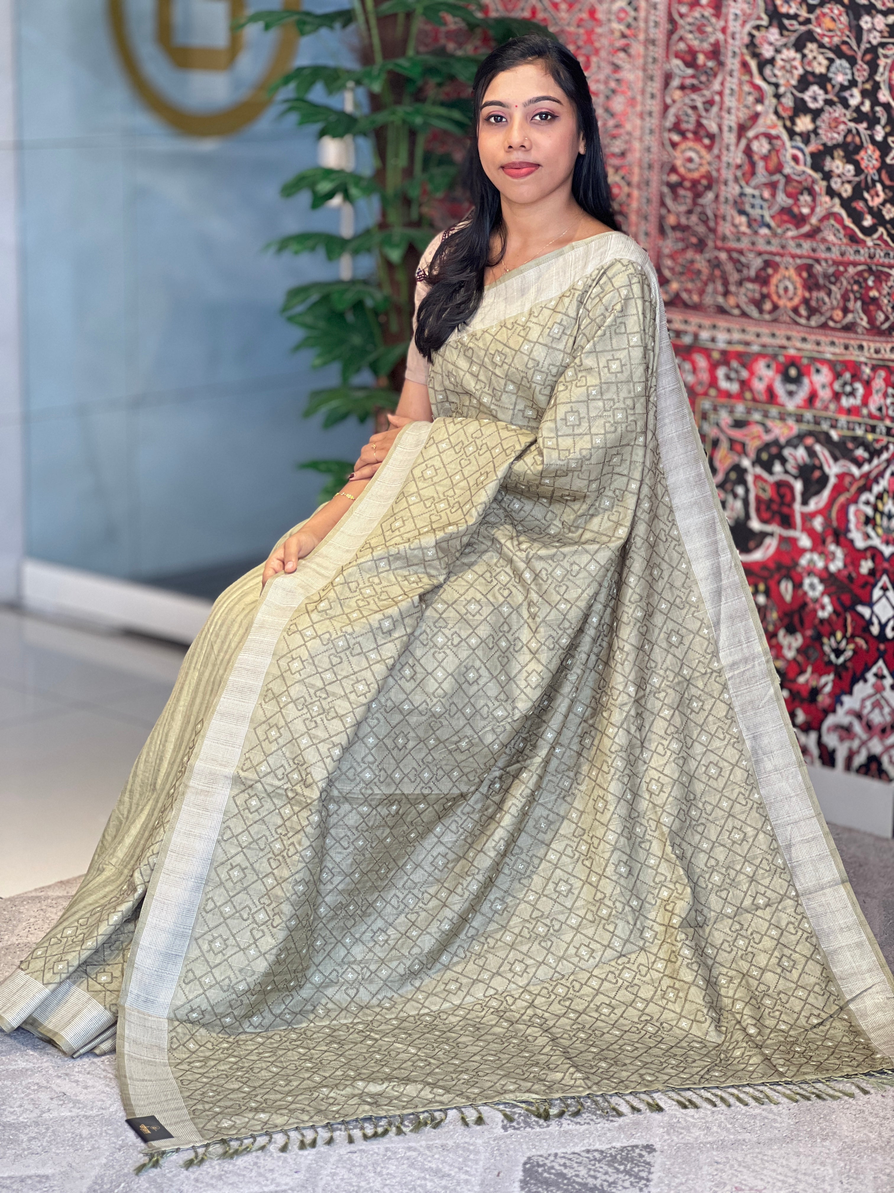 • Machine Embroidery Geometric Patterned Tussar Finish Saree | SUN287