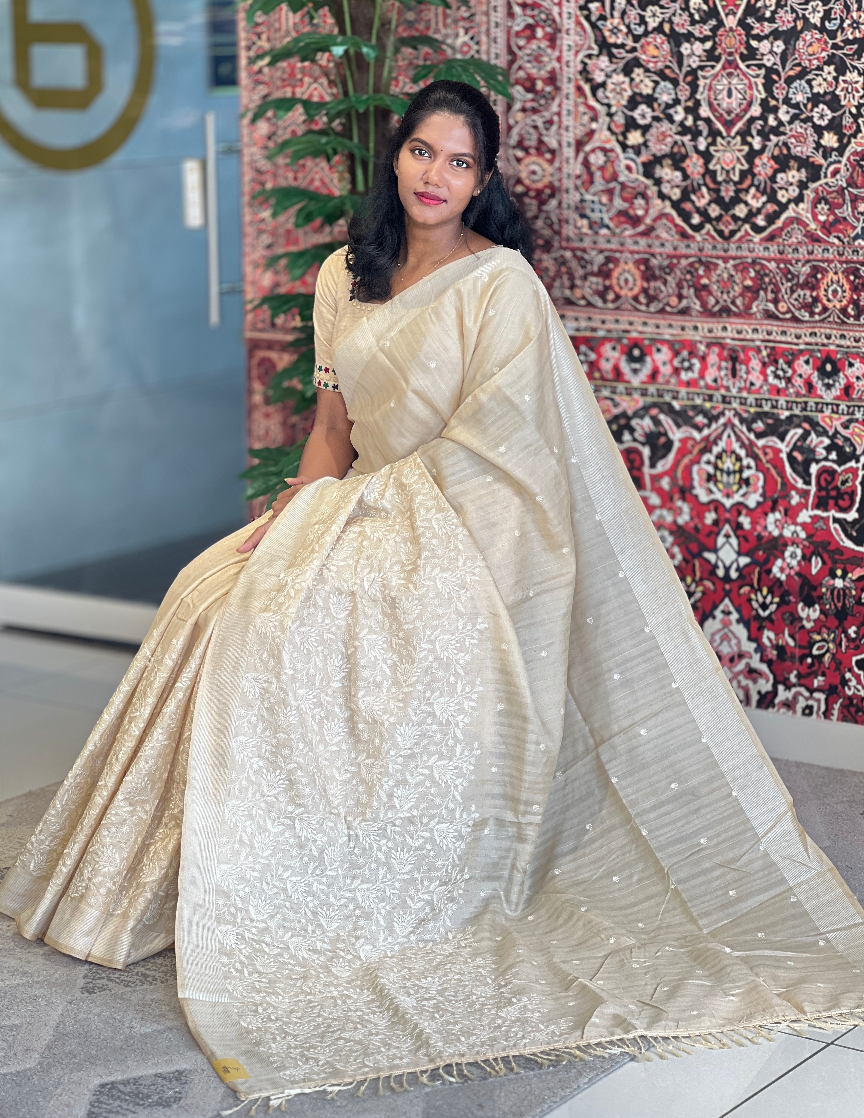 • Machine Embroidery Lucknowi Inspired Tussar Finish Saree | SUN422