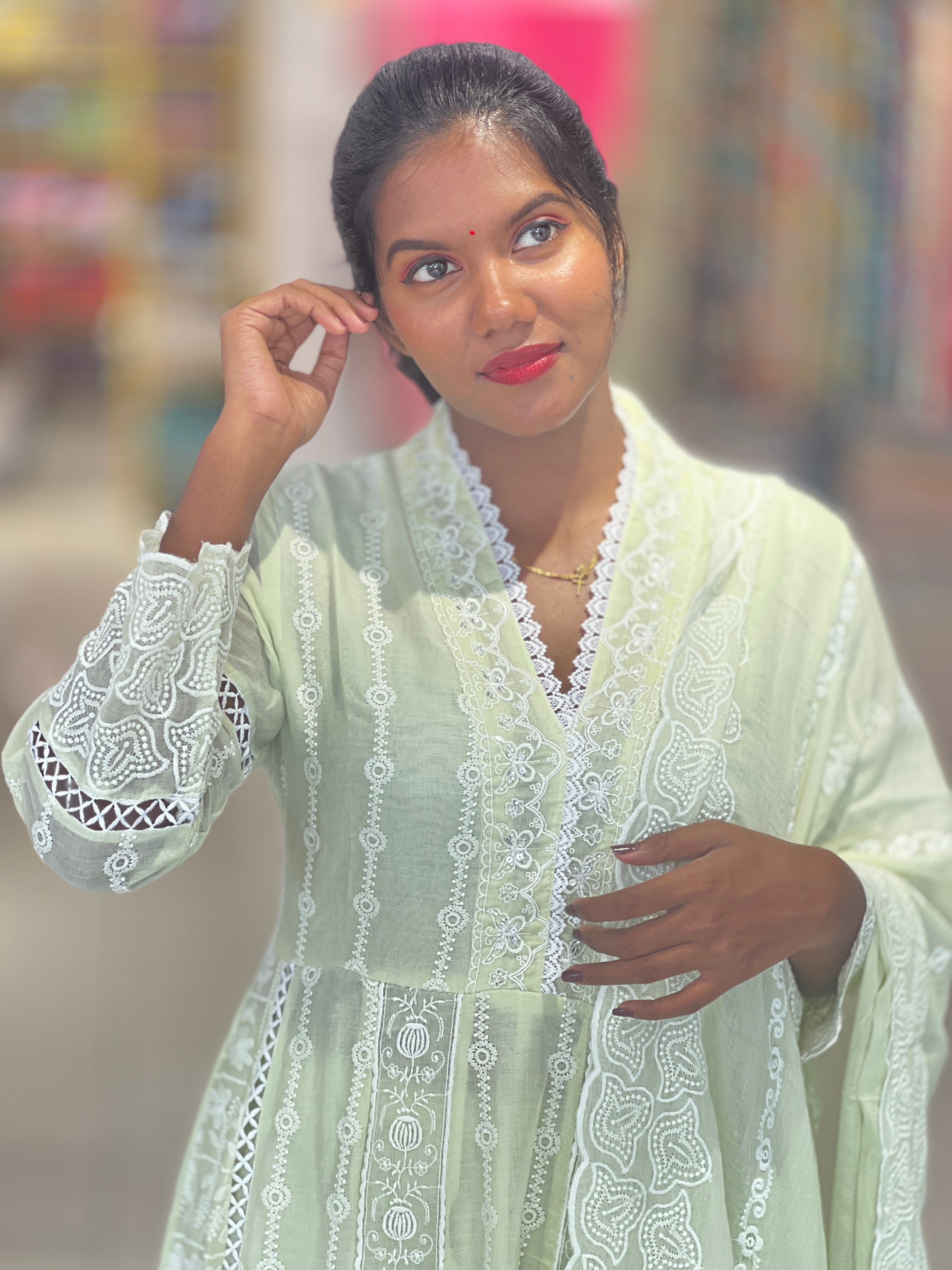 - Style: Machine Embroidery Detailing ,Lace Finished Neck, Sleeves& Border, Lower Hem Portion Scallop Finish