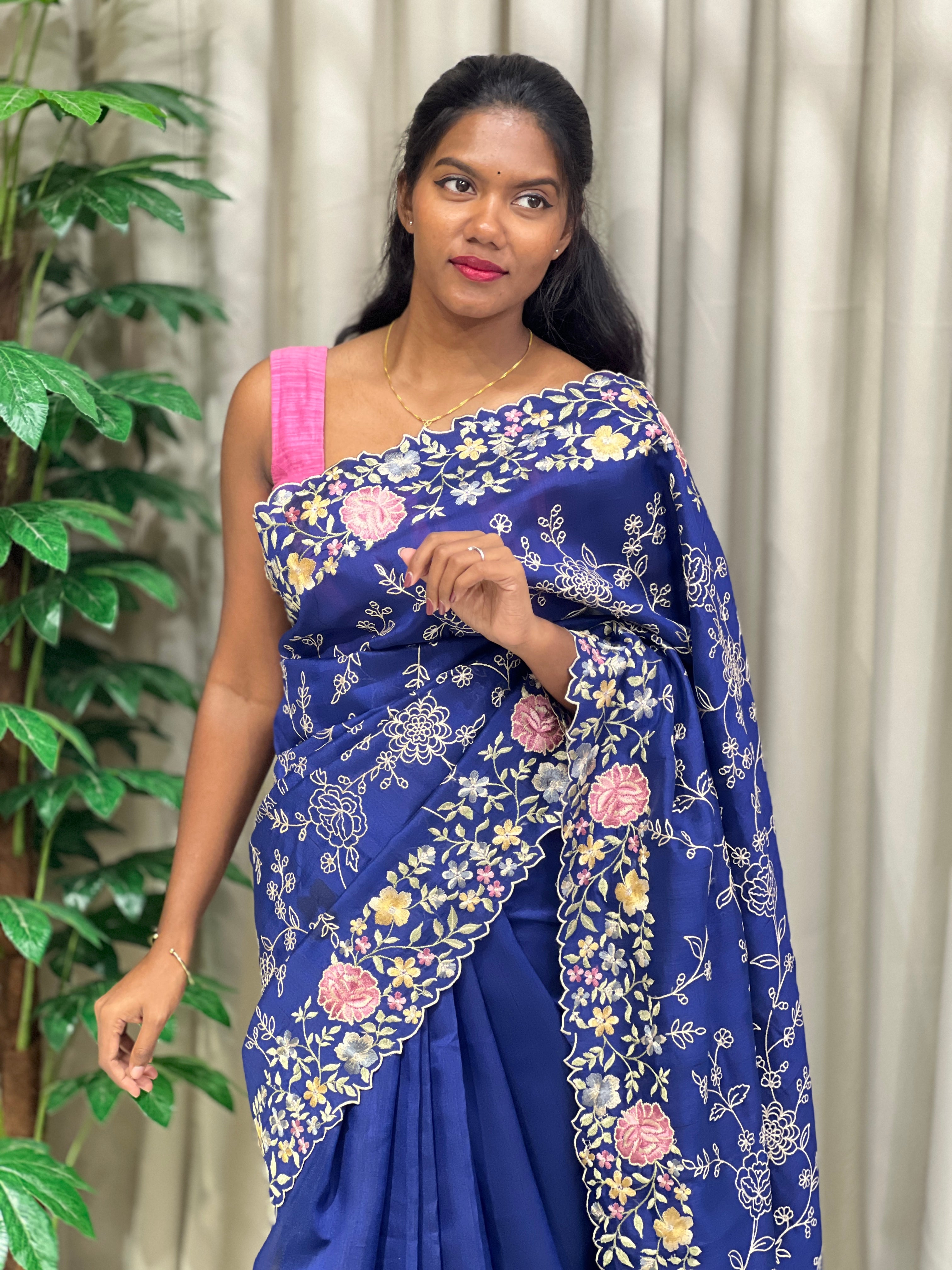 - Style: Machine Embroidery, Multi-Color Floral Embroidery Detailing, Golden Zari Highlight, Scallop Edges