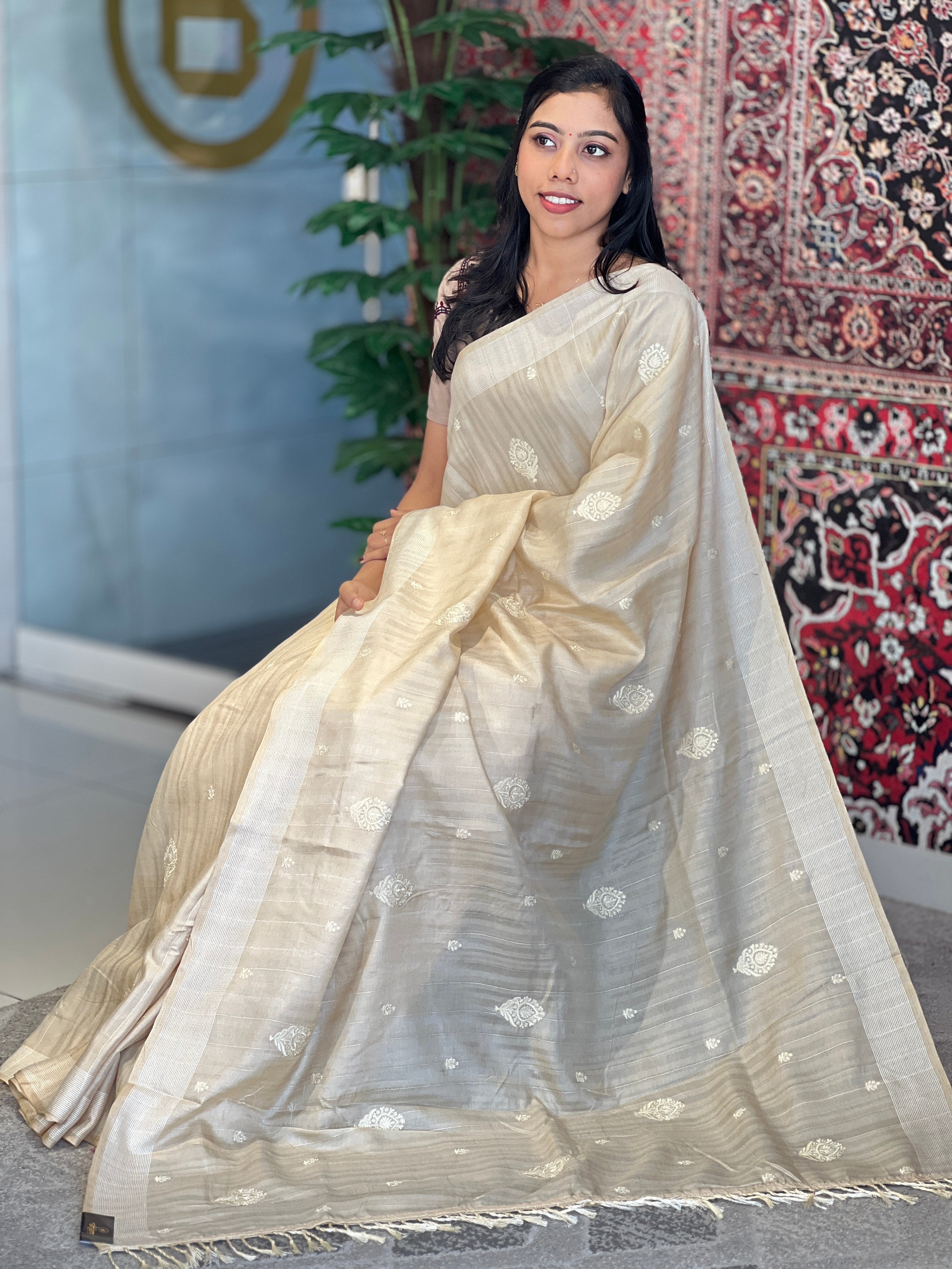 Machine Embroidery With Kantha Border Detailed Tussar Finish Saree | SUN318