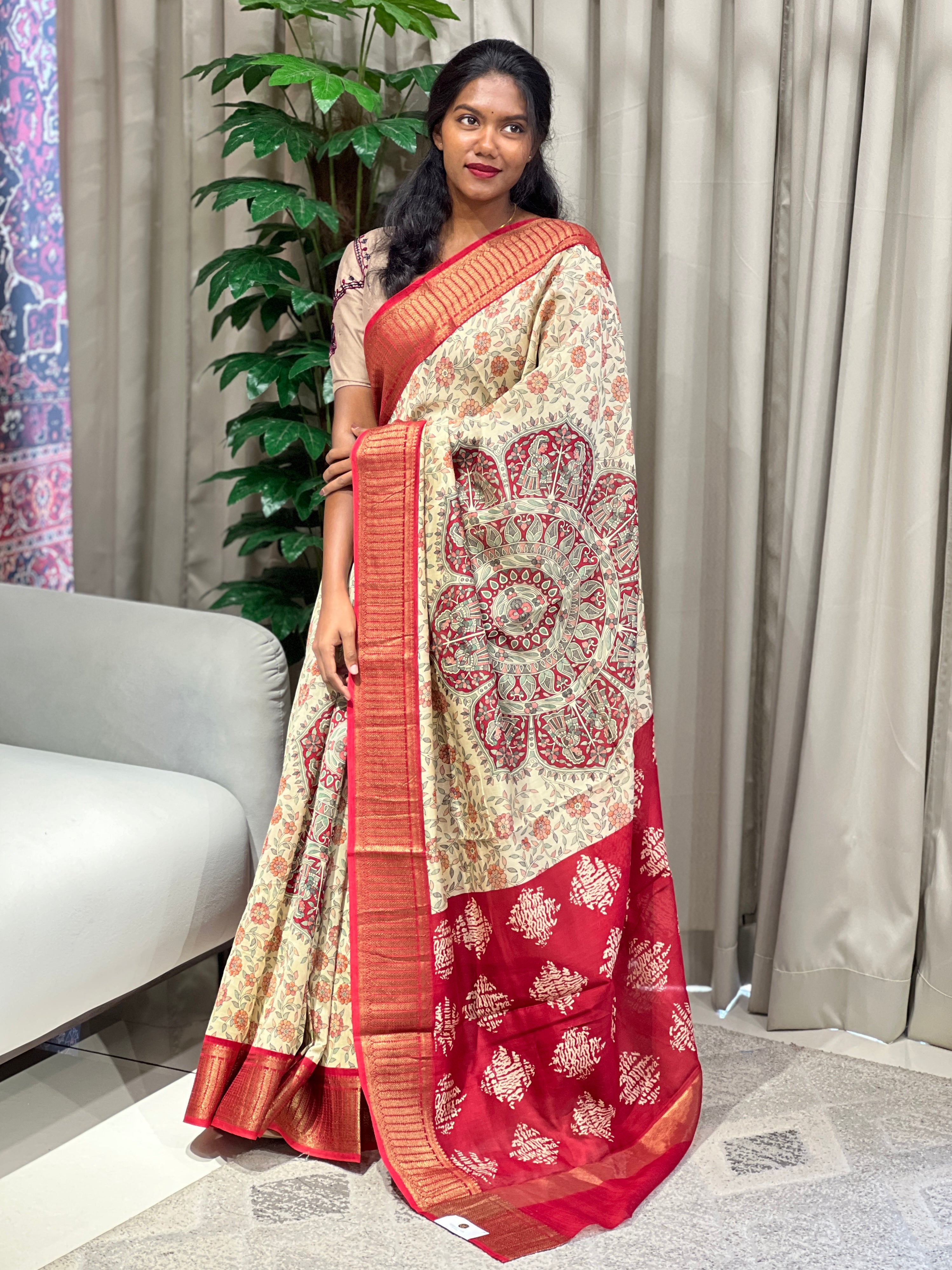 - Style: Madhubani Printed, Pallu Detailing, Banarasi Border Detailing