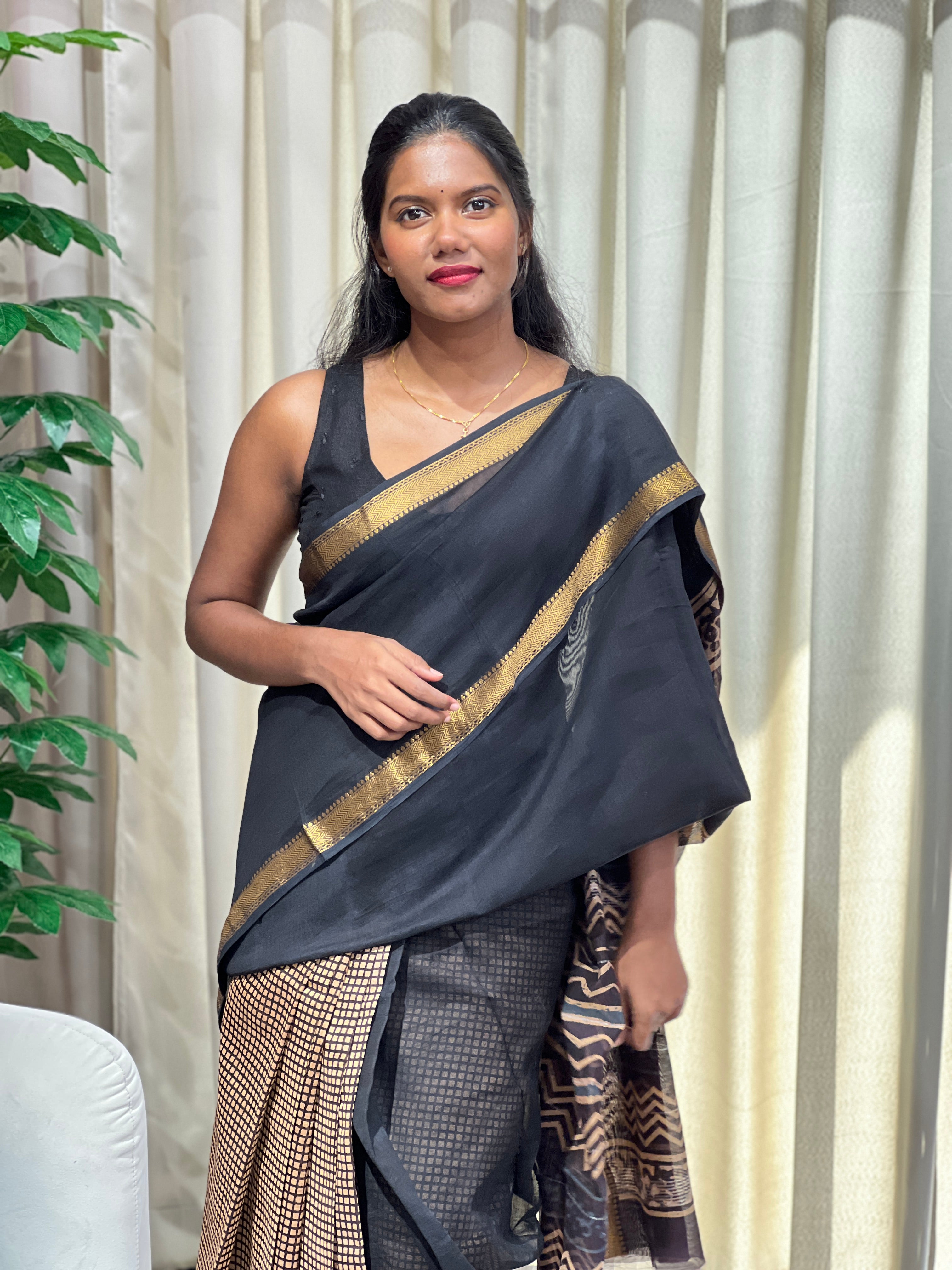 - Style: Check Printed On Pleats, Mangalgiri Border Detailing, Pallu Detailing