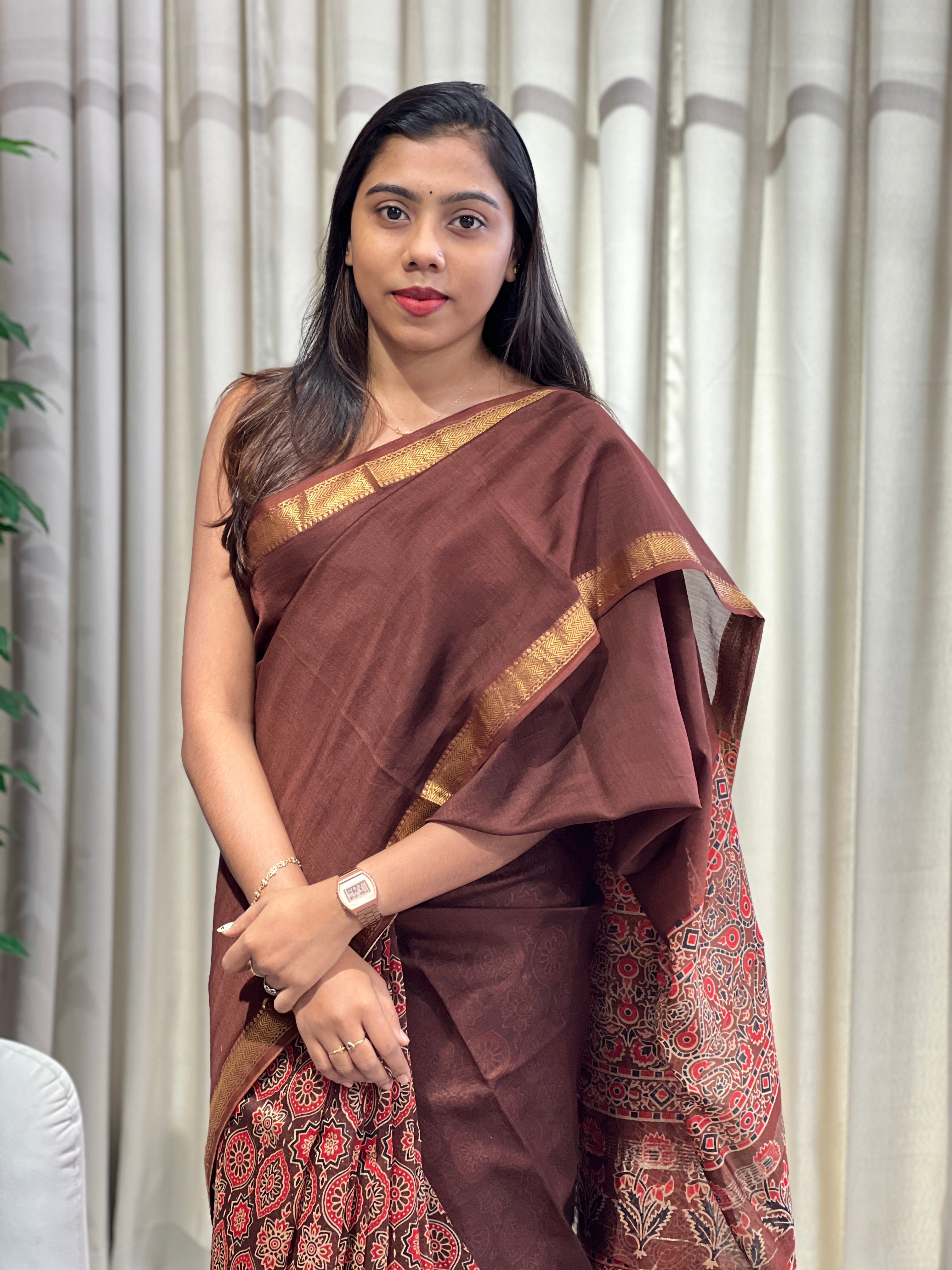 - Style: Ajrakh Printed Pleats And Pallu Detailing, Mangalgiri Border Detailing