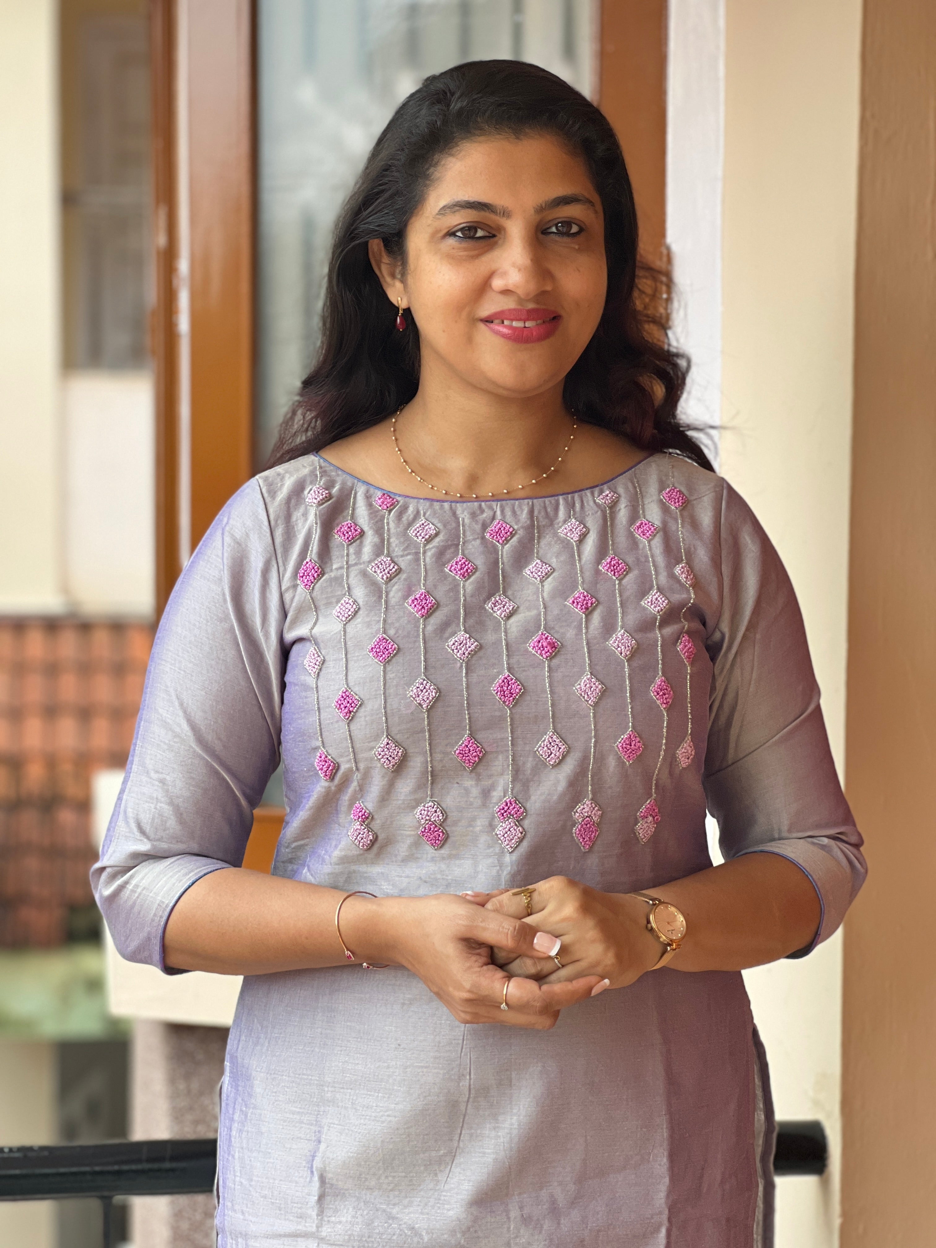 Style Worn in the Product Video: A straight cut pattern kurtha with boat-neckline and 3-4th length sleeve.