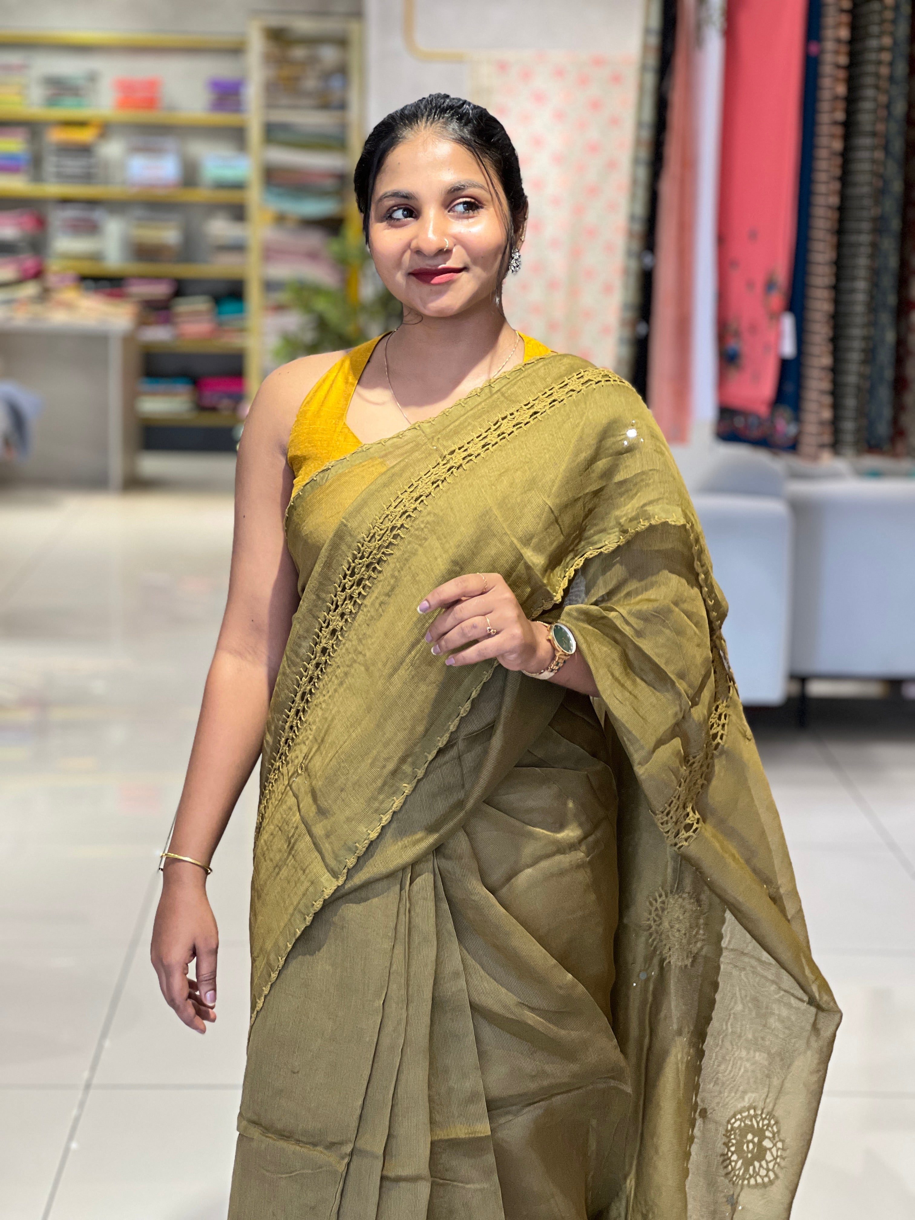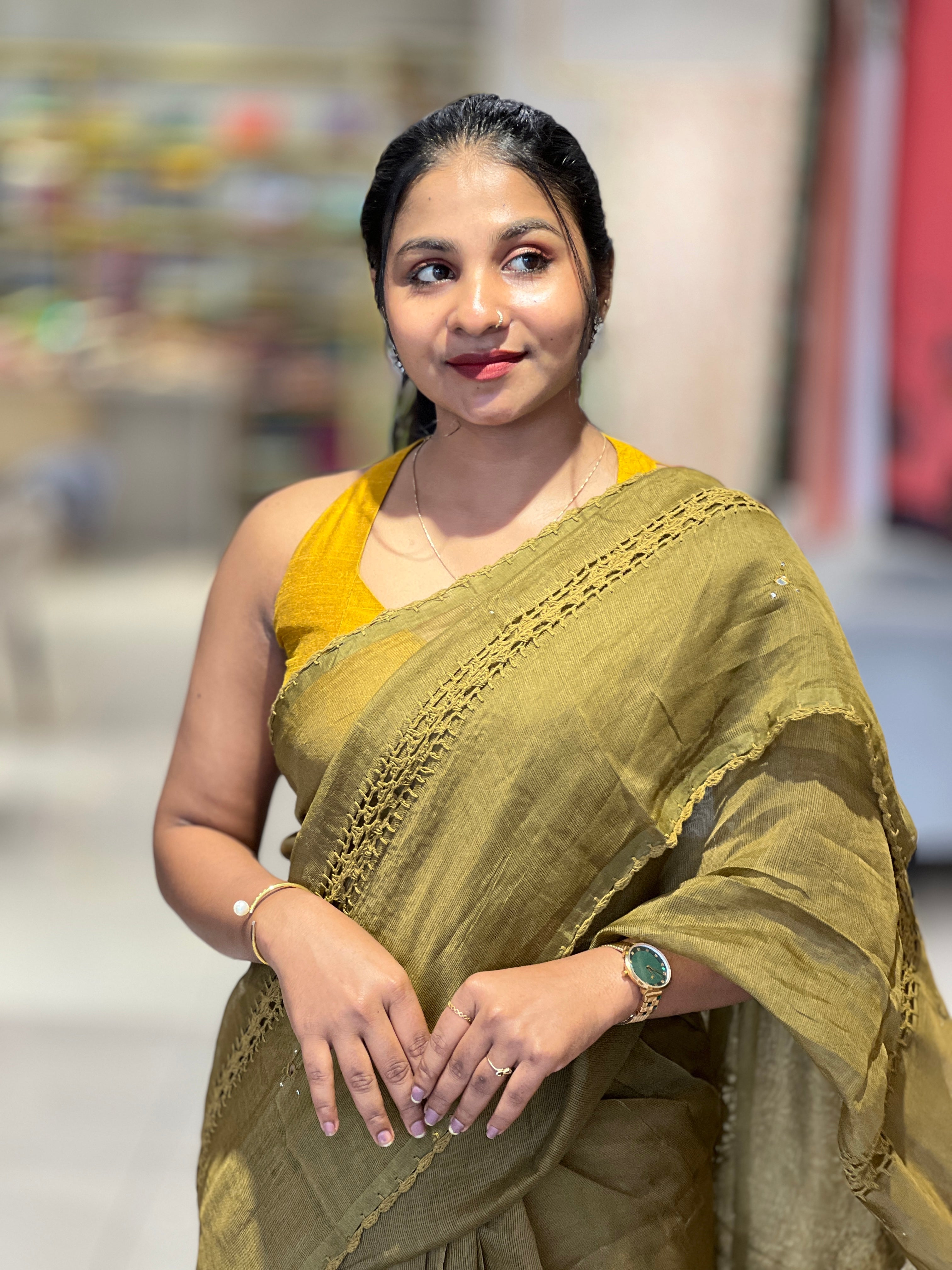 - Style: Crochet Lace Detailing, Scattered Nalgonda Mirror Detailing, Lace Edges