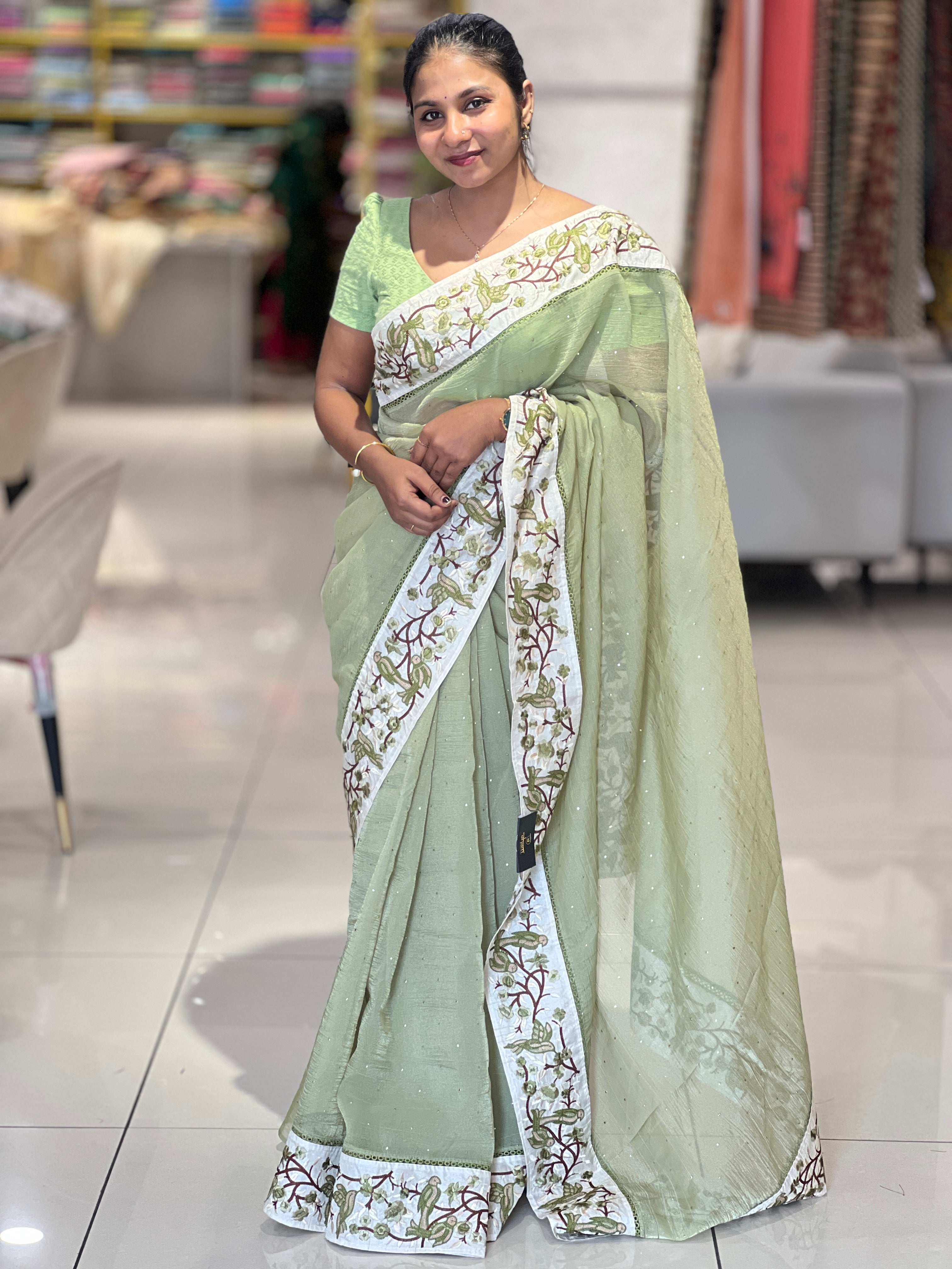 - Style: Mukaish Work Detailing, Bird Patterned Satin Stitch Border Highlighted With Lace Finish