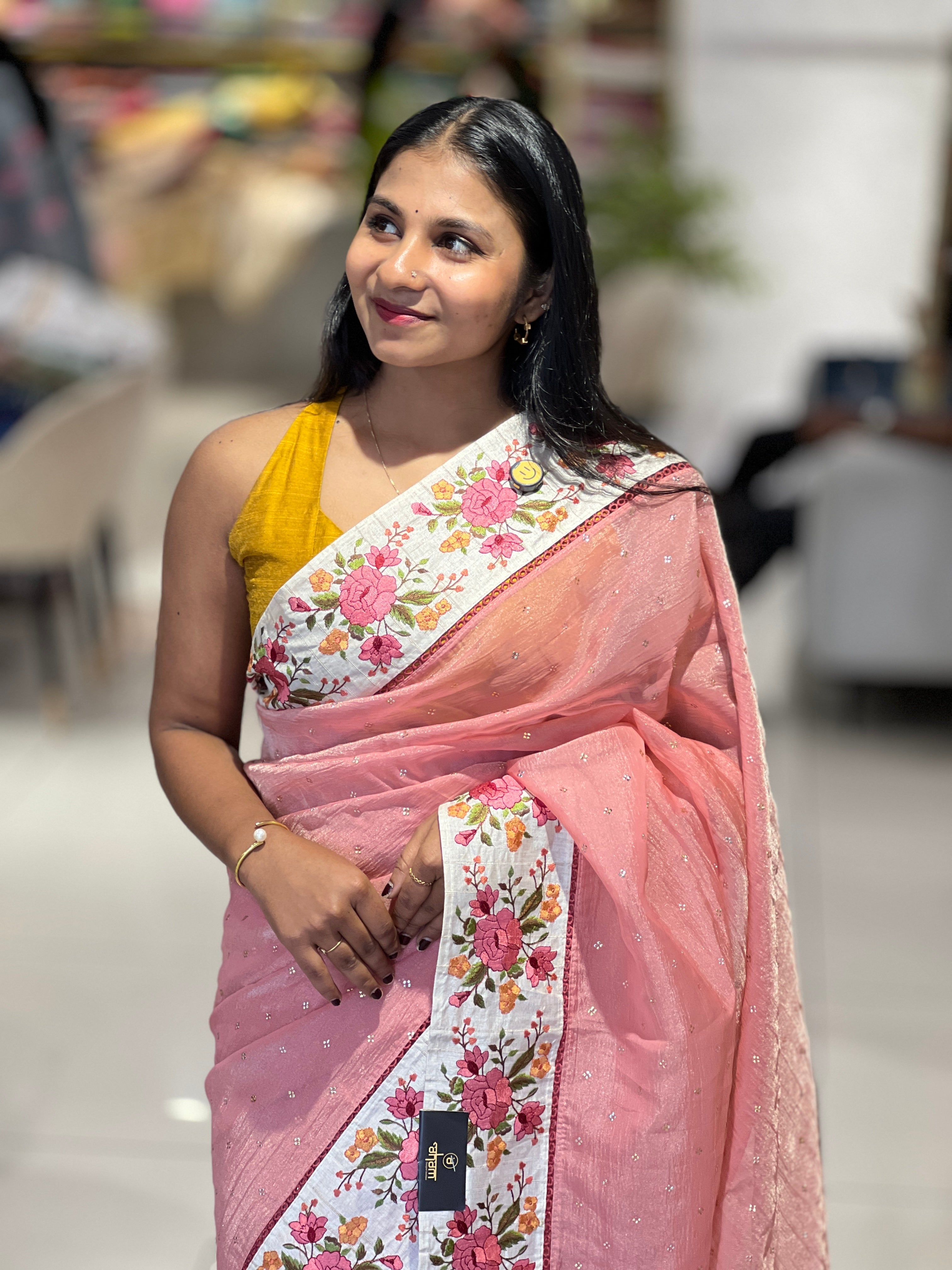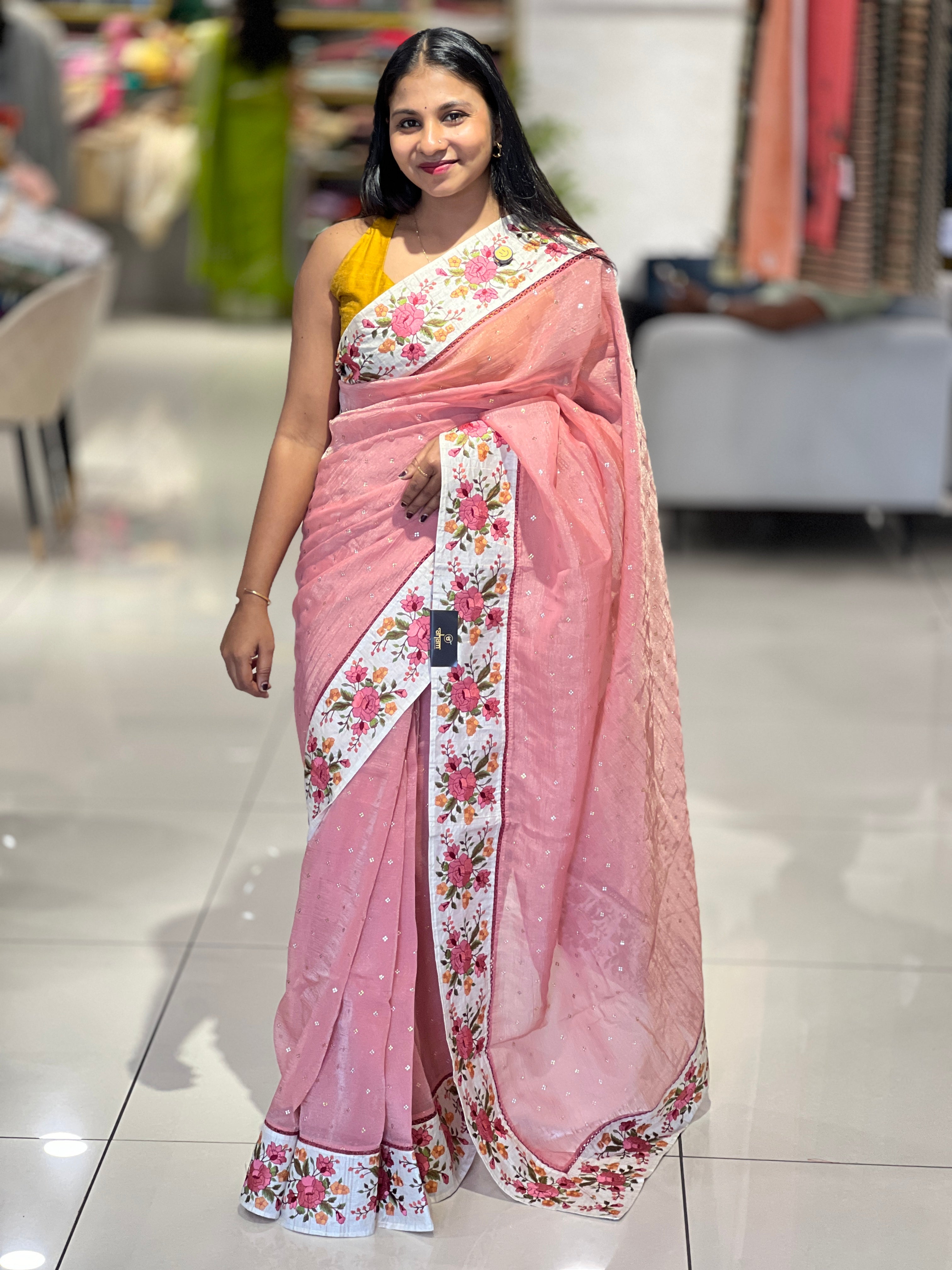 - Style: Mukaish Work Detailing, Floral Patterned Satin Stitch Border Highlighted With Lace Finish