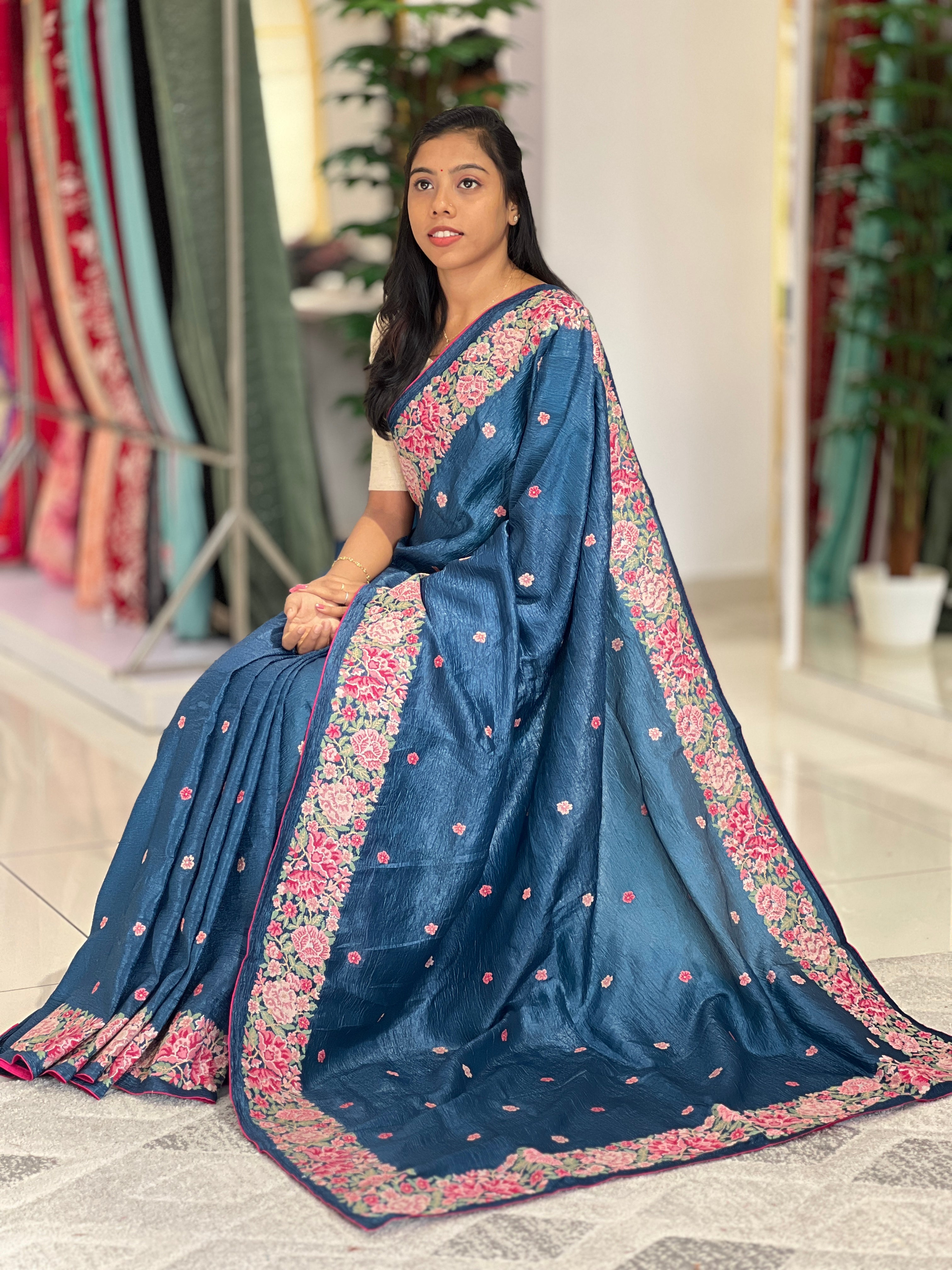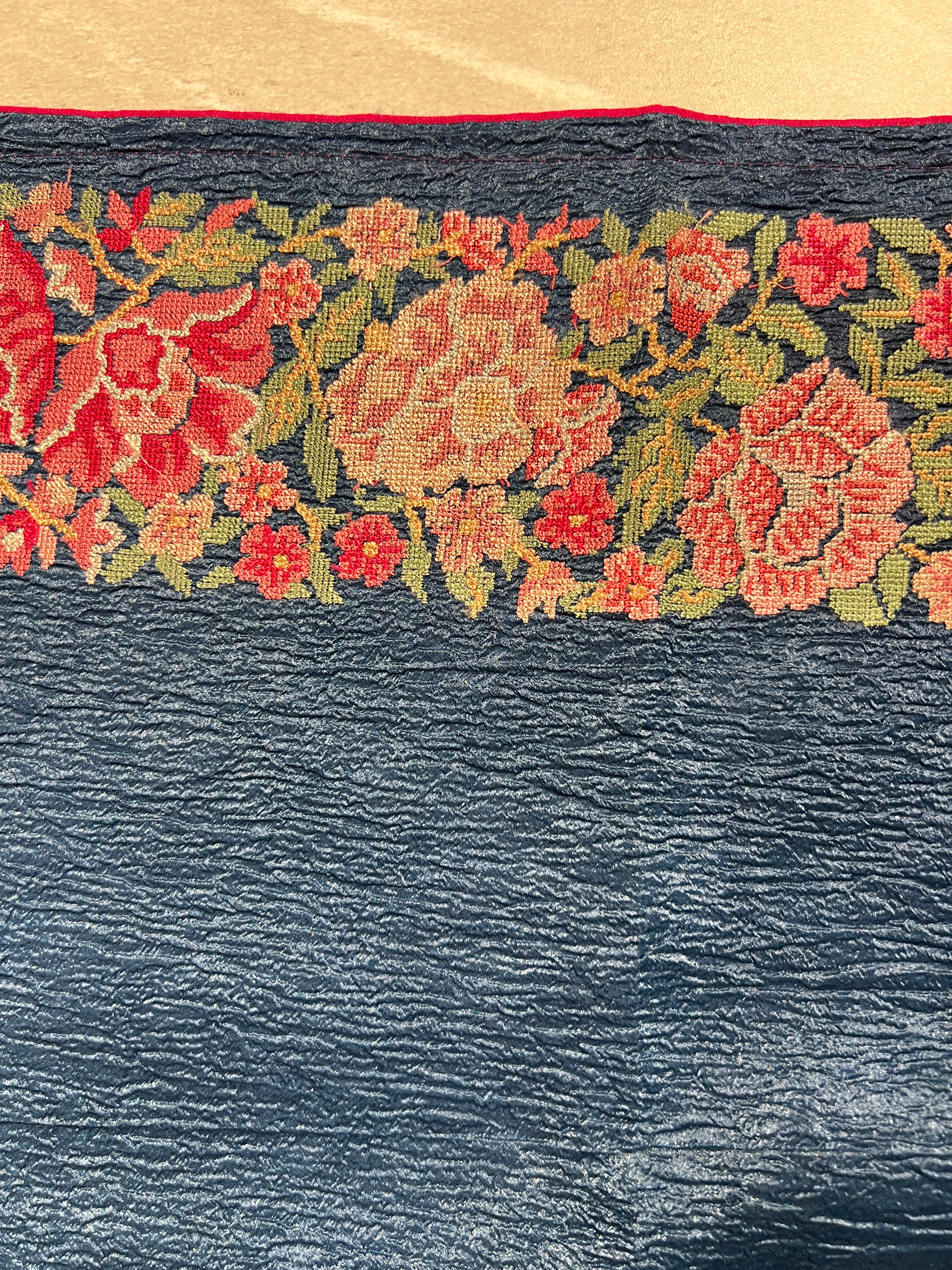 - Style: Computerized Machine Embroidery, Scattered Floral Buta, Multi-Color Floral Cross Stitch Embroidered Borders, Flat Facing Finished Edges