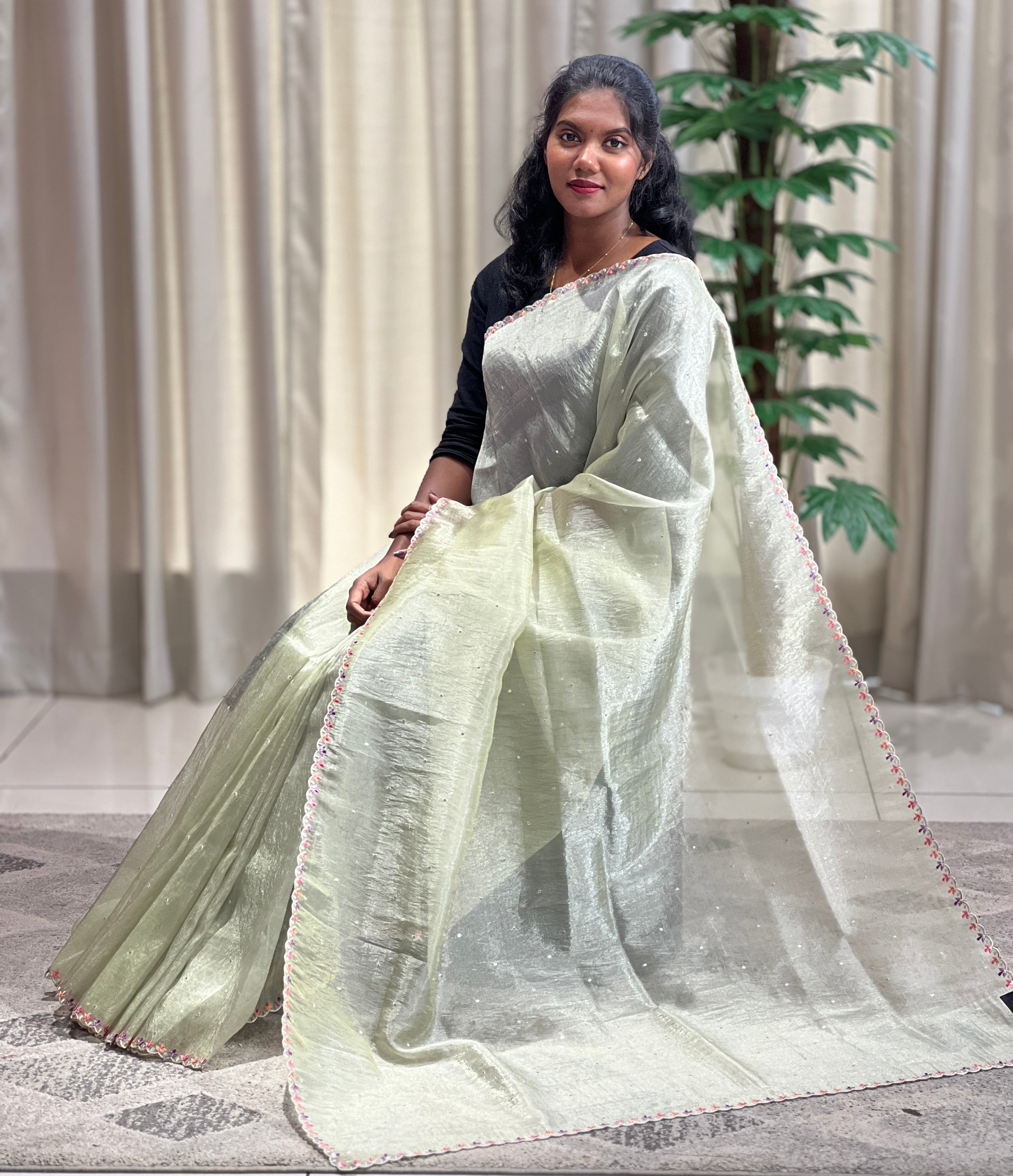 - Style: Embroidery Pattern, Multi-colour Thread Floral Border Detailing, Scallop Finish