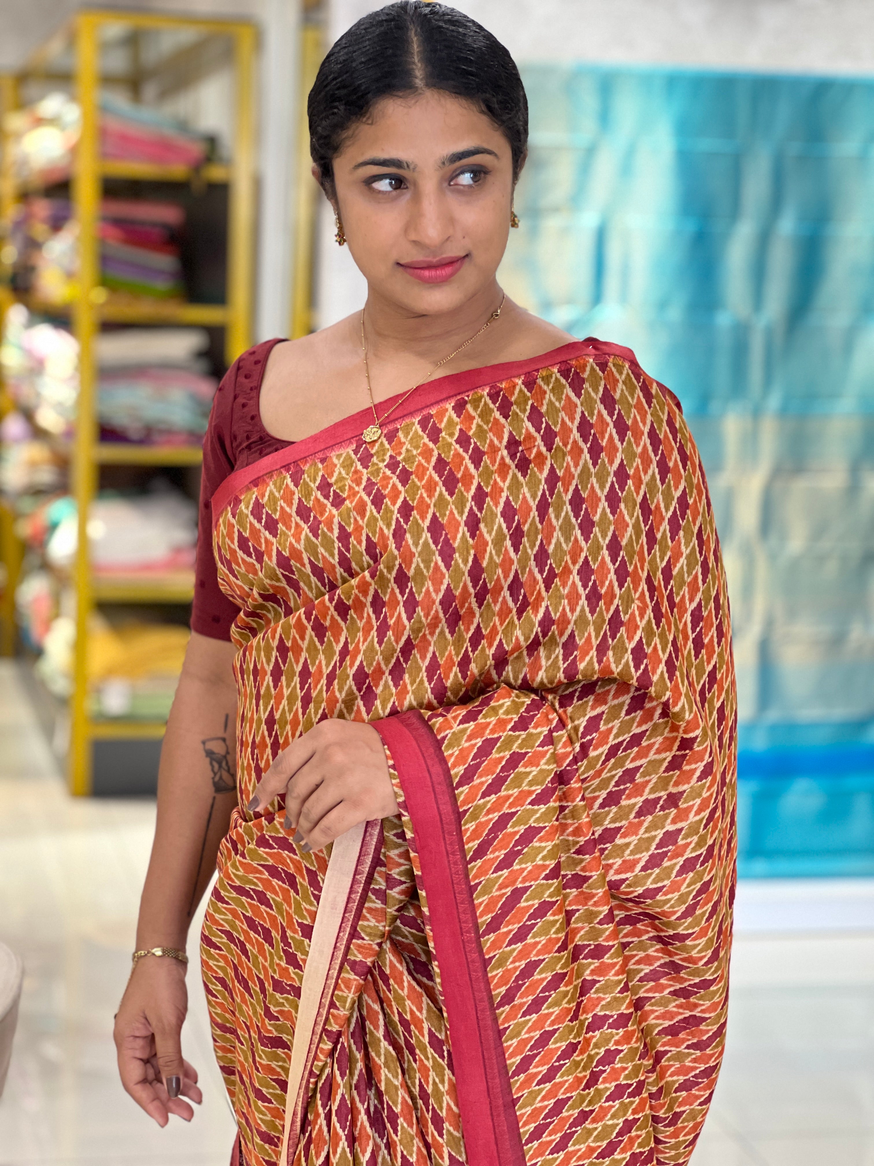 - Style: Vidarbha Weaving Pattern, Temple Border, Screen Printed