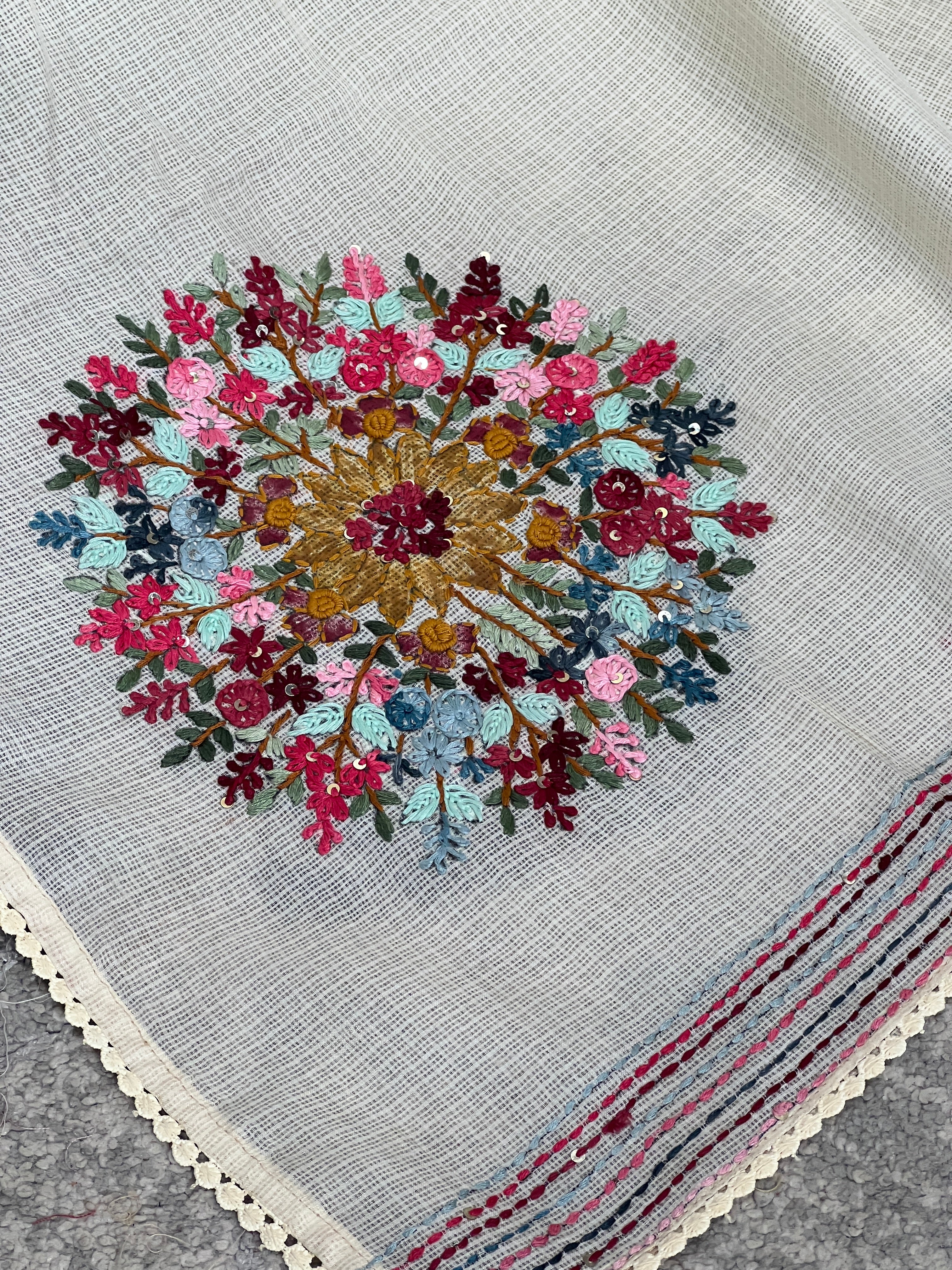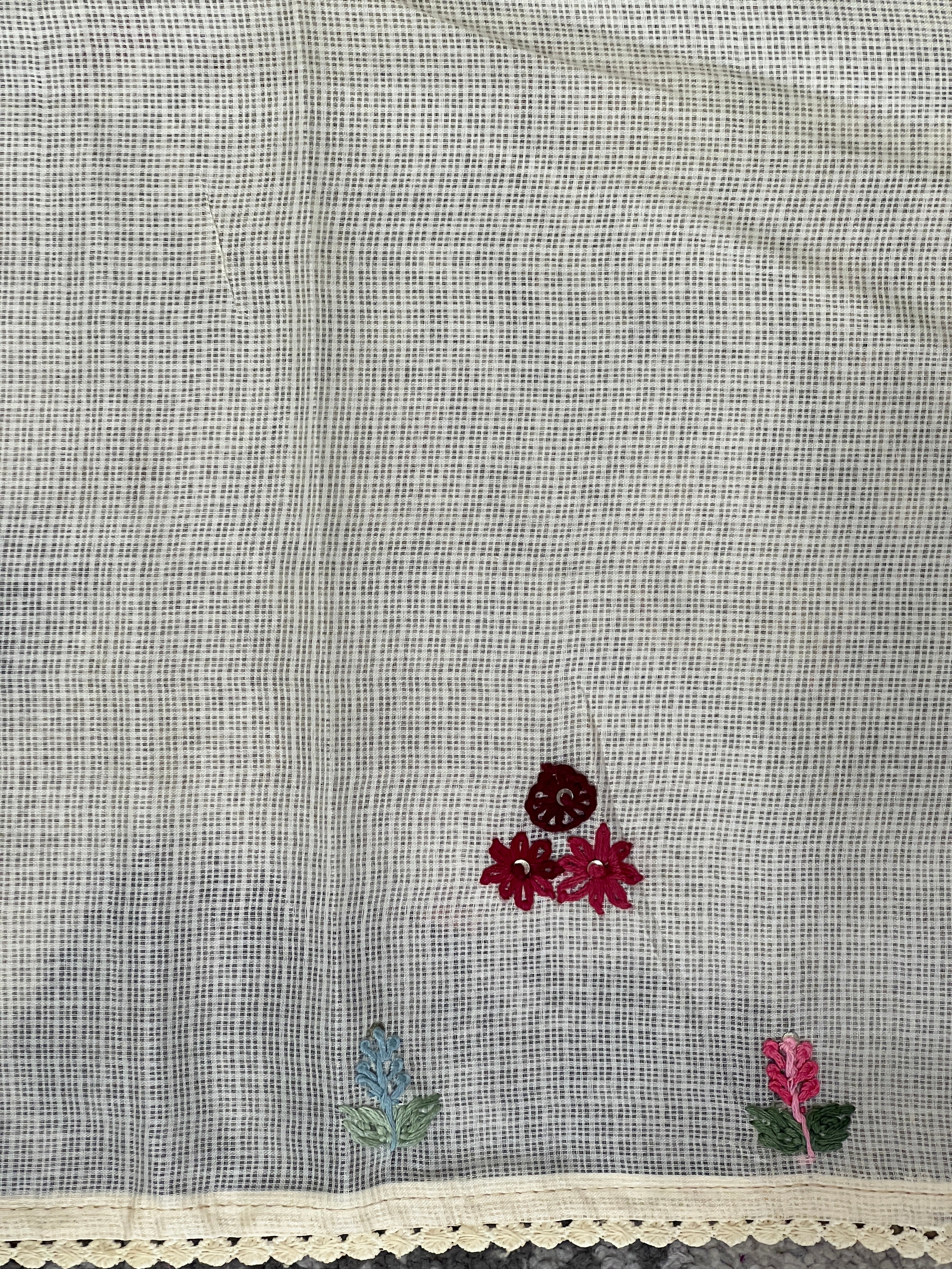 • Style: Multicolour Floral Embroidery, Painted Look, Scattered Floral Motif, Kantha Detailing On Pallu, Lace Detailing