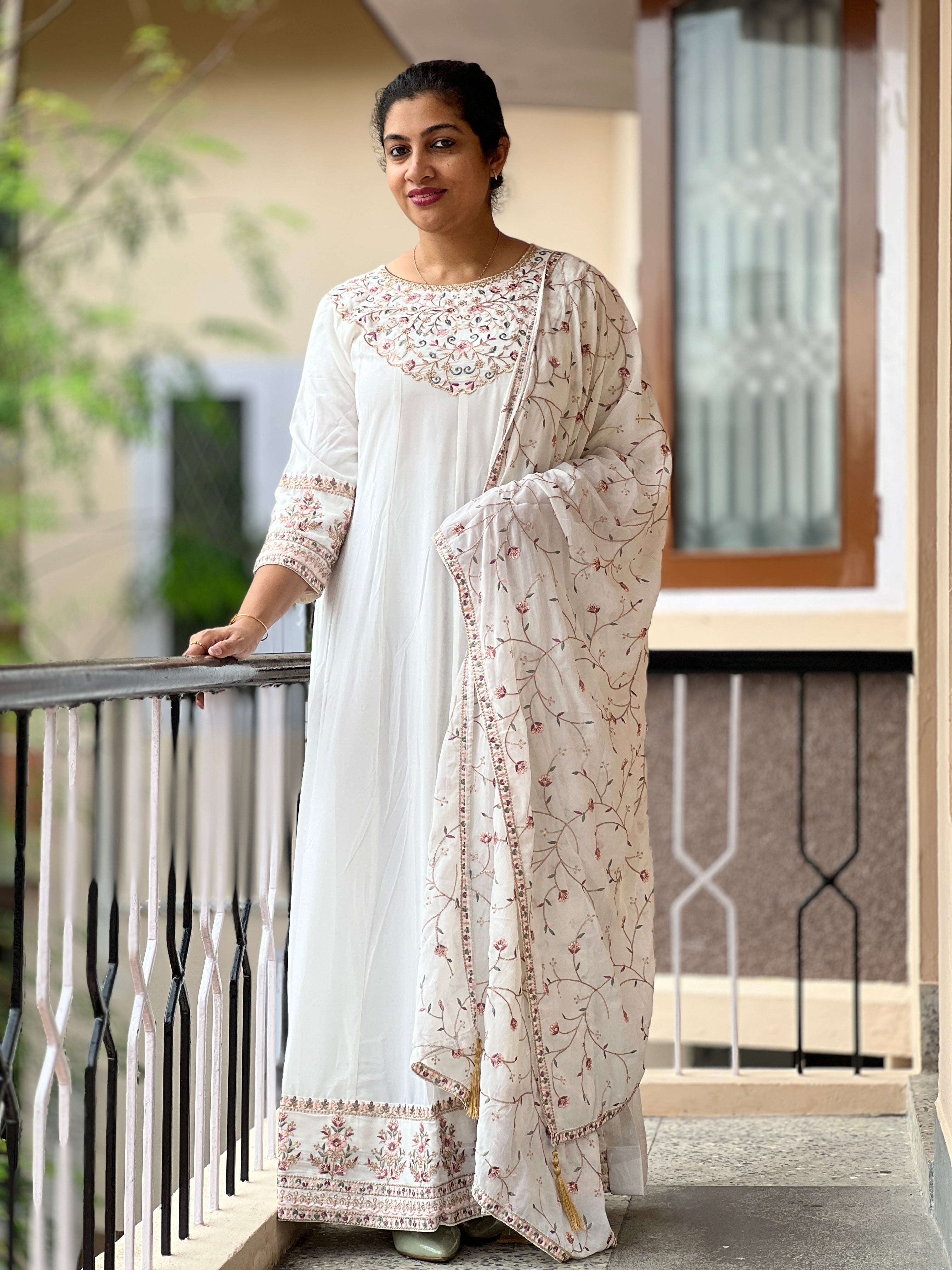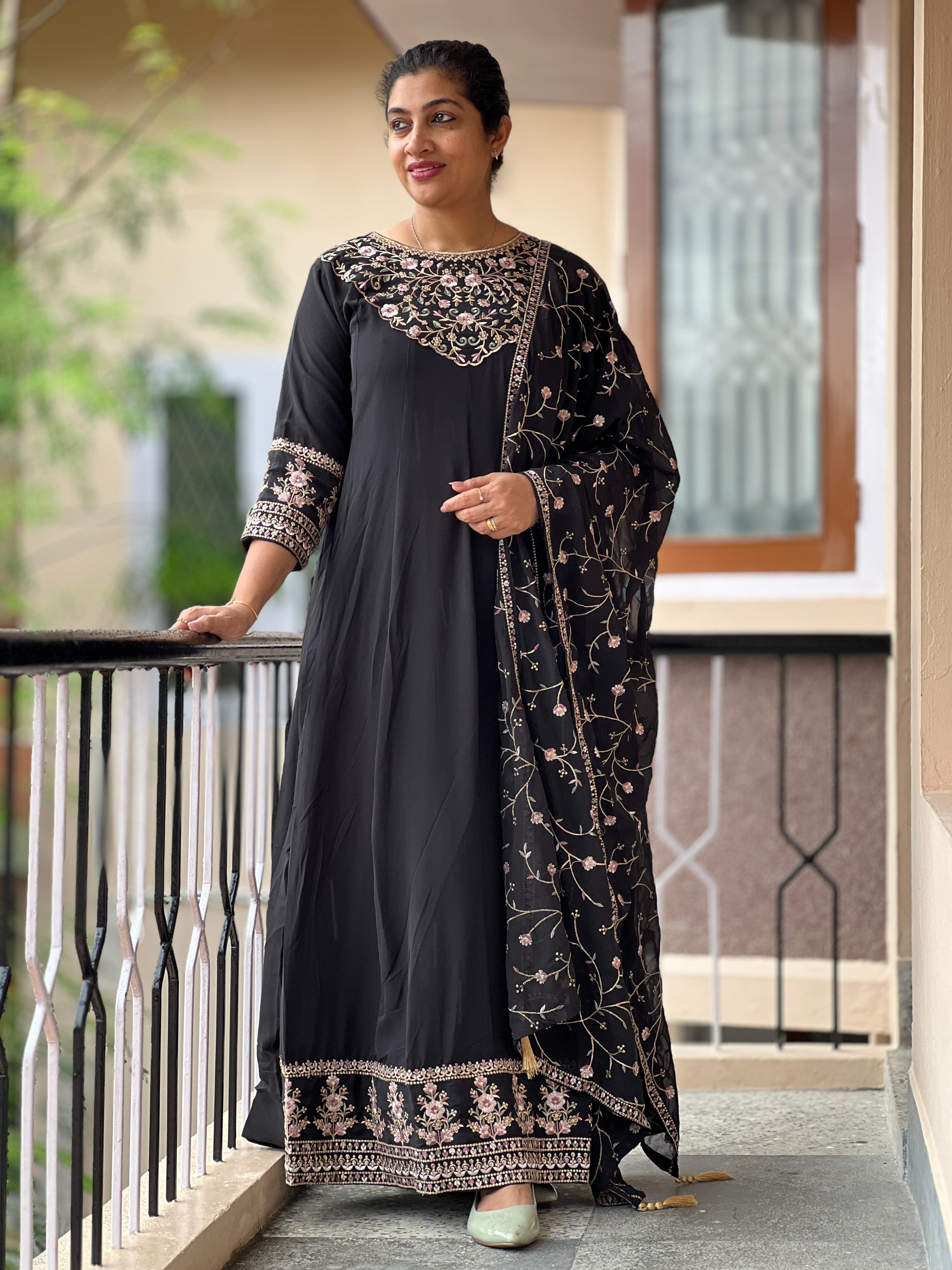 Budget-friendly georgette stitched Anarkali Kurta set. Embroidery design entirely in the yoke with scallop pattern,semi boat neck .fully work strategy in lower portion same border design in sleeve edge. Rich dupatta with jhal pattern