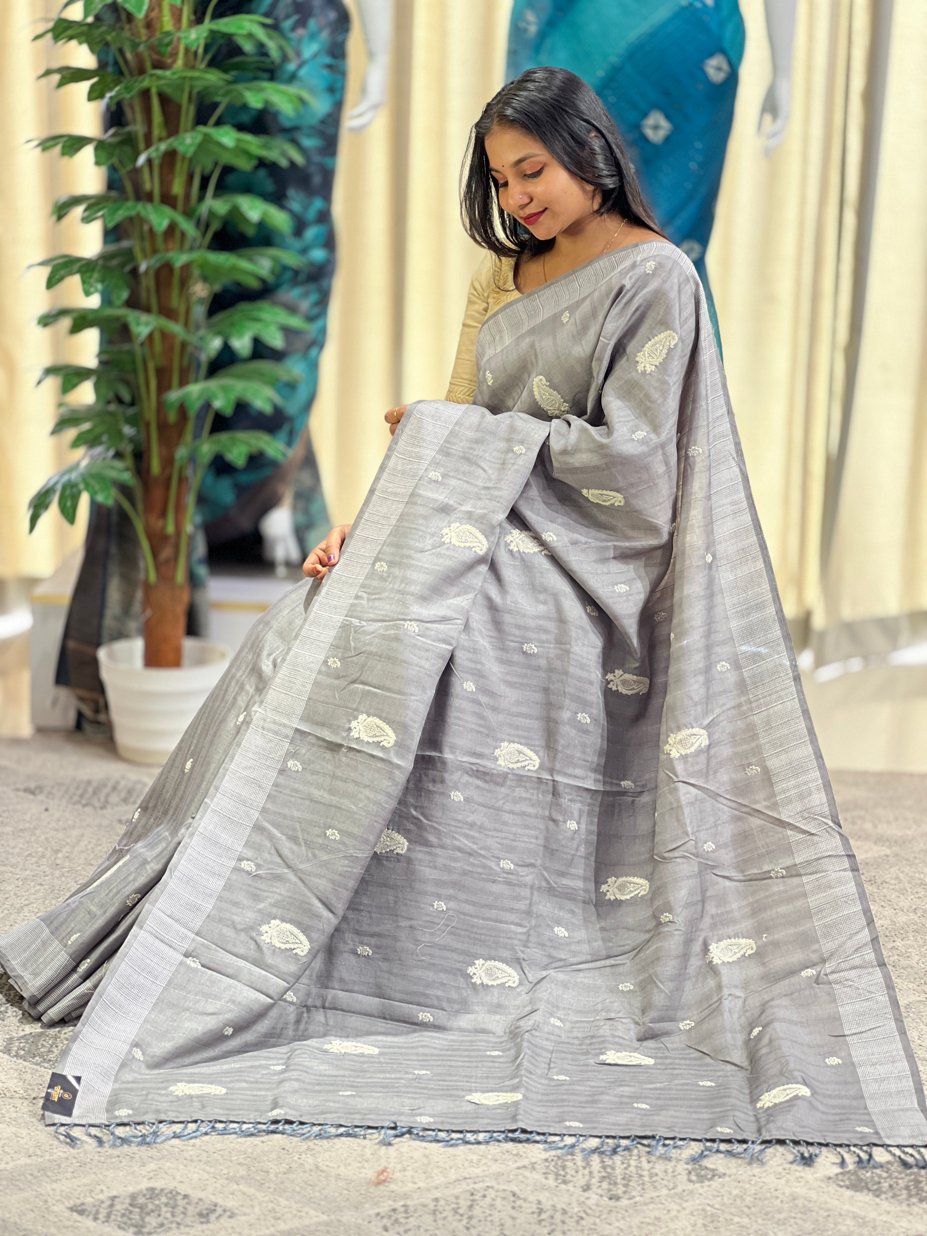 • Paisley Machine Embroidery Detailed Semi Tussar Saree | SUN299