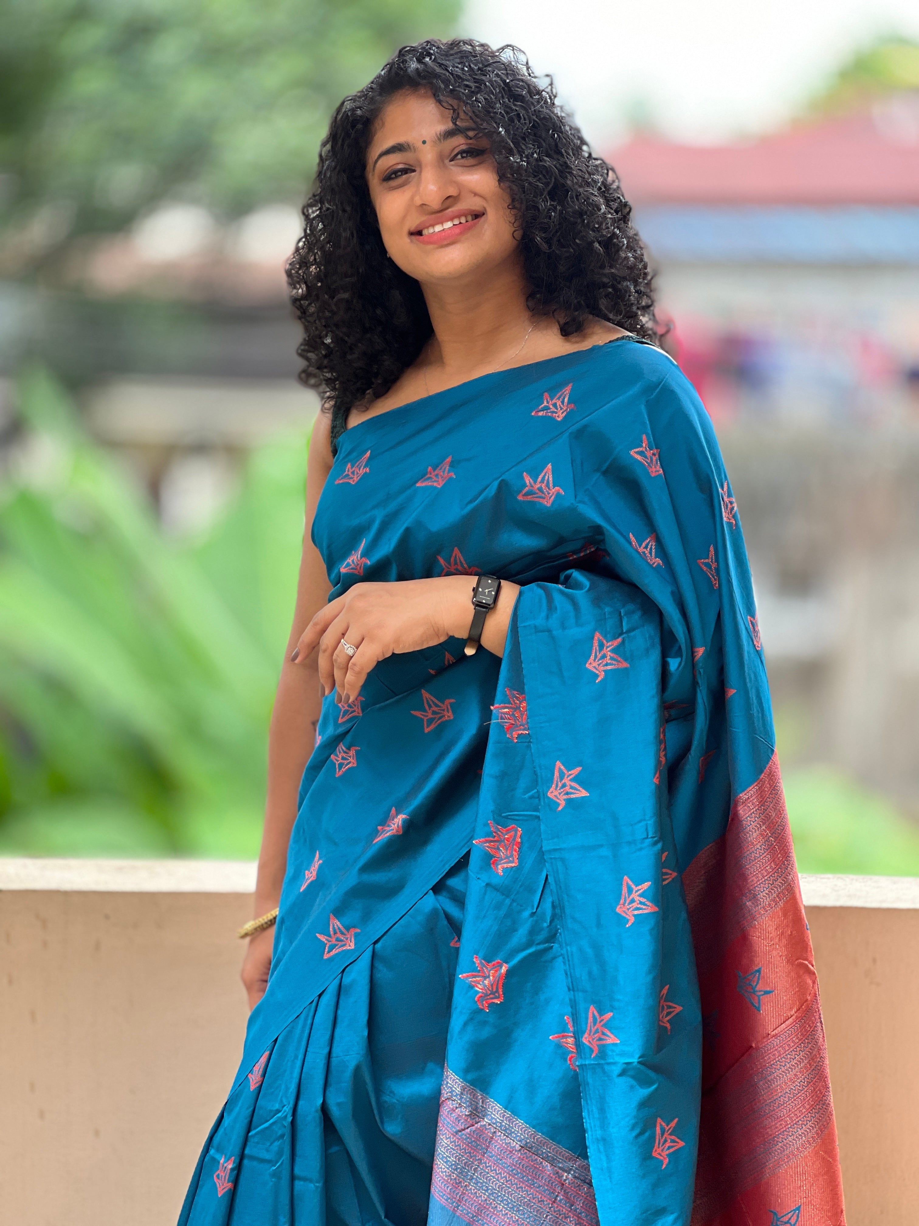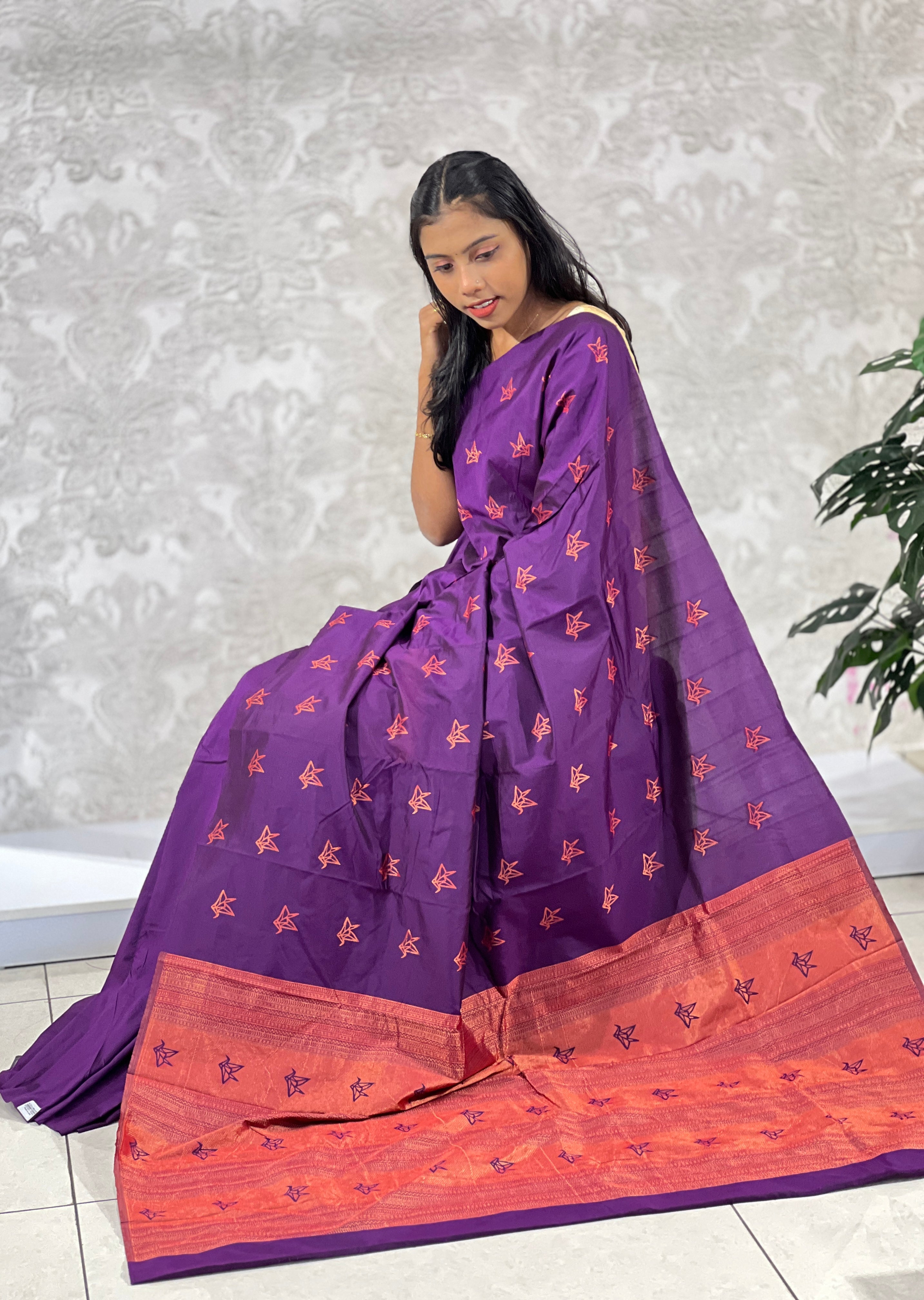 - Style: Origami Inspired Antique Zari Butas, Organish Copper Finished Pallu