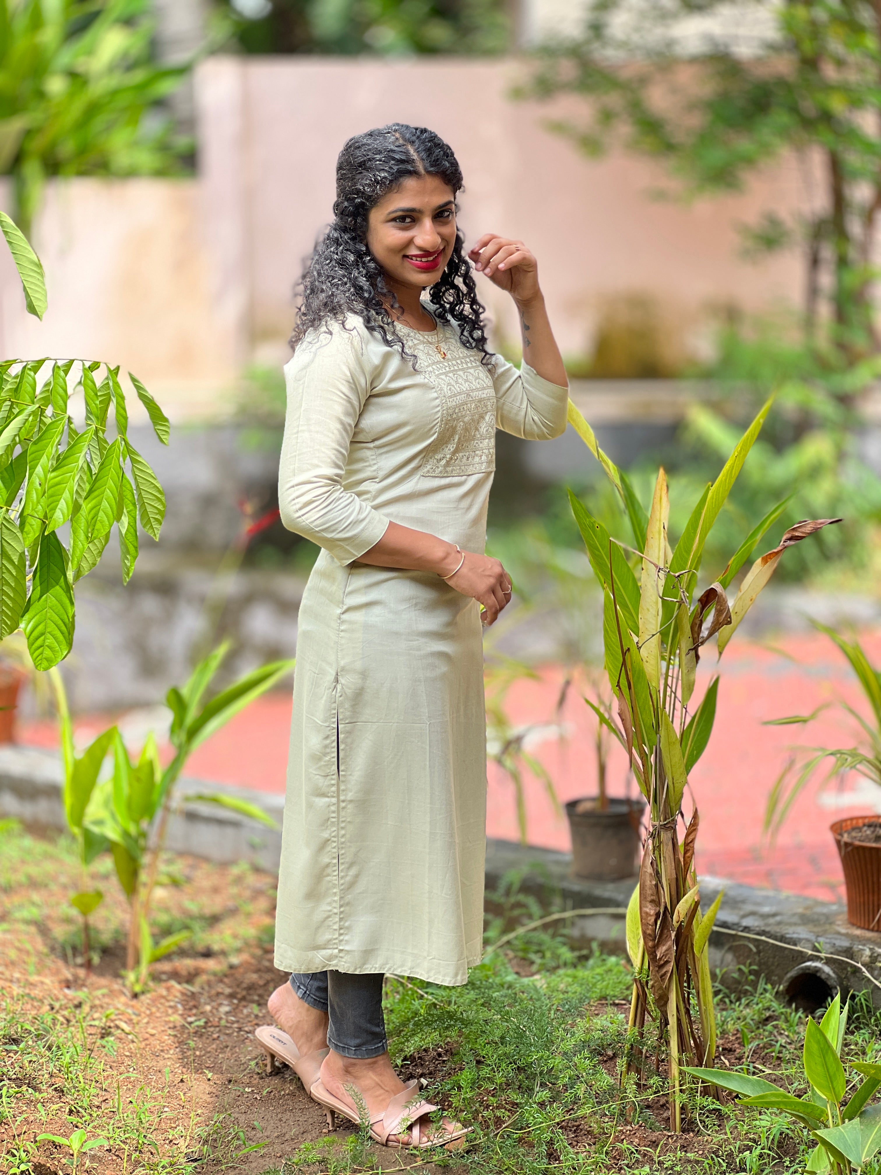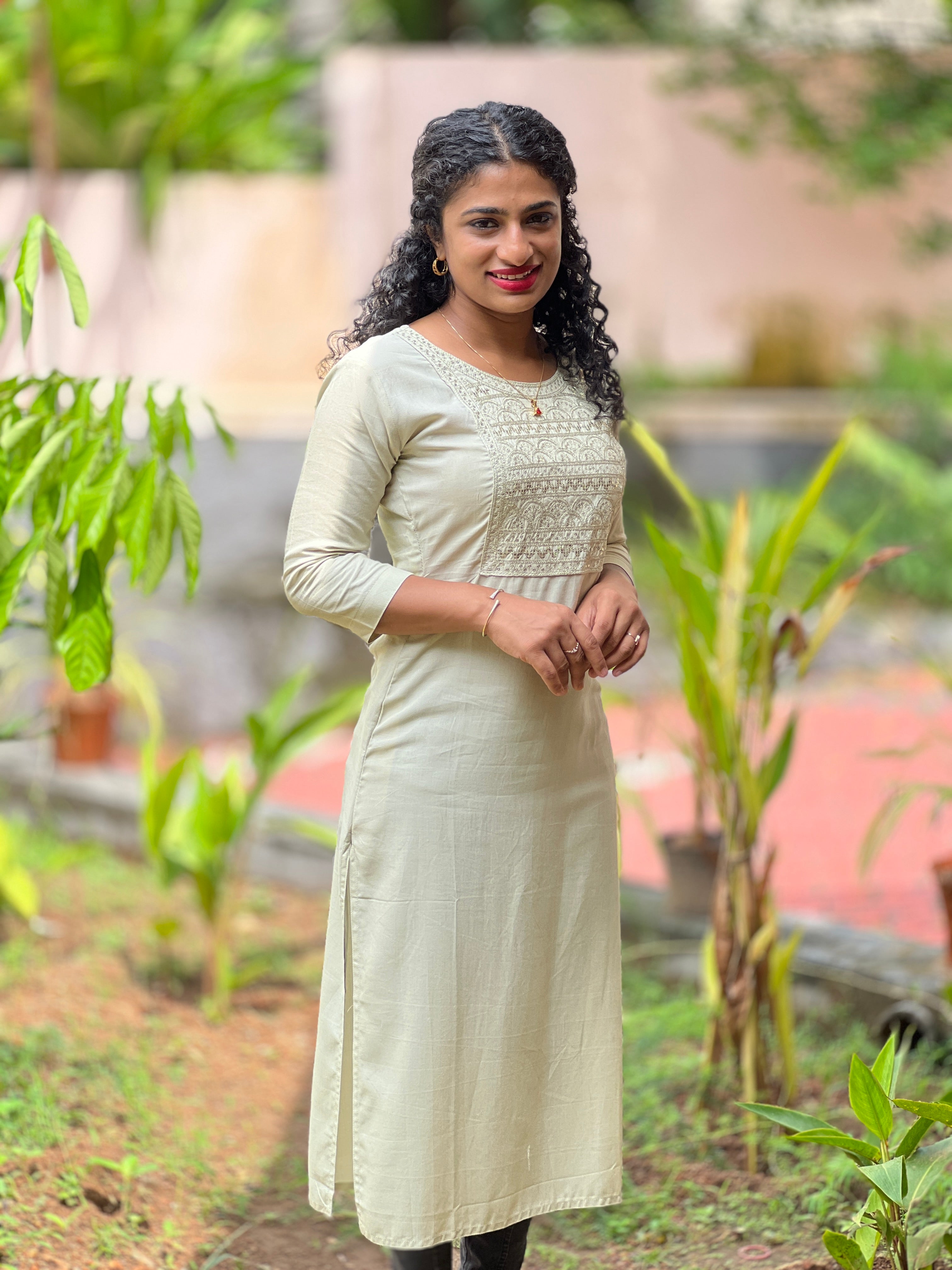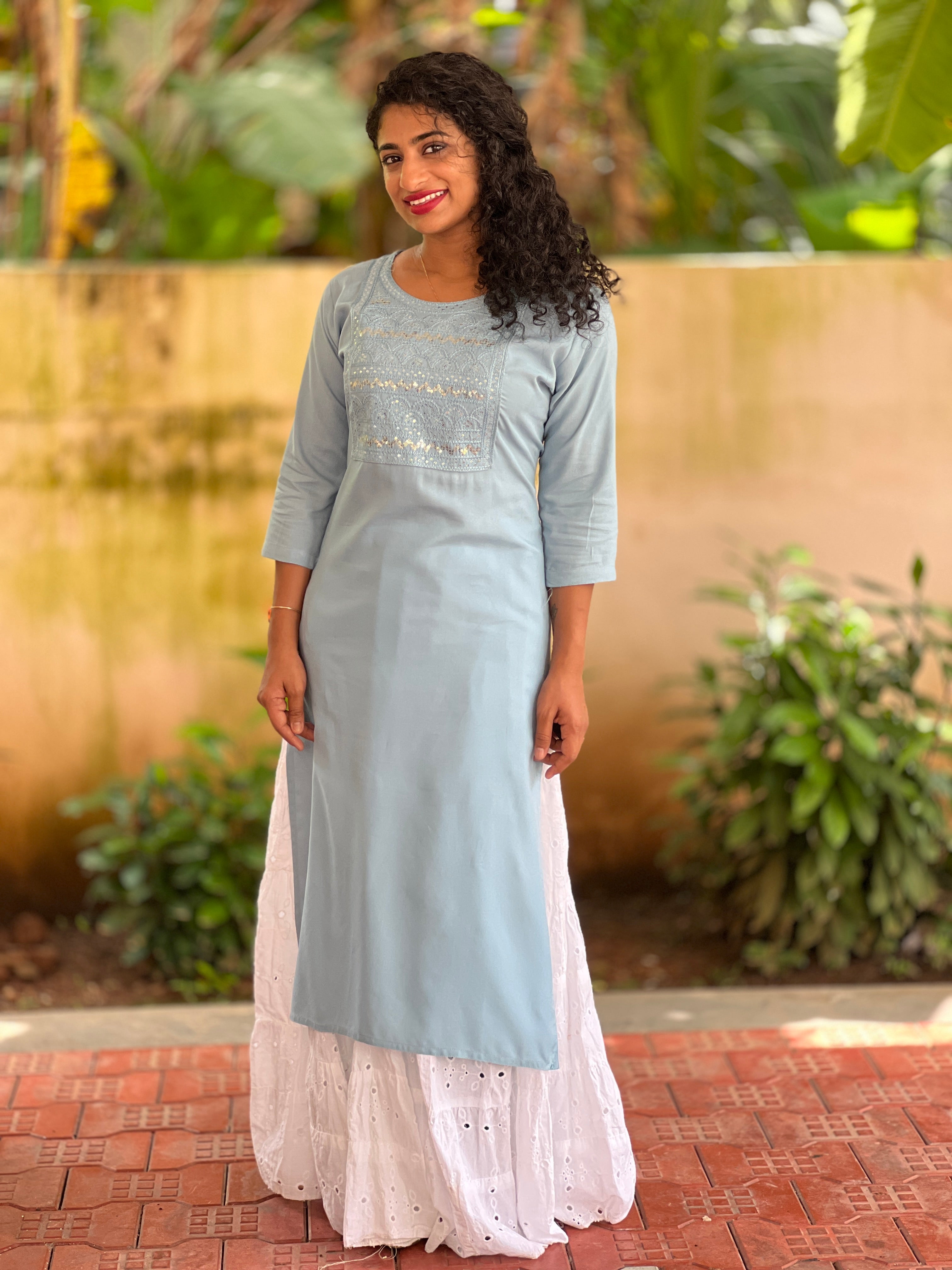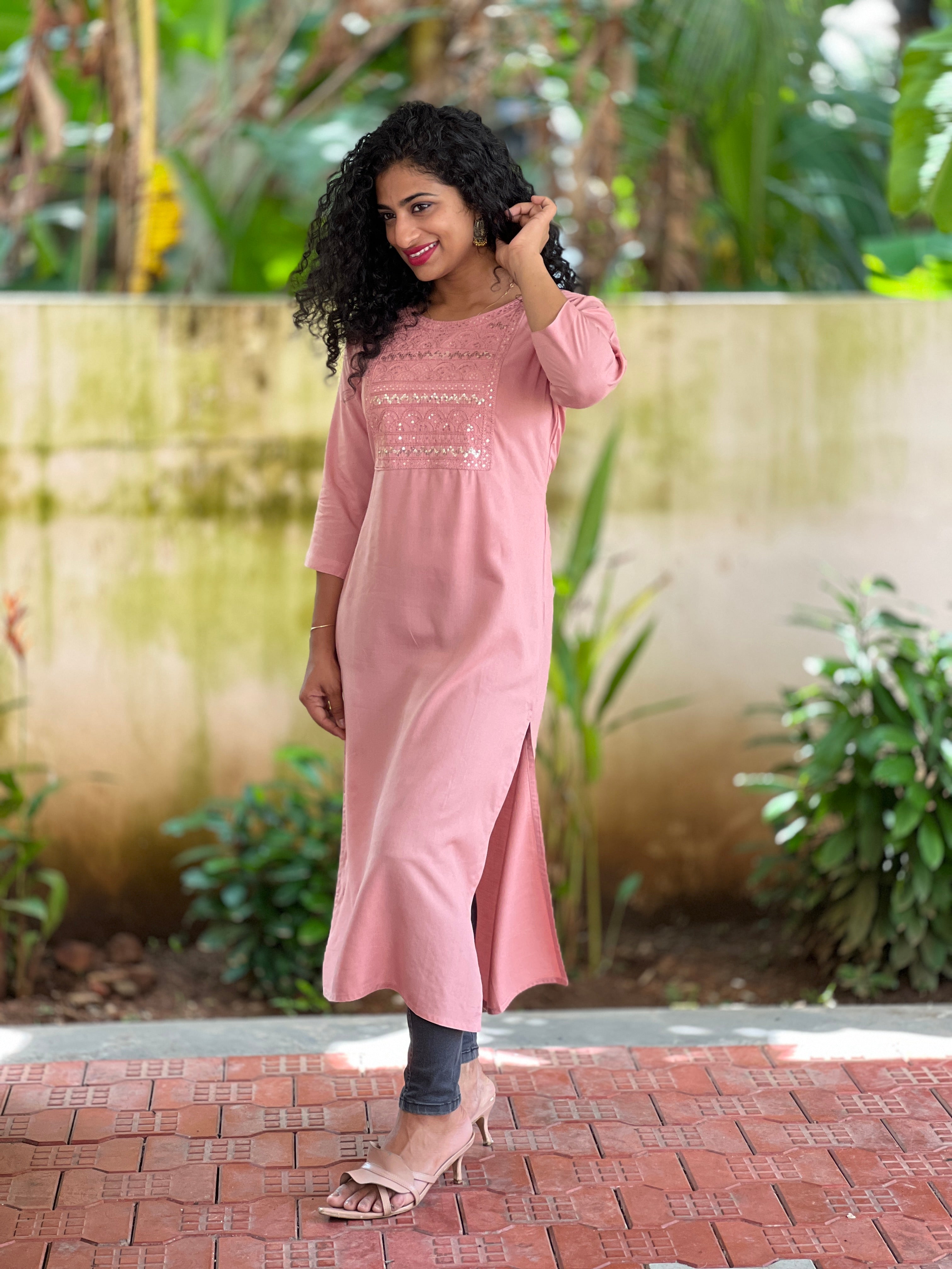 Pastel Rayon Kurtas with computerized machine-embroidered zig-zag patterns in the yoke region with sequence work without lining and with pockets.