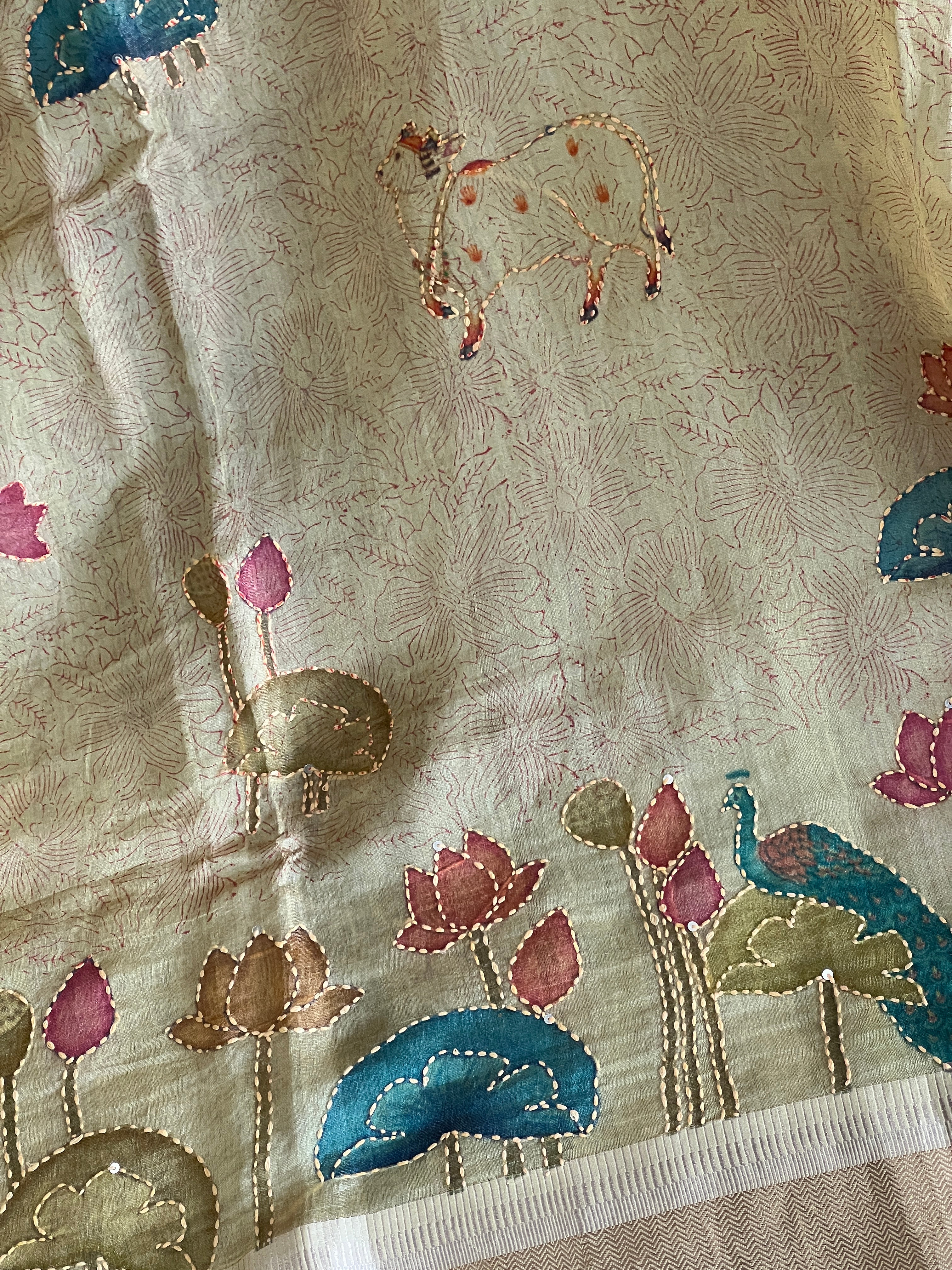 - Style: Pichwai Inspired Digital Print With Kantha Embroidery Highlight, Zari Borders With Zig Zag Pattern, Kantha Embroidered Pallu