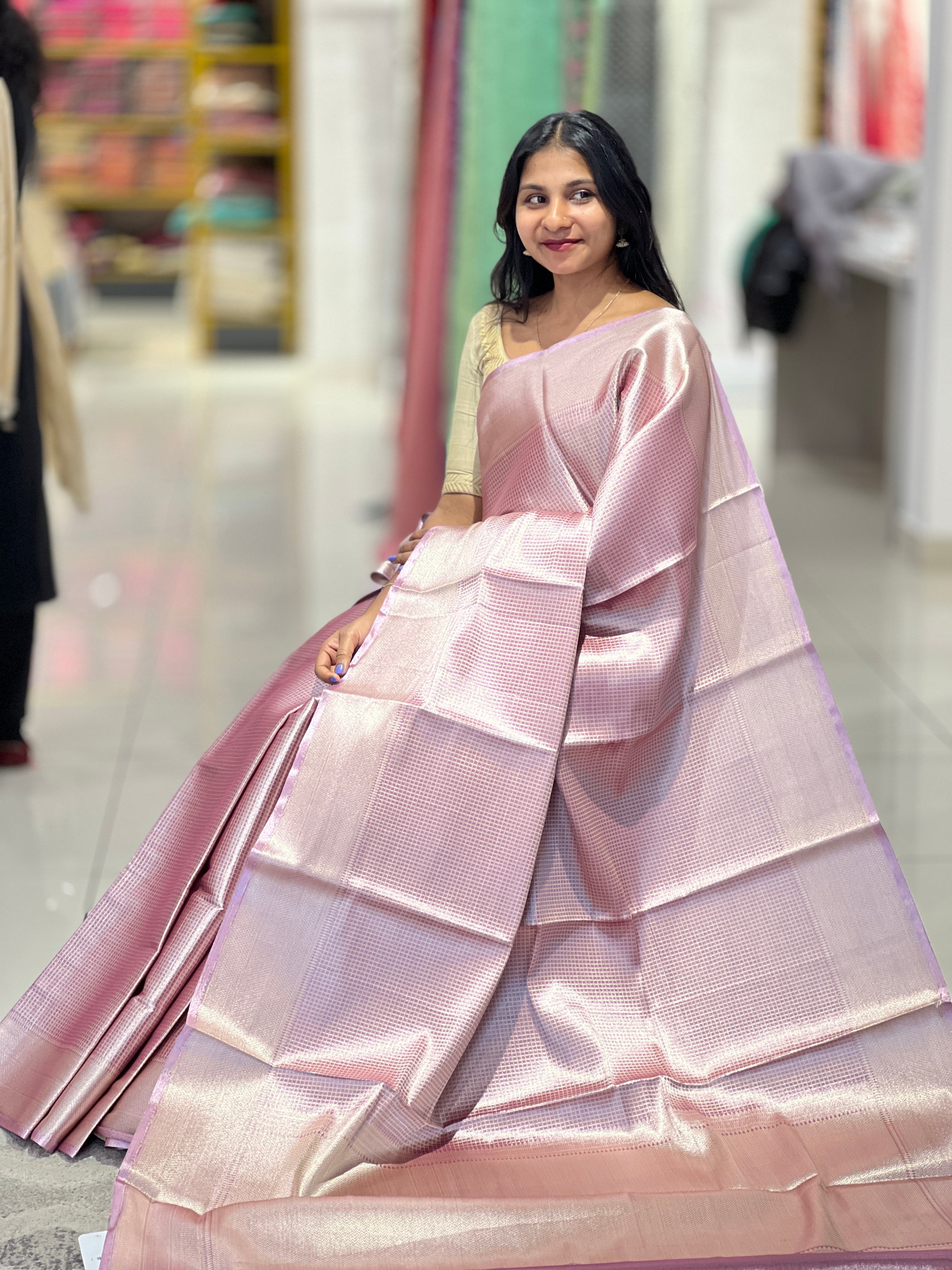 - Style: Pink & Silver Zari Woven, Check Pattern, Traditional Borders, Zig Zag Patterned Pallu