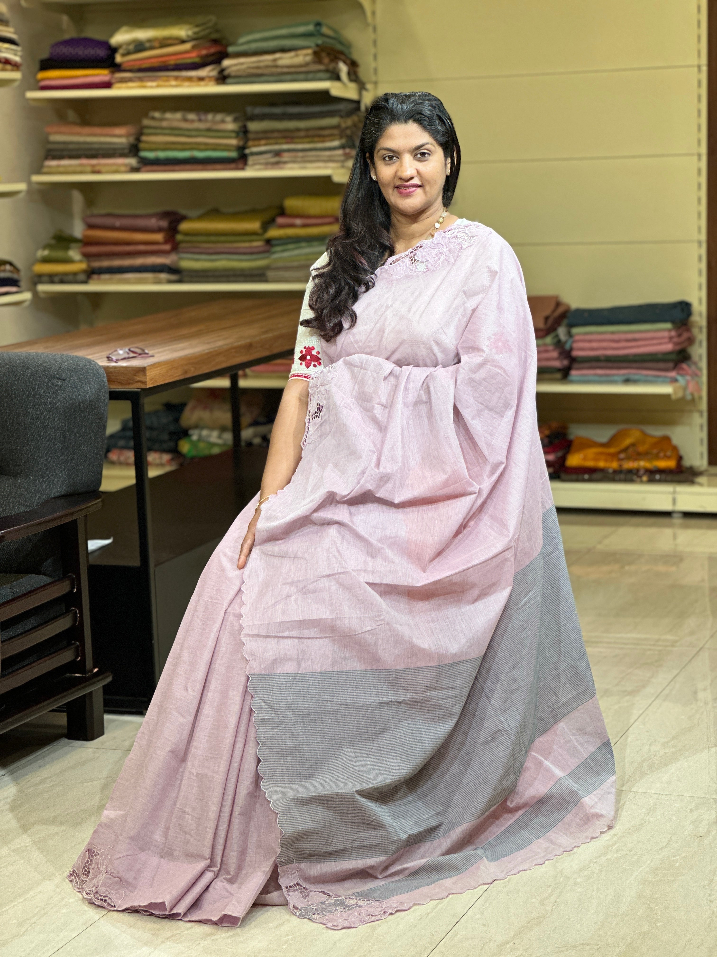 - Style: Placement Twine Cutwork Embroidery (Multi-Color), Scallop Edges, Pallu Stripe Pattern