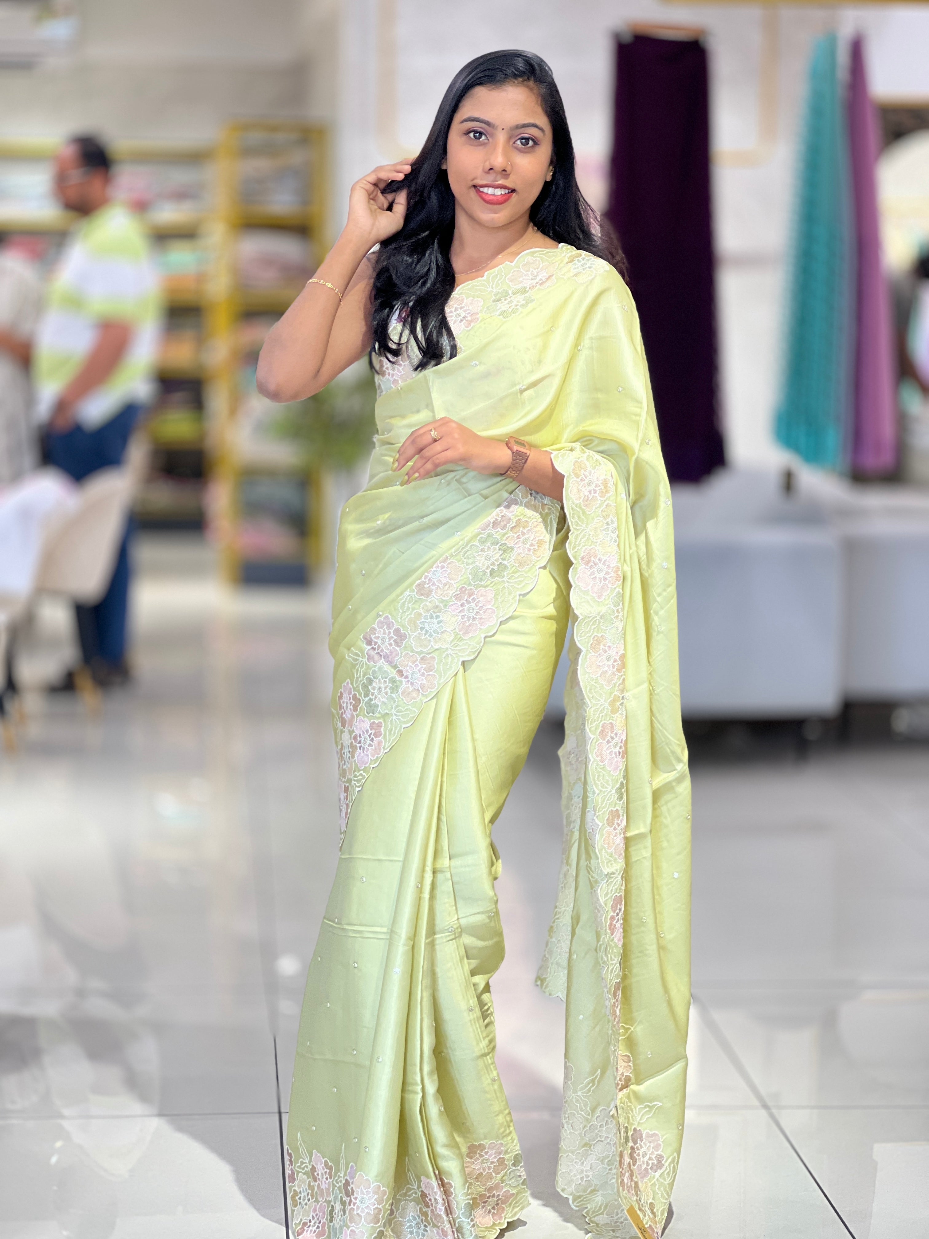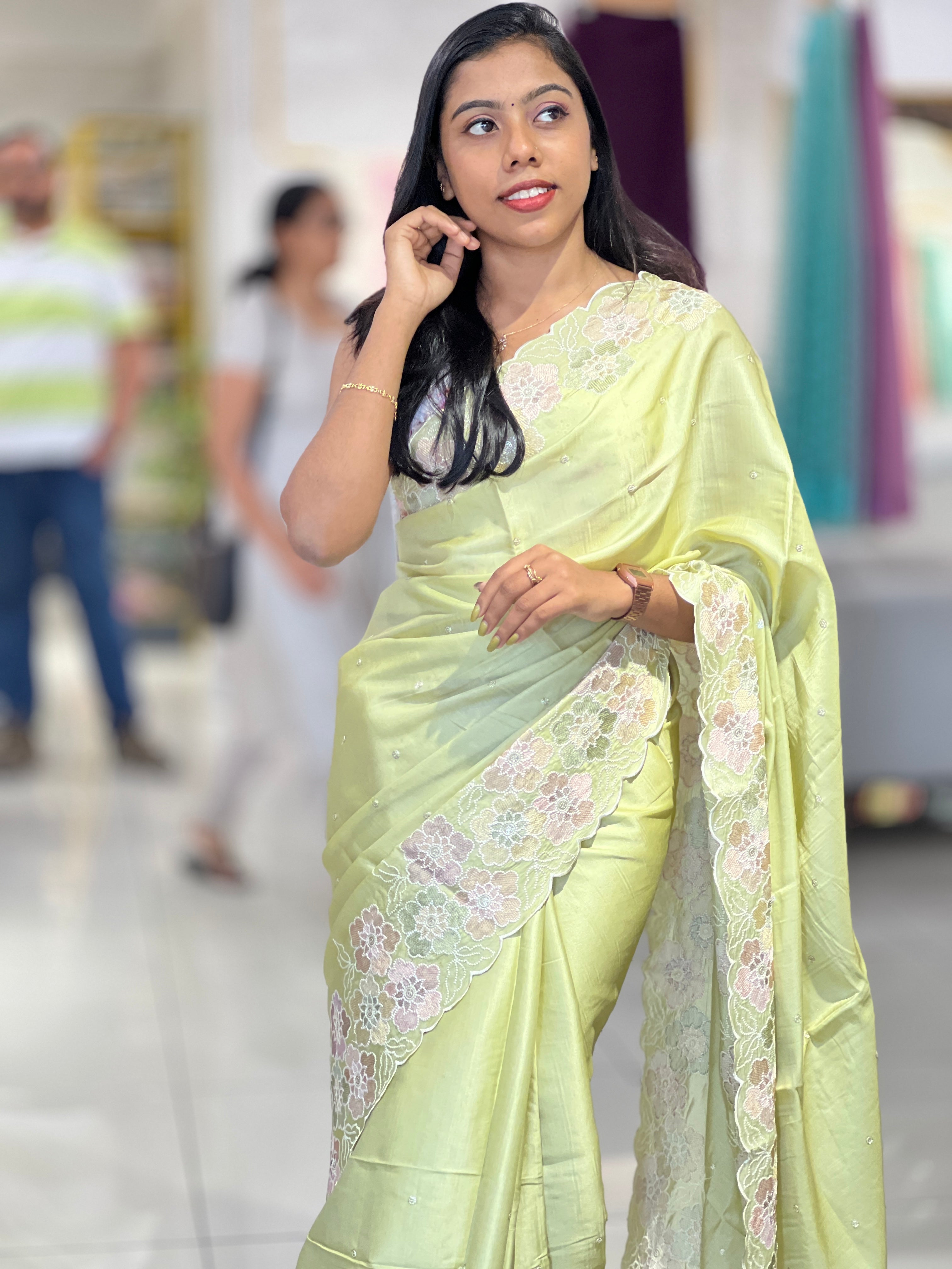 - Style: Point Embroidery, Floral Pattern, Scattered Buttas With Sequence Highlight, Border Detailing, Uneven Scallop Finish