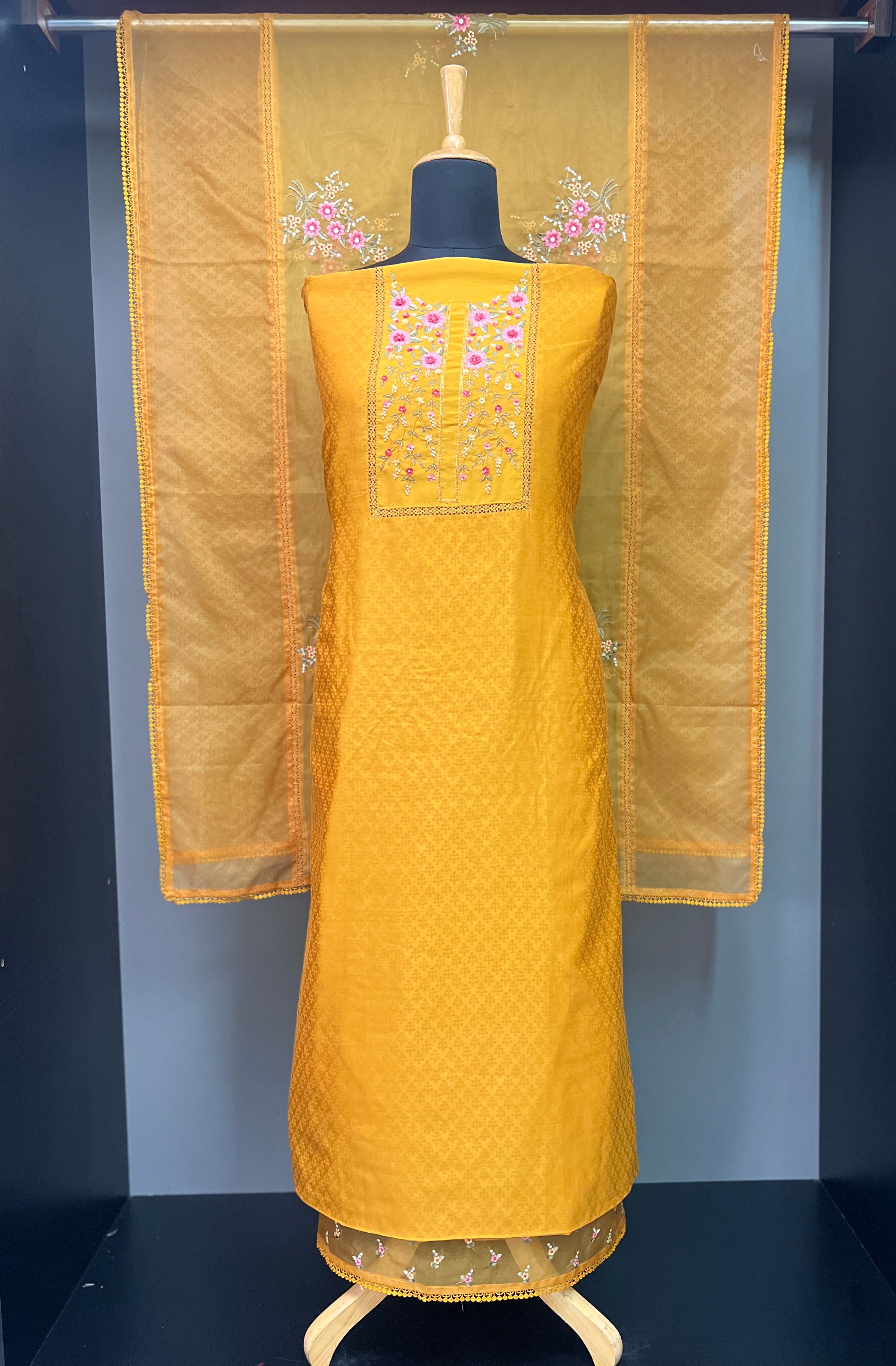- Style: Self Print, Floral Embroidery With Cutbeads Detailed Yoke Portion, Lace Detailing