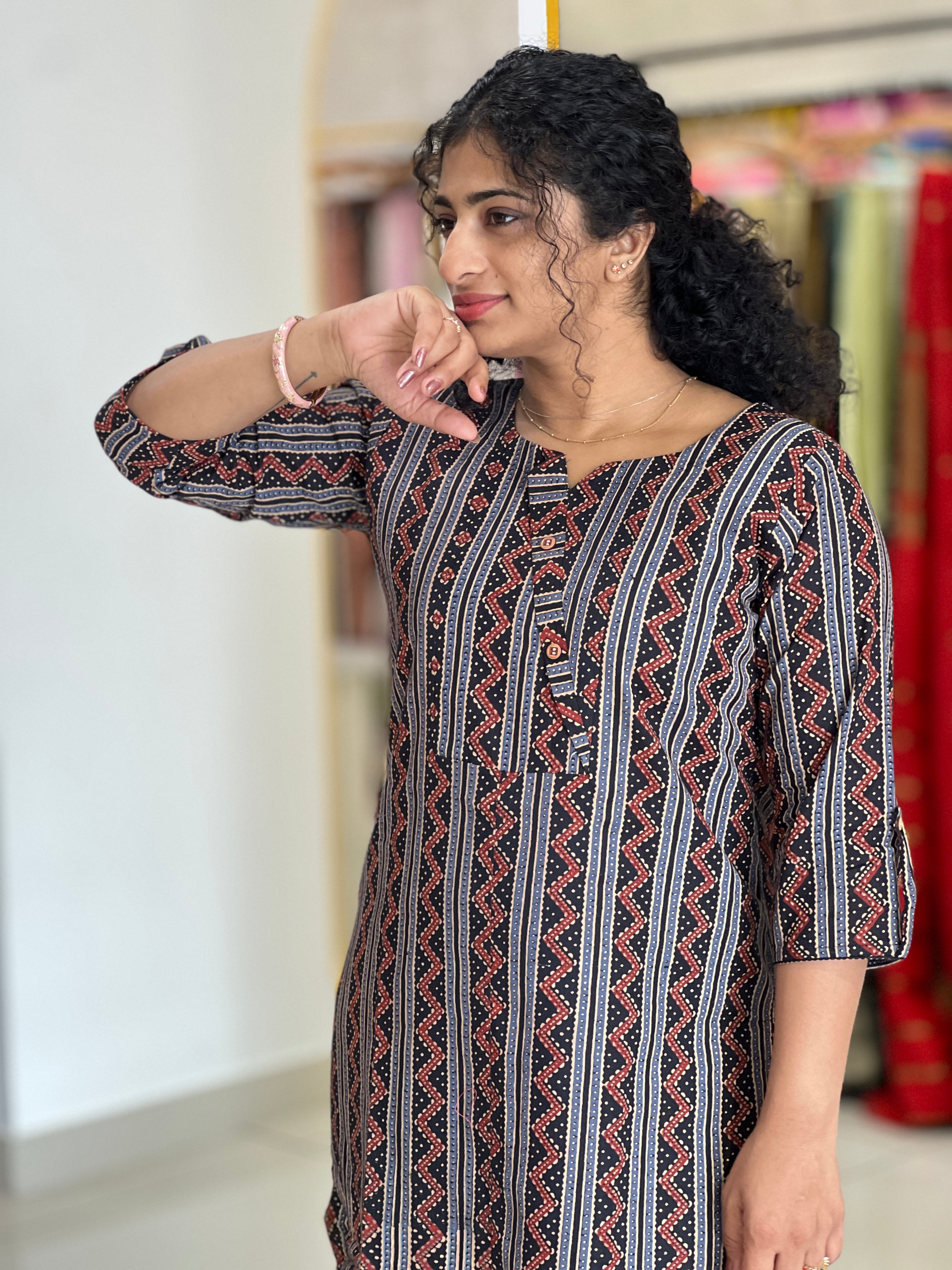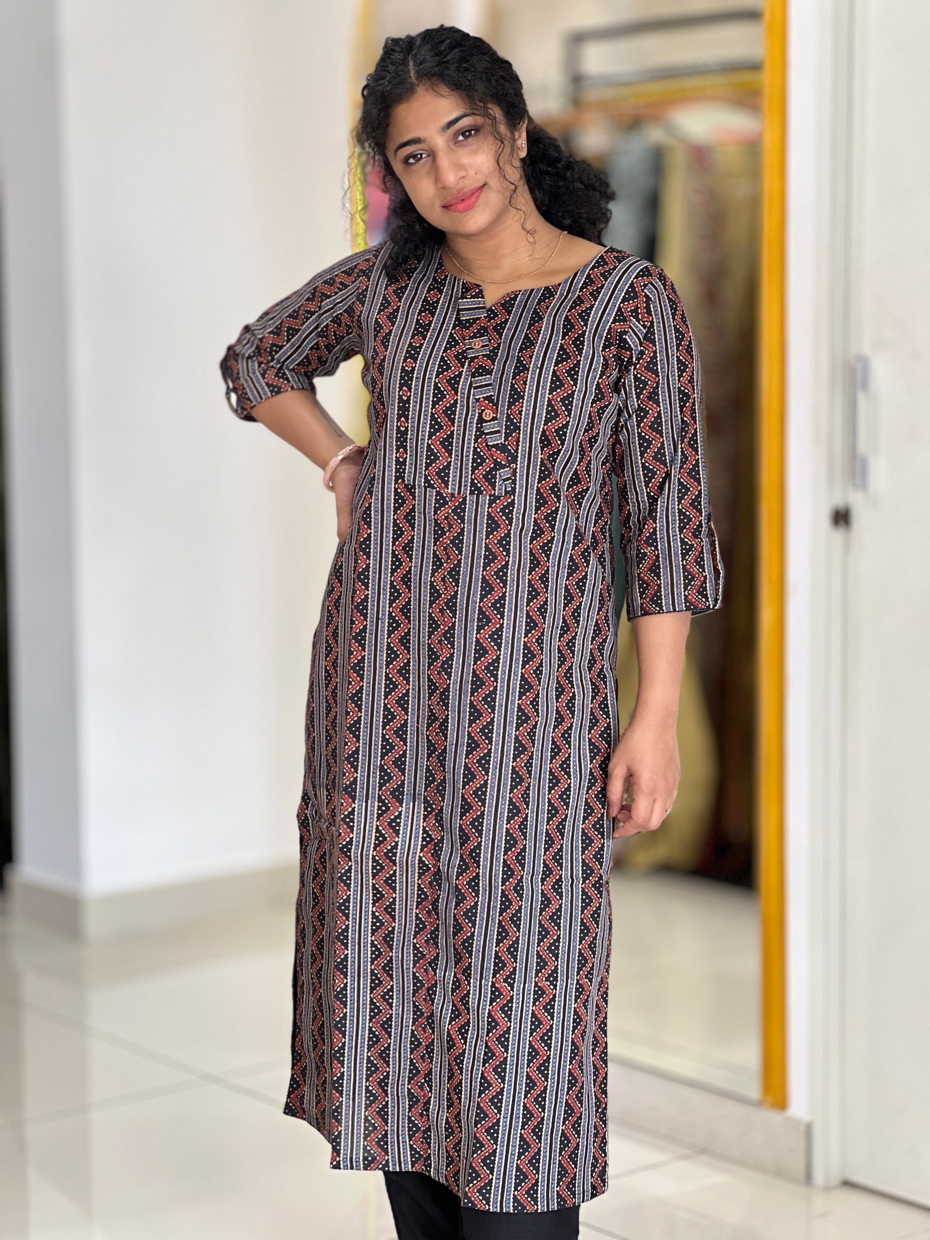 - Style: Vertical With Zig Zag Patterned Print Detailing, With Lining, Tapered Panel Detailing With Buttons Detailing, Side Slitted, Pin Up Detailed Sleeves