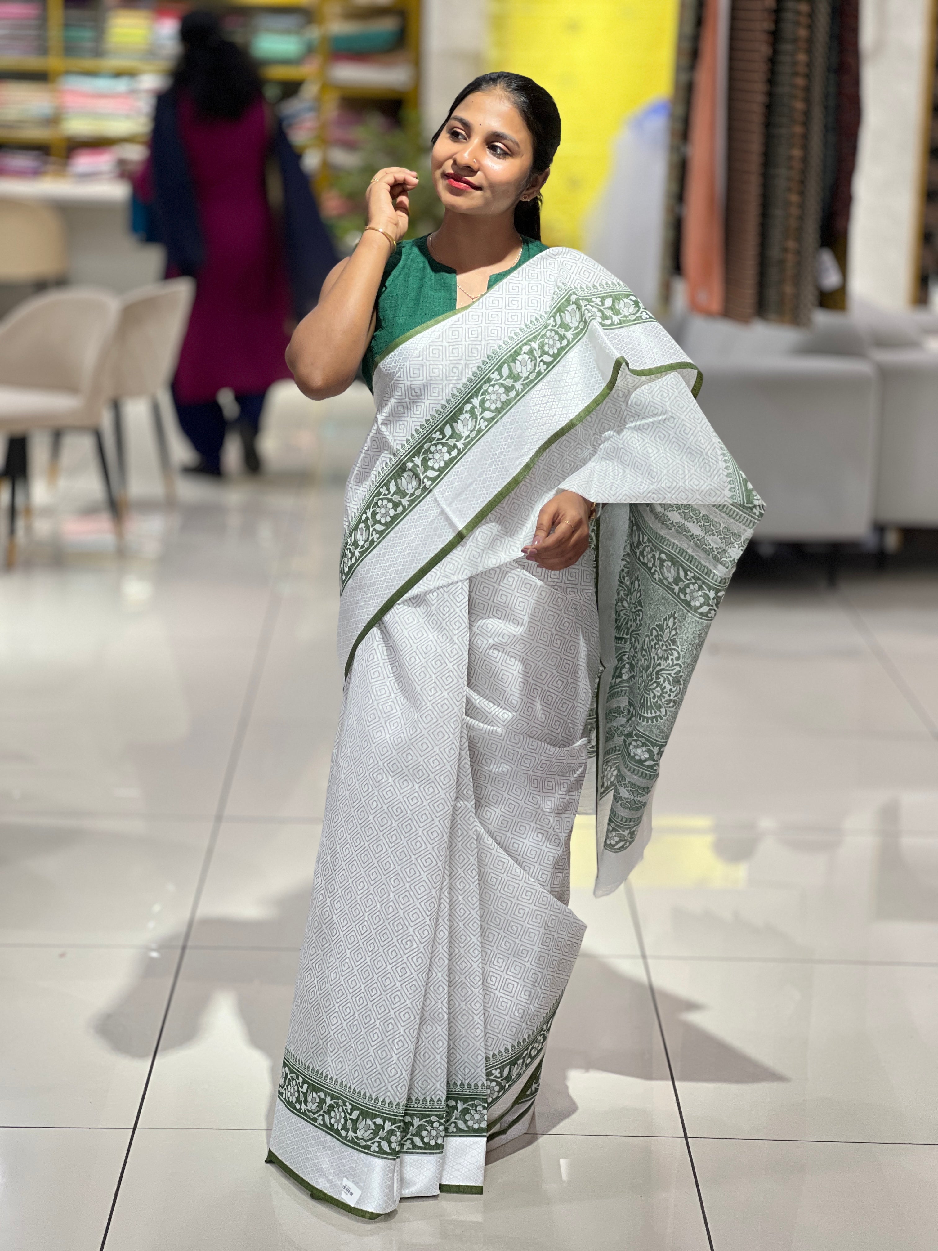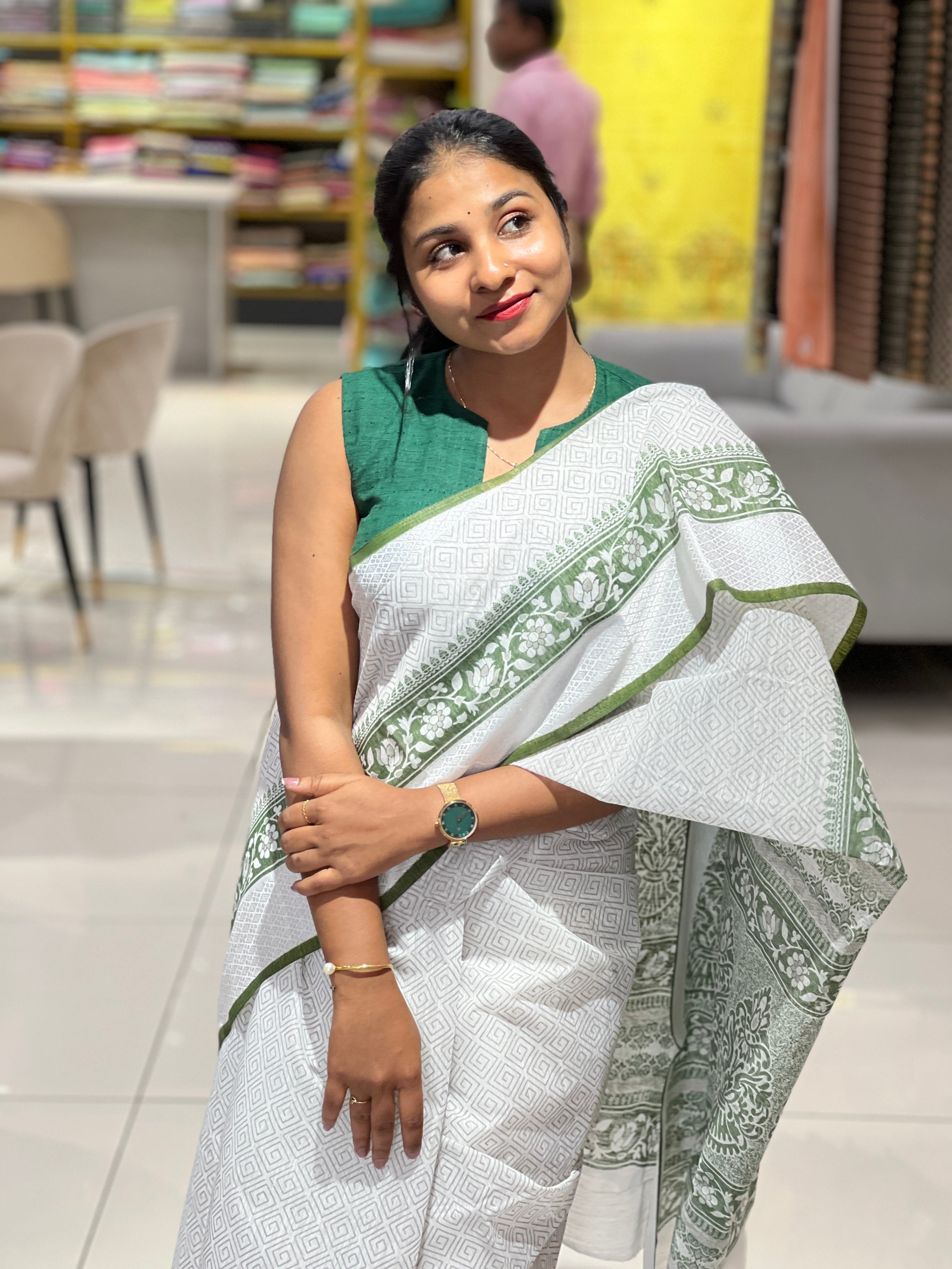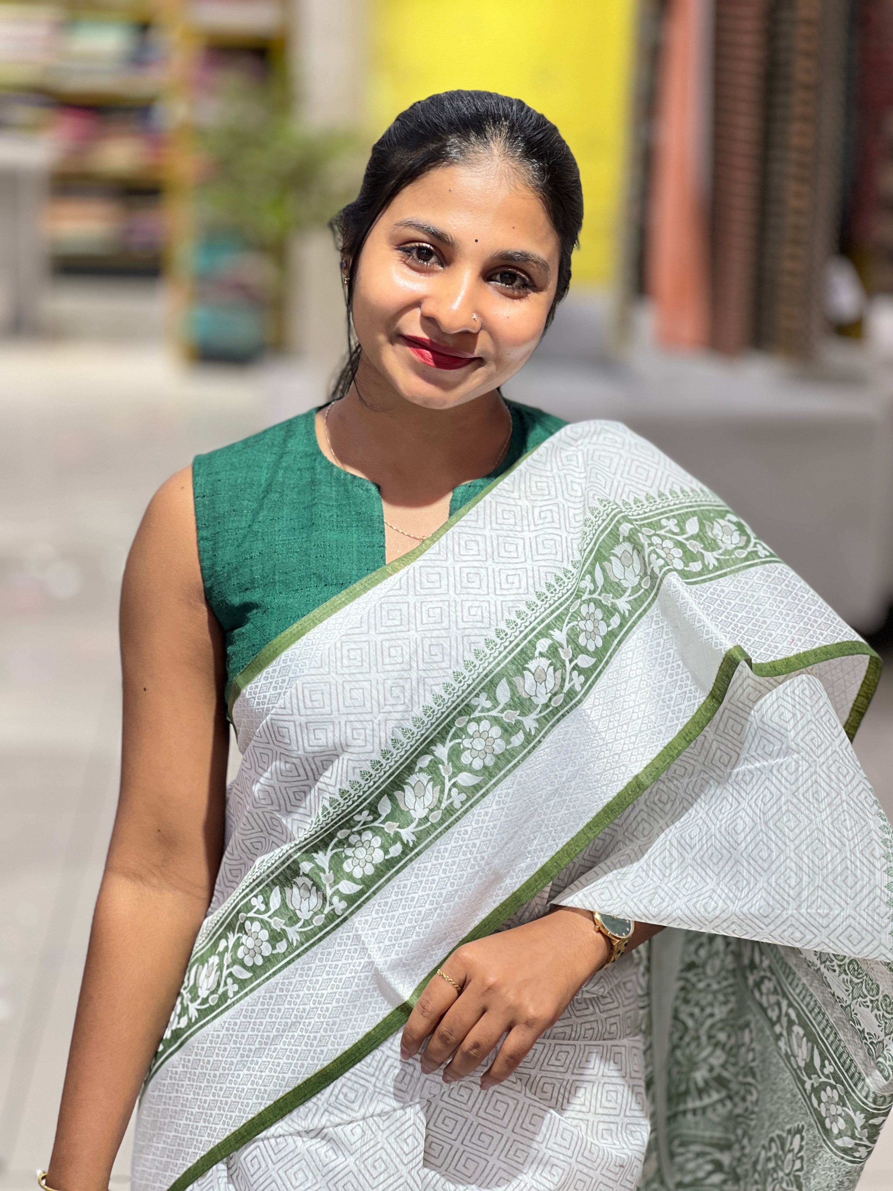 - Style: Screen Printed, Printed Pallu, Thread Weaved Border Detailing, Geometric Printed Pattern