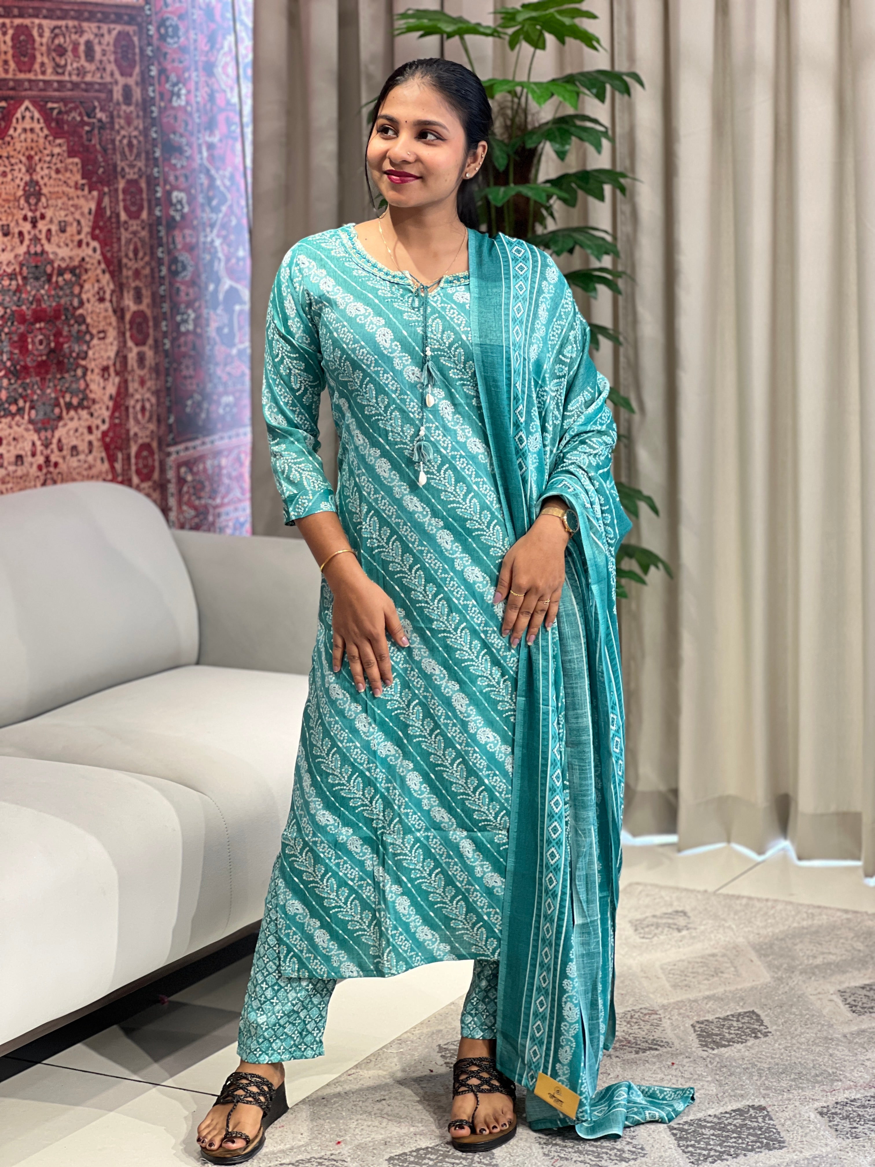 • Style: Printed, Kantha and Sequence Highlighting, Slited Pattern, Tie Detailing and Handwork Detailing on Neck