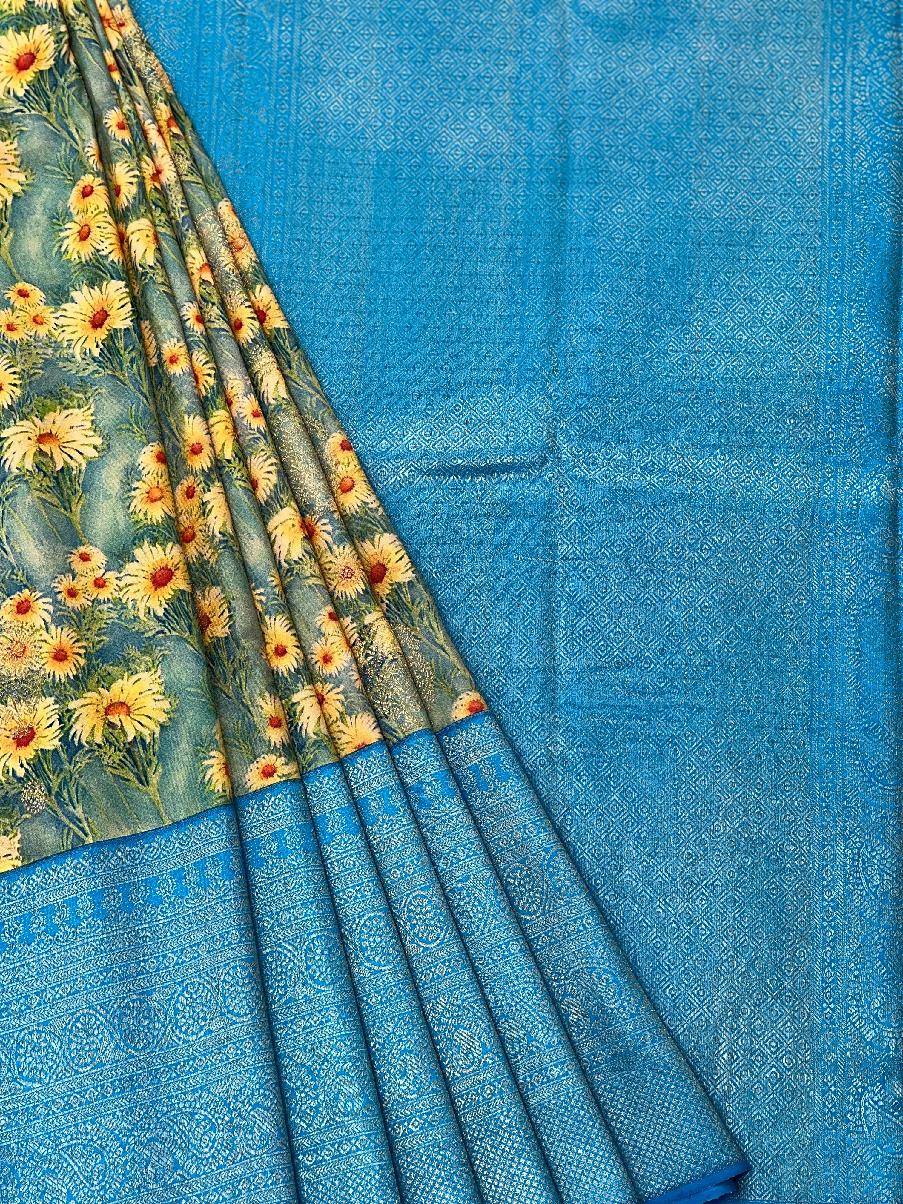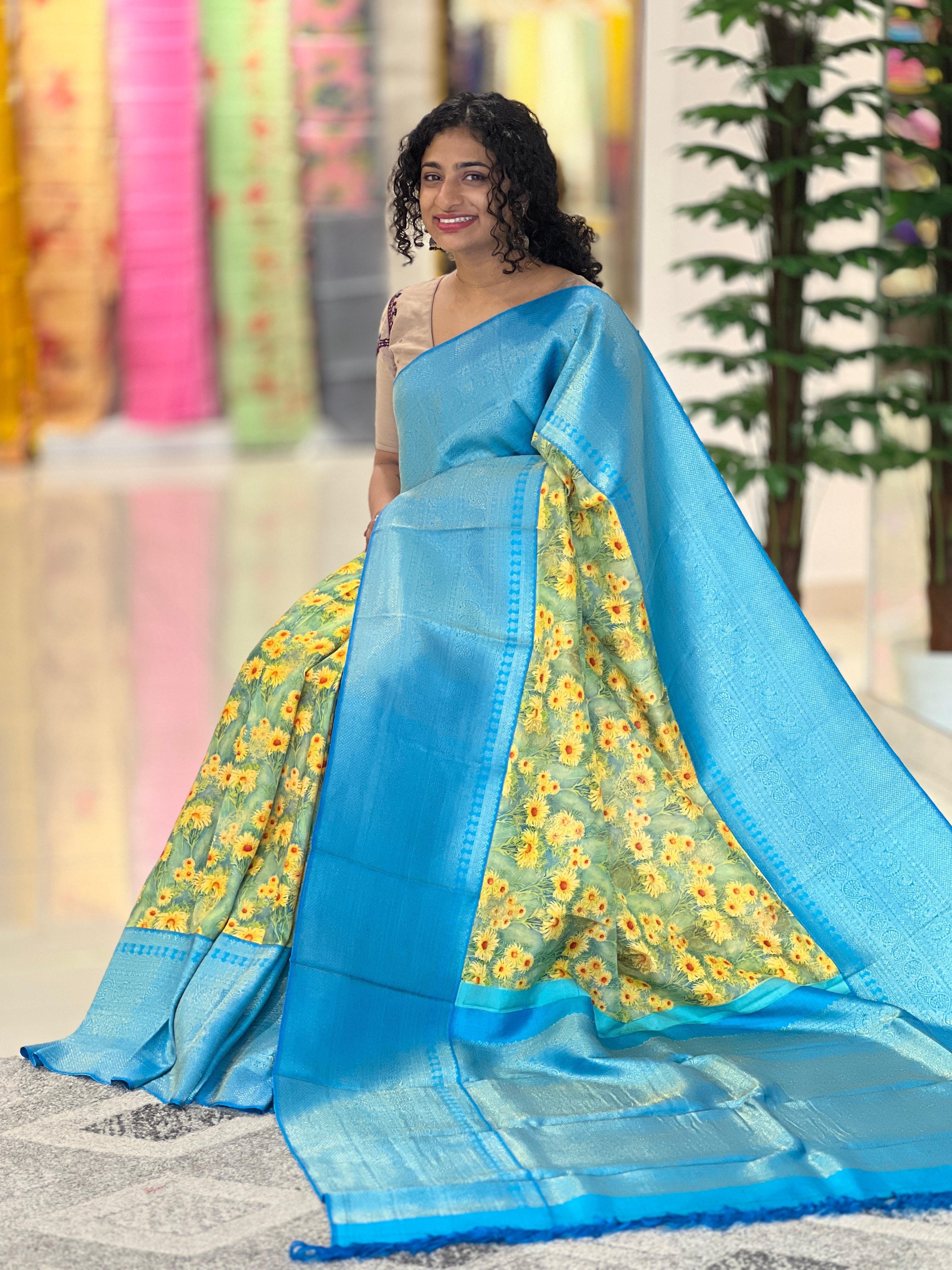 - Style: Floral Printed Design, Traditional Pallu & Border Pattern, Golden Zari Weaving