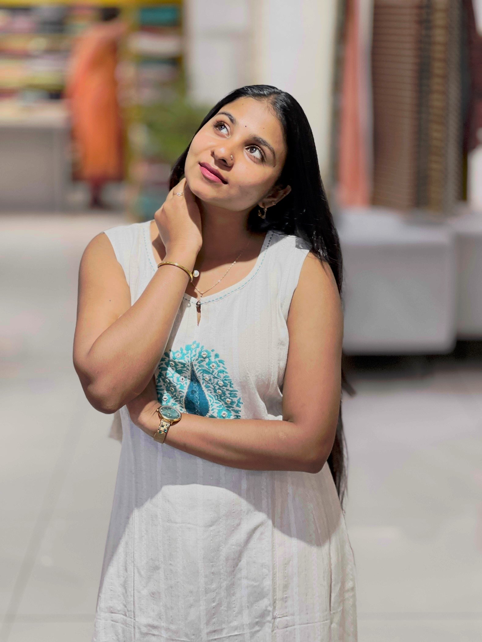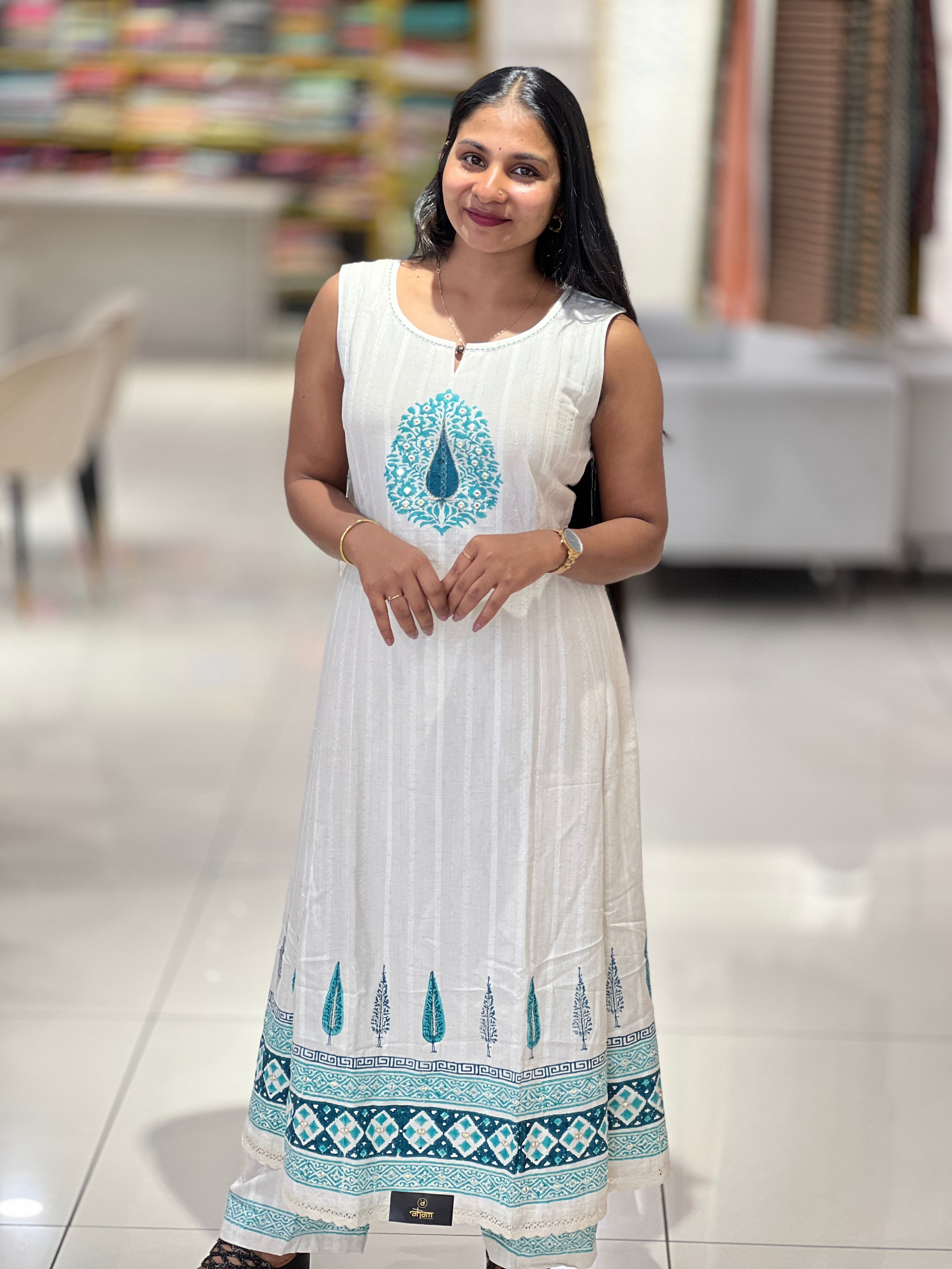- Style: Printed, Mirror Detailing on Yoke, Silver Zari Detailing, A-Line Pattern