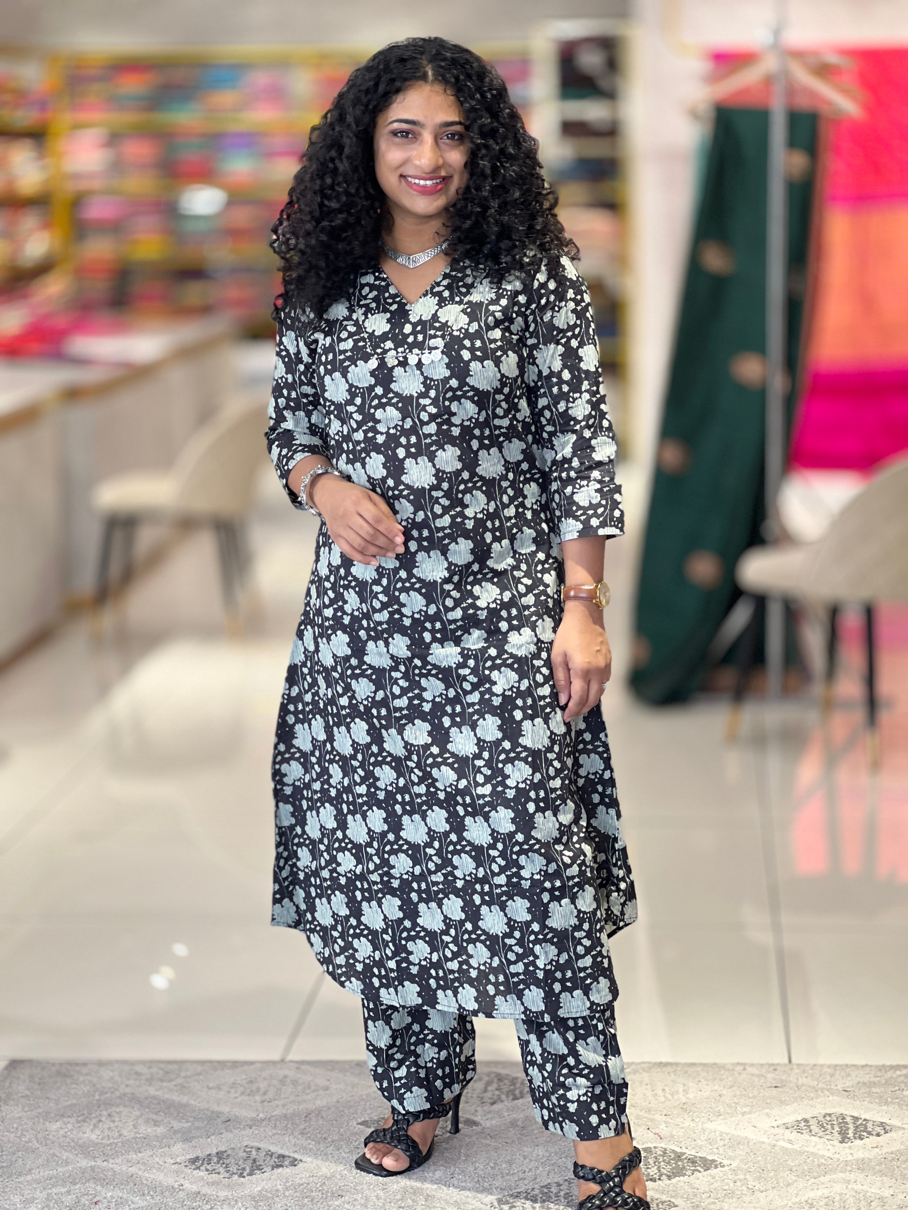 - Style: Printed , A-Line Pattern, Silver Coin Detailing, Hand Kantha & Sequence Highlight, With Pockets