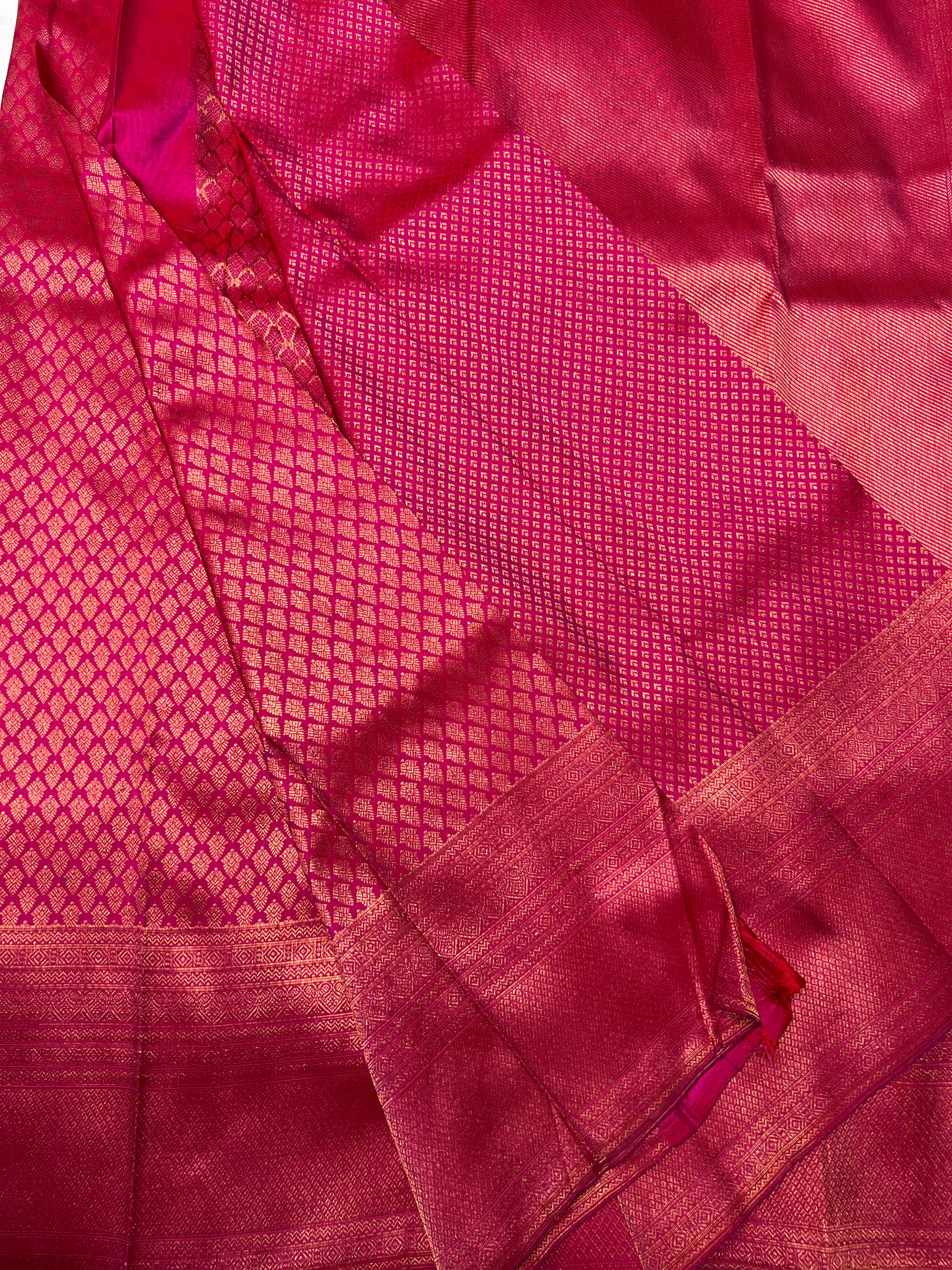 Reddish pink colour Traditional Kanchipuram saree having diamond shape jal weaving zari buttas throughout the body portion of the saree, rich floral pattern weaved pallu portion. The saree is paired with a diamond pattern woven blouse piece.