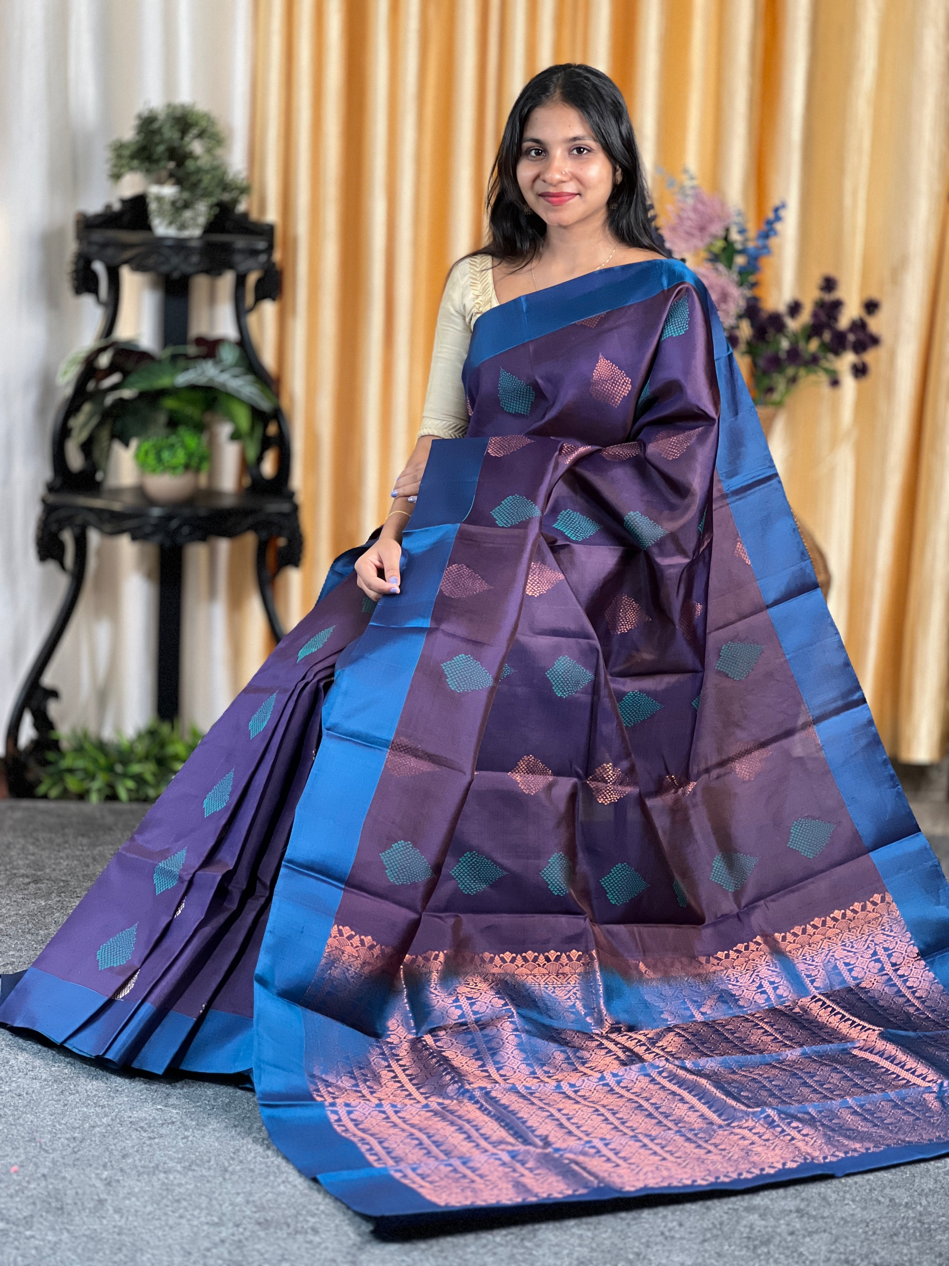 - Style: Zari Woven Traditional Butas, Geometric Patterned Pallu, Contrast Borders
